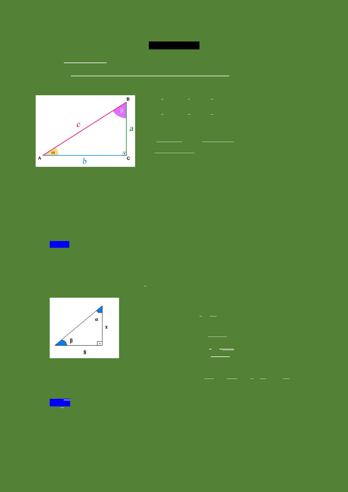 @Prof.eduardo.mat Prof: Eduardo Goudart Relações Trigonométricas num triângulo retângulo: 𝑆𝑒𝑛 𝛼 = 𝑎 𝑐 , 𝐶𝑜𝑠 𝛼 = 𝑏 𝑐 , 𝑇𝑔 𝛼 = 𝑎 𝑏 𝑆𝑒𝑛 𝛽 = 𝑏 𝑐 , 𝐶𝑜𝑠 𝛽 = 𝑎 𝑐 , 𝑇𝑔 𝛽 = 𝑏 𝑎 De forma geral: SOH CAH TOA 𝑆𝑒𝑛 = 𝑐𝑎𝑡𝑒𝑡𝑜 𝑜𝑝𝑜𝑠𝑡𝑜 ℎ𝑖𝑝𝑜𝑡𝑒𝑛𝑢𝑠𝑎 , 𝐶𝑜𝑠 = 𝑐𝑎𝑡𝑒𝑡𝑜 𝑎𝑑𝑗𝑎𝑐𝑒𝑛𝑡𝑒 ℎ𝑖𝑝𝑜𝑡𝑒𝑛𝑢𝑠𝑎 𝑇𝑔 = 𝑐𝑎𝑡𝑒𝑡𝑜 𝑜𝑝𝑜𝑠𝑡𝑜 𝑐𝑎𝑡𝑒𝑡𝑜 𝑎𝑑𝑗𝑎𝑐𝑒𝑛𝑡𝑒 Obs.: Observando o triângulo acima temos que 𝛼 + 𝛽 + 90º = 180º ∴ 𝛼 + 𝛽 = 90º Ou seja, 𝛼 𝑒 𝛽 são ângulos complementares, agora observe que 𝑆𝑒𝑛 𝛼 = 𝐶𝑜𝑠 𝛽 e que 𝑆𝑒𝑛 𝛽 = 𝐶𝑜𝑠 𝛼. Isso sempre irá acontecer quando tivermos dois ângulos complementares. . Exemplo 1: Se a + b = 90º e sen a = k – 3, podemos afirmar que cos b é igual a: a) k – 1 b) k – 3 a + b = 90 -> Sen a = Cos b também Sem b = Cos a c) k Sem a = k – 3, Cos b = Sem a = k – 3 d) 0 e) -1 . Exemplo 2: Sabendo que 𝑆𝑒𝑛 𝛼 = 1 2 , calcule o valor de x na figura abaixo. Resolução: 𝑆𝑒𝑛𝛼 = 1 2 = 8 𝐻𝑖𝑝 Hip² = x² + 8² -> Hip² = 64 + x² 𝐻𝑖𝑝 = √64 + 𝑥² 𝑆𝑒𝑛𝛼 = 1 2 = 8 √64+𝑥² √64 + 𝑥² = 16 → 64 + 𝑥2 = 196 64 + x² = 196 X² = 132 a) 4 𝑥 = √132 = √4.33 = √4. √33 = 2. √33 b)16 c) 8 d) 2√33 e) √3 . Exemplo 3: O cosseno do menor ângulo interno de um triângulo retângulo é √3/2. Se a medida da hipotenusa desse triângulo é 4 unidades, então é verdade que um dos catetos desse triângulo mede, na mesma unidade, a) 1 𝐶𝑜𝑠 𝛼 = 𝐶𝑂 4 = √3 2 𝐶𝑂 = 4√3 2 = 2√3 b) √3 4² = (2√3)² + x² 16 = 12 + x² c) 2 4 = x² 2 = x d) 3 e) √3/3 . Exemplo 4: Na figura a seguir, o segmento BD é perpendicular ao segmento AC. AC = AD + DC, AB = 100 AD -> Adjacente a 40º 𝐶𝑜𝑠 40 = 𝐴𝐷 𝐴𝐵 = 766 1000 = 𝐴𝐷 100 AD = 76,6 DC -> Oposto a 52º, 𝑆𝑒𝑛 52 = 𝐷𝐶 𝐵𝐶 , 𝑇𝑔 52 = 𝐷𝐶 𝐵𝐷 𝑆𝑒𝑛 40º = 643 1000 = 𝐵𝐷 100 -> BD = 64,3 𝑇𝑔 52º = 1280 1000 = 𝐷𝐶 64,3 -> 64,3.1280 1000 = 𝐷𝐶 -> 82304 1000 = 𝐷𝐶 -> DC = 82,304 Se AB = 100m, um valor aproximado para o segmento DC é: a) 76m. b) 62m. c) 68m. d) 82m. e) 90m. . Exemplo 5: A plateia de um teatro, vista de cima para baixo, ocupa o retângulo ABCD da figura a seguir, e o palco é adjacente ao lado BC. As medidas do retângulo são AB = 15m e BC = 20m. 𝐶𝑜𝑠𝛼 = 𝐴𝐵 𝐴𝐶 → 15 𝐴𝐶 AC² = 20² + 15º -> AC² = 400 + 225 -> AC² = 625, AC = 25 Catetos: 3.5 e 4.5, Hip: 5.5 = 25 𝐶𝑜𝑠𝛼 = 𝐴𝐵 𝐴𝐶 → 15 𝐴𝐶 = 15 25 = 3 5 = 0.6 Um fotógrafo que ficará no canto A da plateia deseja fotografar o palco inteiro e, para isso, deve conhecer o ângulo da figura para escolher a lente de abertura adequada. O cosseno do ângulo da figura acima é: a) 0,5 b) 0,6 c) 0,75 d) 0,8 e) 1,33 - Ângulos Notáveis: Ângulos Seno Cosseno Tangente 30º 1 2 √3 2 √3 3 45º √2 2 √2 2 1 60º √3 2 1 2 √3 . Exemplo 6: Duas ferrovias se cruzam segundo um ângulo de 30°. Em km, a distância entre um terminal de cargas que se encontra numa das ferrovias, a 4 km do cruzamento, e a outra ferrovia, é igual a: a) 2√3 d -> oposta a 30º, Sem ou Tg b) 2 𝑡𝑔30º = √3 3 = 𝑑 4 → 𝑑 = 4√3 3 c) 8 d) 4√3 3 e) √3 . Exemplo 7: Uma pessoa encontra-se num ponto A, localizado na base de um prédio, conforme mostra a figura adiante. Se ela caminhar 90 metros em linha reta, chegará a um ponto B, de onde poderá ver o topo C do prédio, sob um ângulo de 60°. Quantos metros ela deverá se afastar do ponto A, andando em linha reta no sentido de A para B, para que possa enxergar o topo do prédio sob um ângulo de 30°? 𝑡𝑔 30 = 𝐻 𝑥+90 = √3 3 𝑡𝑔 60 = 𝐻 90 = √3 → 𝐻 = 90√3 90√3 𝑥+90 = √3 3 → 90 𝑥+90 = 1 3 → 180 = 𝑥 + 90 ∴ 𝑥 = 90 a) 150 b) 180 c) 270 d) 300 e) 310 . Exemplo 8: Um barco parte de A para atravessar o rio. A direção de seu deslocamento forma um ângulo de 120° com a margem do rio. Sendo a largura do rio 60 m, a distância, em metros, percorrida pelo barco foi de. 𝑆𝑒𝑛 60º = √3 2 = 60 𝑥 → √3𝑥 = 120 → 𝑥 = 120 √3 . √3 √3 = 120√3 3 = 40√3 a) 40√2 b) 40√3 c) 45√3 d) 50√3 e) 60√2