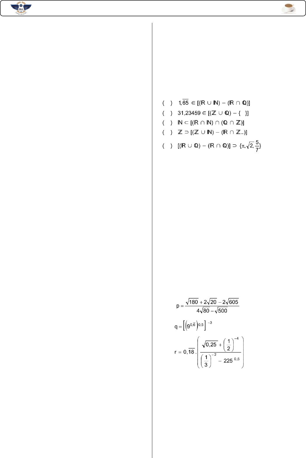 EPCAR/CN/PAS ARITMÉTICA #01 Professor Luiz Henrique Nível: 01. Das afirmativas abaixo: 1 – o número 1 é primo 2 – o número zero é primo 3 – o número 1 é composto 4 – o número 2 é primo a) apenas uma é verdadeira; b) apenas três são verdadeiras; c) todas são falsas; d) apenas duas são verdadeiras; e) todas são verdadeiras; 02. Qual é o maior número inteiro que podemos somar ao dividendo de uma divisão, onde o divisor é 13 e o resto é 2, sem que o quociente sofra alteração? a) 13 b) 12 c) 11 d) 10 e) 17 03. Ao se somar o resto de uma subtração ao minuendo e ao subtraendo desta mesma subtração encontrou-se 222. Qual será a soma do subtraendo com o resto? a) 347 b) 180 c) 111 d) 132 e) 123 04. Multiplique 19 horas 27 minutos e 15 segundos por 6: a) 114 horas 42 minutos e 30 segundos b) 115 horas 43 minutos e 30 segundos c) 120 horas 23 minutos e 59 segundos d) 116 horas 43 minutos e 30 segundos e) 115 horas 43 minutos e 20 segundos 05. Assinale a afirmativa falsa: a) Toda fração decimal corresponde a um número decimal que tem um número finito de algarismo na sua parte decimal. b) Fração decimal não é a mesma coisa que número decimal. c) Toda fração decimal pode ser escrita, sem o denominador. d) O número decimal possui uma parte inteira e outra denominada decimal. e) A todo número decimal corresponde a uma fração decimal. 06. Qual o menor número inteiro que multiplicado pelo seu consecutivo dá como produto 156? a) –12 b) 12 c) 13 d) –13 e) 21 07. Um agricultor tinha 2 ½ pilhas de feno numa fila e 3 ½ pilhas de feno em outra. Depois de juntar todas as pilhas de feno, com quantas ele ficou? a) 2 ½ pilhas de feno b) 1 pilha de feno c) 6 pilhas de feno d) 3 ½ pilhas de feno e) ½ pilha de feno 08. Quantos meses do ano têm 28 dias? a) 1 b) 3 c) 6 d) 9 e) 12 09. (EPCAR) Analise as sentenças abaixo marcando (V) para verdadeiro e (F) para falso. A sequência correta é a) F, V, V, V, F c) V, V, F, V, V b) V, F, V, F, V d) F, F, V, F, F 10. (EPCAR) Assinale a alternativa correta. a) Se x ϵ N, y ϵ N e x ≠ y ≠ 1 e se x e y são divisíveis por p, então p é o máximo divisor comum de x e y. b) O máximo divisor comum de dois números naturais divide o seu mínimo múltiplo comum. c) Se x e y são números primos, com x > y > 2, o máximo divisor comum de x e y é igual a x. d) Se o conjunto dos múltiplos do número natural x é subconjunto do conjunto dos múltiplos do número natural y, então x não é múltiplo de y. 11. (EPCAR) Considere os números p, q e r abaixo: Se x é o número obtido pelo produto entre p, q e r, então x é um número a) irracional positivo. c) racional negativo. b) irracional negativo. d) racional positivo. EPCAR/CN/PAS ARITMÉTICA #01 Professor Luiz Henrique Nível: 12. (EPCAR) O valor da expressão 2 1 3 1 2 4 1 2 10x4,6 10x25,6 é a) 5 c) 3 b) 5 5 d) 7 13. (EPCAR) Analise as proposições, classificando-as em (V) verdadeiras ou (F) falsas. A sequência correta é a) F, V, F c) V, F, F b) V, F, V d) F, V, V 14. (EPCAR) Sabendo-se que a, b, c, d representam algarismos maiores que zero e que a < b e c < d, então, 15. (EPCAR) Numa avenida que mede 15750 metros, a partir do início, a cada 250 m há uma parada de ônibus e a cada 225 m uma de bonde. A quantidade de pontos comuns de parada de ônibus e bonde é dada por um número do intervalo a) [41, 65] c) [26, 40] b) [66, 80] d) [0, 25] 16. (EPCAR) O produto de um número inteiro A de três algarismos por 3 é um número terminado em 721. A soma dos algarismos de A é a) 15 b) 16 c) 17 d) 18 17. (EPCAR) Um número de três algarismos a, b e c, nessa ordem, (a > c) é tal que, quando se inverte a posição dos algarismos a e c e subtrai-se o novo número do original, encontra-se, na diferença, um número terminado em 4. Essa diferença é um número cuja soma dos algarismos é a) 16 b) 17 c) 18 d) 19 18. (EPCAR) Na figura abaixo estão representados os números reais 0, a, b e 1. É FALSO afirmar que a) b 1 a 1 c) 1 a b b) ab.a d) 0ba 19. (EPCAR) Um ônibus percorre, na estrada, 9 km com 1 litro de combustível. O motorista desse ônibus realizou uma viagem de 551 km. Ao sair do local de origem da viagem, o ponteiro marcador de combustível do ônibus indicava 6/8 do tanque. Após o motorista percorrer 225 km, o ponteiro marcador de combustível do ônibus indicou 1/2 do tanque. Com base nessa situação, é correto afirmar que, ao chegar no destino proposto, a quantidade de combustível restante no tanque do ônibus estava entre a) 11 e 12 litros. c) 13 e 14 litros. b) 12 e 13 litros. d) 14 e 15 litros. 20. (EPCAR) Há dois anos Letícia tinha 1/6 da idade que seu pai tem hoje. Daqui a um ano Letícia terá 1/4 da idade atual de sua mãe. Hoje a soma das idades dos três é igual ao menor número natural de três algarismos distintos divisível por 3. Os irmãos gêmeos de Letícia têm hoje a metade da idade que Letícia terá daqui a oito anos. Atualmente, a soma das idades dos três irmãos é a) 24 b) 26 c) 28 d) 30 21. Joãozinho brinca de formar quadrados com palitos de fósforo como na figura a seguir. A quantidade de palitos necessária para fazer 100 quadrados é: a) 296 b) 293 c) 297 d) 301 e) 28 EPCAR/CN/PAS ARITMÉTICA #01 Professor Luiz Henrique Nível: 22. Um número inteiro n é bom quando 4n + 1 é um múltiplo de 5. Quantos números bons há entre 500 e 1.000? a) 50 b) 51 c) 100 d) 101 e) 102 23. Em uma calculadora, a tecla A transforma o número x que está no visor em 1/x e a tecla B multiplica por 2 o número que está no visor. Se o número 2 está no visor e digitamos a sequência ABABABAB...AB (total de digitações: 998), obteremos no visor um número que é igual a: a) 1 b) 2–498 c) 2–500 d) 2499 e) 2500 24. 0,4444... a) 0,2222… b) 0,3333… c) 0,4444… d) 0,5555… e) 0,6666… 25. A dízima periódica simples 0,024024… pode ser escrita como: a) 24/99 b) 24/999 c) 240/299 d) 24/1000 e) 240/1000 26. Dada a dízima peri
