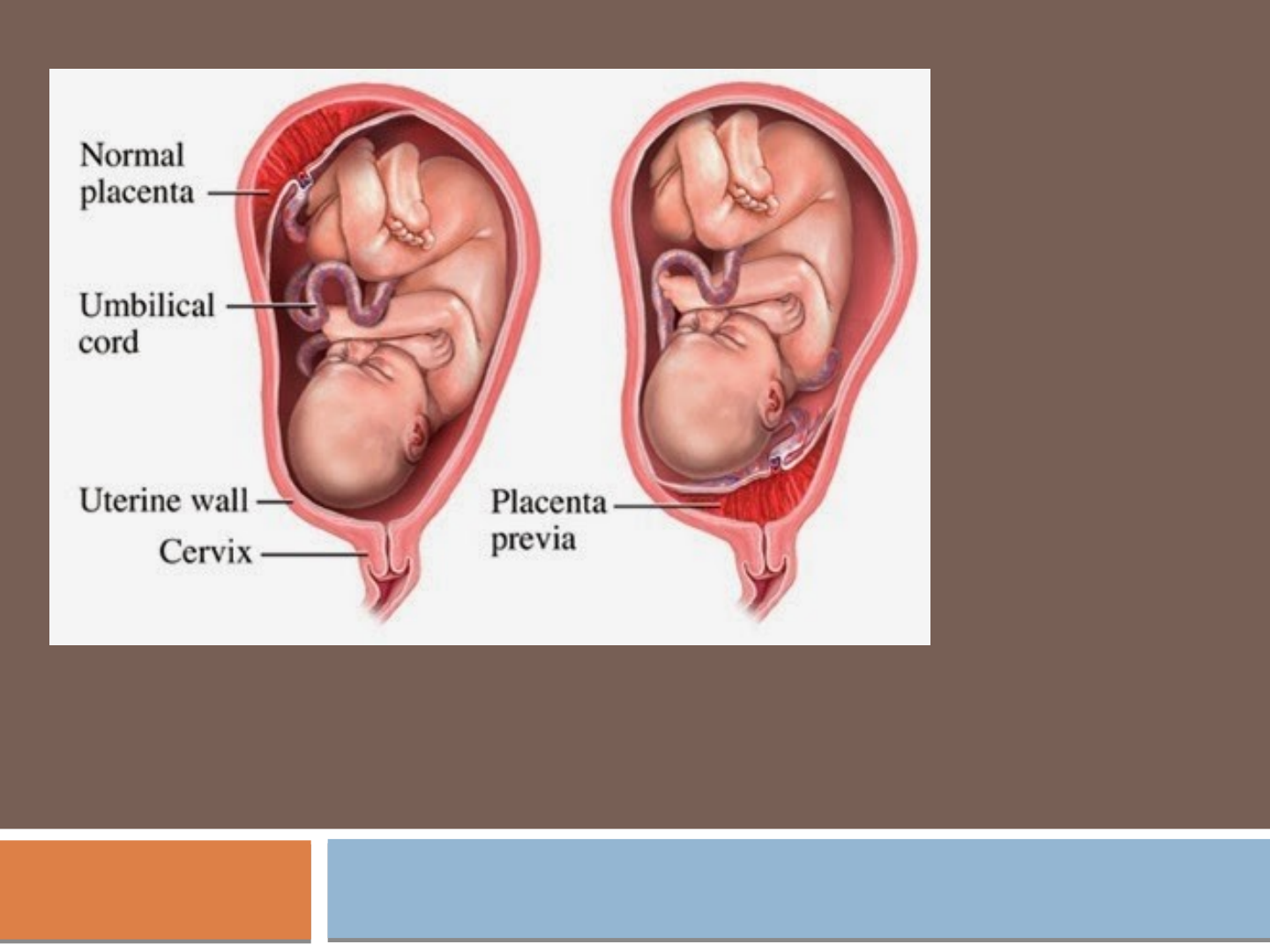 Placenta Prévia Saúde da Mulher e RN CONCEITO Definida como a placenta que se implanta total ou parcialmente no segmento inferior do útero. Ela pode ser classificada de três maneiras, de acordo com sua posição em relação ao colo do útero. Parcial Marginal Completa ou centro-total Dizemos que a gestante tem placenta prévia, ou placenta de inserção baixa, quando a sua placenta está posicionada em um local que provoca obstrução total ou parcial do colo do útero, que é efetivamente por onde o bebê precisa passar na hora do parto vaginal. A placenta prévia é, portanto, nada mais do que uma obstrução da saída do útero provocada por uma placenta mal localizada. PARCIAL Está localizada próxima ao colo do útero, sem atingi-lo. MARGINAL Atinge o orifício interno do colo do útero, sem atingi-lo . COMPLETA OU CENTRO-TOTAL Recobre totalmente o orifício interno do colo do útero. EPIDEMIOLOGIA Ocorre em 1 a cada 200 gestações que chegam ao terceiro trimestre, porém é um achado ultrassonográfico frequente em exames realizados entre 16 a 20 semanas de gestação. Até 90% desses achados normalizarão até o termo, devido a teoria da migração placentária. CARACTERÍSTICAS Sangramento indolor; Autolimitado; Final do segundo e início do terceiro trimestre; Presença de sangramento sentinela. FATORES DE RISCO Cesariana prévia Principal Fator de risco; Intervenções uterinas anteriores (miomectomia, curetagem); Multiparidade/Intervalo interpartal curto; Tabagismo; Gemelaridade. CAUSAS No entanto, os tipos persistentes de placenta prévia têm sido associados com: Cicatrizes do revestimento do útero, como aquelas formadas em cirurgias; Placentas grandes, como aquelas formadas em gestações múltiplas; Mulheres que tem 35 anos ou mais durante a gravidez; Histórico pessoal de placenta prévia. FISIOPATOLOGIA Descolamento; - Sangramento retroplacentário; - Infiltração na parede uterina; - Irritação das células miometrais; - Hipertonia miometral; - Aumento do consumo de oxigênio; – Hipóxia; - Diminuição da contratilidade uterina; - Hipotonia Uterina; DIAGNÓSTICO Ultrassonografia abdominal (Pode ser também via transvaginal); Exame de ecodoppler obstétrico; Ressonância nuclear; CONDUTA No pré-natal recomenda-se que a gestante com placenta prévia seja encaminhada a um centro de referência. A conduta nos casos de placenta prévia vai depender de alguns aspectos: Quantidade do sangramento e condição hemodinâmica materna; Idade gestacional; Se a gestante estiver no termo ou próxima a ele e tiver sangramento, o parto deve ser realizado; O risco de hemorragia pós-parto também aumenta em consequencia a uma menor contratilidade do segmento inferior do útero devida a invasão trofoblástica. O uso de corticoterapia; O uso de suplementação de ferro no pré-natal; SISTEMATIZAÇÃO DA ENFERMAGEM Diagnóstico de enfermagem: Risco de Choque; Ansiedade ANSIEDADE Ansiedade relacionado a ameaça ao estado de saúde, evidenciado por preocupações expressas em razão a mudanças em eventos da vida. Intervenções de enfermagem: Oferecer apoio psicológico; Estabelecer com a paciente uma relação de confiança; Observar e anotar estado de consciência; - Oferecer informações reais sobre diagnóstico, tratamento e prognóstico; Orientar a paciente quanto ao uso de técnicas de relaxamento; Resultados esperados: -Demonstrará habilidades necessárias para solucionar problemas. - Parecerá relaxado e a ansiedade atenuada a um nível suportável; RISCO DE CHOQUE Risco de choque relacionado a sangramento; Intervenções de enfermagem: Verificar sinais vitais e perfusão periférica; Controlar sangramento; Atentar para o nível de consisência; Acompanhamento pré-natal cuidadoso; Resultados esperados: Controle do sangramento; Sinais vitais em parâmetros normais; Referência Bibliográfica DOENGES, E; MOORHOUSE,M F. Diagnósticos de enfermagem: intervenções, prioridade e fundamentos. Rio de Janeiro: Guanabara Koogan, 2010. Diagnósticos de enfermagem da NANDA: definições e classificação 2012/2014 North American NursingDiagnosisAssociation: tradução Regina Machado Garcez. Porto Alegre: Artmed, 2012.
