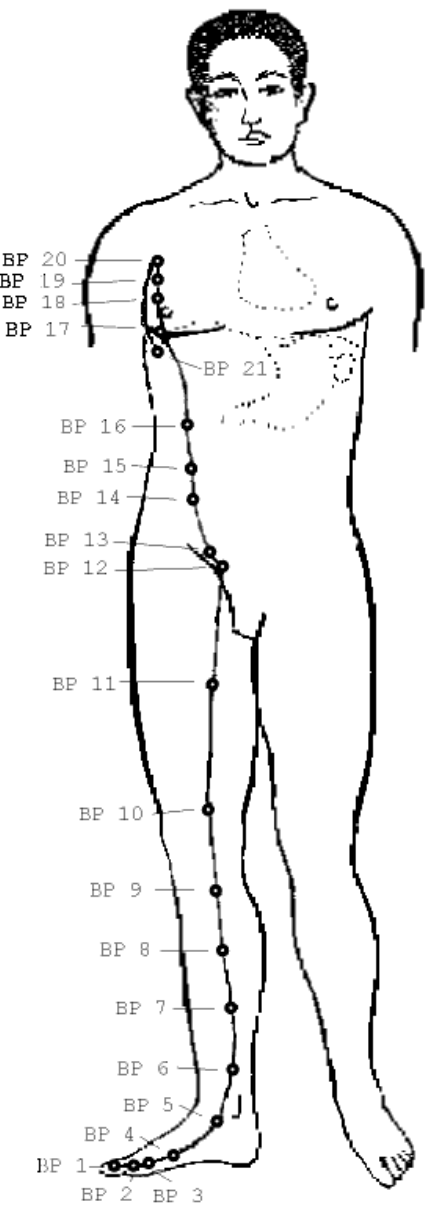 MERIDIANO DO BAÇO-PÂNCRES O meridiano inicia no canto interno da unha do primeiro dedo do pé, a partir daí sobe pelo pé (no limite entre a planta e o peito) seguindo pelo bordo posterior da tíbia passa pela parte interno do joelho e segue pela parte anterior da face interna da coxa, chegando até a virilha. Daí se liga com o ponto VC4 e continua subindo lateralmente no abdômen e face lateral do tórax até o segundo espaço intercostal, onde desce terminado no sétimo espaço intercostal na linha axilar. Órgão- Yin Horário- 9-11 horas Ponto Mo- F14 Ponto Beishu- B20 Total de Pontos- 21 Desequilíbrio Energético- desnutrição, palidez, diarréia, fraqueza muscular, anemia, dificuldade de concentração. Excesso de QI: icterícia, distensão do abdômen, dor nas articulações. Deficiência de Qi: Inapetência, disenteria, vômitos, indigestão, fraqueza. BP1 Localização- leito ungueal medial do hálux. Função- depressão, insônia, hemorragias e hemorróidas. BP2 Localização-anterior a articulação metatarsofalangeana do 1º dedo do pé. Função- falta de concentração, agitação, reumatismo - Ponto de Tonificação BP4 Localização- no meio do 1º metatarso na mudança de cor da pele. Função- forma o vaso maravilhoso que trata patologias emocionais se usado com CS6. BP5 Localização- a frente do medial. Função- depressão, pesadelos, varizes-Ponto de Sedação. BP6 Localização-3 tsun acima do maléolo medial, margem medial da tíbia. Função- Ponto abortivo (Cuidado), utilizado para impotência menstruação irregular. BP9 Localização- inferior ao côndilo medial da tíbia. Função- artrite de joelho. BP13 Localização- 3 tsun lateral a sínfise púbica. Função-Indigestão e colite. BP19 Localização- no terceiro espaço intercostal, 6 tsun da linha média. Função- insônia e distúrbios digestivos. BP21 Localização- 3 tsun abaixo da linha axilar média. Função- dispnéia e afecções gástricas MERIDIANO DO ESTÔMAGO Inicia-se na margem infra-orbital, desce pela face, penetra na gengiva da maxila e contorna os lábios. Segue para a mandíbula contornando-a no sentido ascendente, indo até a região frontal no ponto E8. A partir do ângulo da mandíbula, desce, no sentido Antero-lateral do pescoço, segue em direção ao tórax percorre anteriormente o abdome até a região inguinal. Segue pela face Ântero-lateral da coxa e da perna, dorso do pé, terminando no leito ungueal lateral do segundo dedo do pé. Víscera- Yang Horário- 7-9 horas Ponto Mo- VC12 Ponto Beishu- B21 Total de Pontos- 45 Desequilíbrio Energético- distensão abdominal, arrotos, indigestão, dor ao longo do meridiano, vômitos. Excesso de QI: fome freqüente, distensão do abdômen, dor nas pernas e joelhos. Deficiência de Qi: Inapetência, disenteria, paralisia facial, suspiros e bocejos. E1 Localização- no bulbo ocular, linha da pupila. Função- patologias oculares. E3 Localização- no cruzamento da linha horizontal inferior da asa do nariz com a linha vertical da pupila. Função- paralisia facial, nevralgia do trigêmeo. E6 Localização- sobre o m. masseter. Função- analgesia dentária e disfunções da ATM. E9 Localização- anterior ao esternocleidomastóideo, na linha da cartilagem tireóidea. Função- regula pressão arterial, afonia, amigdalite. E14 Localização- 1º espaço intercostal 4 tsun da linha média. Função- Ponto tranqüilizante, asma, bronquite E21 Localização- 4 tsun acima do umbigo e dois lateral em relação a linha média. Função- gastrites, todas as patologias do estômago. E25 Localização- 2 tsun lateral ao umbigo Função- cólicas intestinais, obstipação E36 Localização- 1.5 tsun medial e 1 tsun abaixo da cabeça da fíbula Função- indicado para quase todas as patologias E41 Localização- na prega do tornozelo em cima dos tendões maiores. Função- agitação, anorexia, vômitos, dores na perna. E45 Localização- leito ungueal lateral do 2º dedo do pé. Função- pesadelos, inapetência, faringite e disenteria.