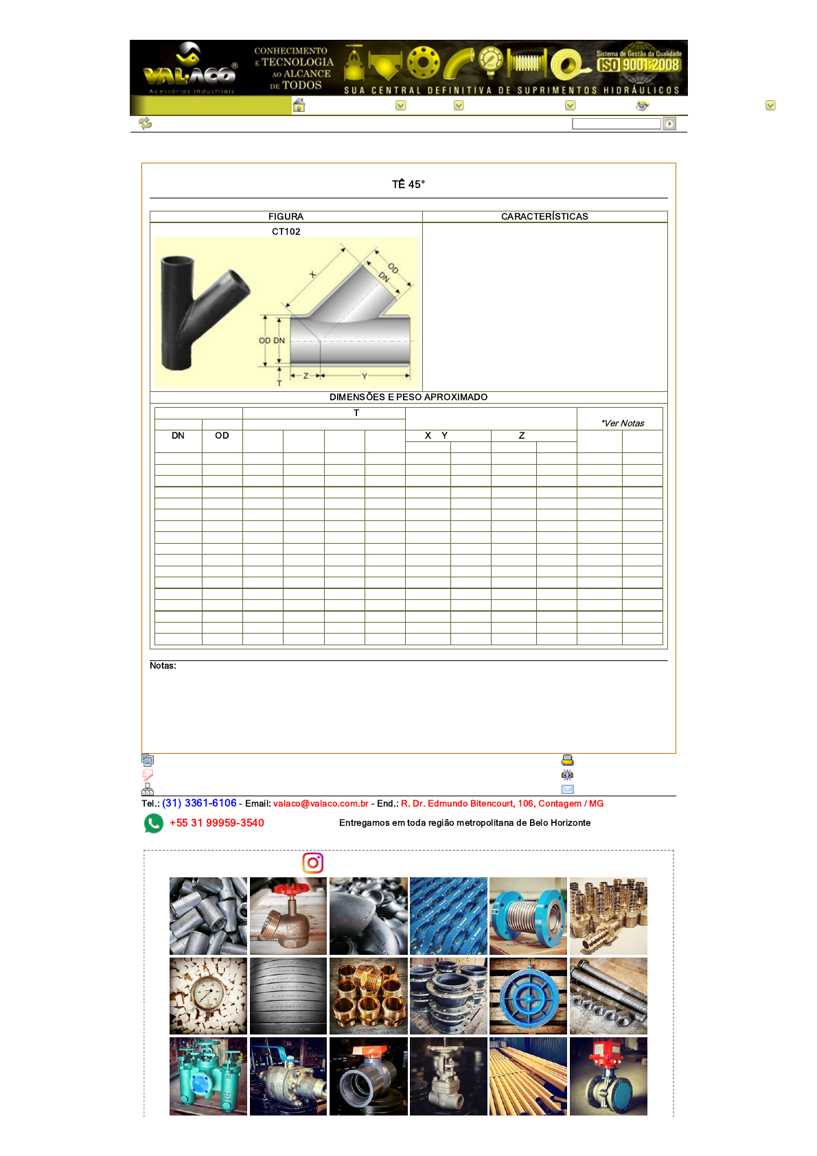 01/10/2019 Tê 45 graus norma ANSI B16.9 solda de topo schedule sch standard std 40 80 XS 160 XXS em aço carbono ASTM A234 Gr. WP… www.valaco.com.br/produtos/conexoes_tb_te_45.html 1/2 Tudo flui bem com a Val Aço! Termos de Uso | Nota Legal | Política de Privacidade | Procurar: :: Home » Produtos » Conexões » Tubular » Tê 45° TÊ 45° FIGURA CARACTERÍSTICAS CT102 • Dimensões conforme ANSI B 16.9; • Material conforme indicações de materiais para conexões: - Aço Carbono ASTM A 234 Gr. WPB; - Aço Inoxidável AISI 304 ou 304L; - Aço Inoxidável AISI 316 ou 316L; - Outras Ligas; • Extremidades biseladas para solda de topo; • Com costura aparente ou removida. DIMENSÕES E PESO APROXIMADO Diâmetro Espessura da Parede T (mm) Centro a Face Peso Aproximado(kg) *Ver Notas (1)Nominal Externo Schedule DN (pol.) OD (mm) Standard 40 XS 80 X e Y (mm) Z (mm) Standard XS Standard XS Standard XS 1" 33,40 3,38 3,38 4,55 4,55 146,1 165,1 44,5 50,8 0,77 1,14 1.1/4" 42,16 3,56 3,56 4,85 4,85 158,8 184,2 44,5 57,2 1,10 1,75 1.1/2" 48,26 3,68 3,68 5,08 5,08 177,8 215,9 50,8 63,5 1,48 2,47 2" 60,32 3,91 3,91 5,54 5,54 203,2 228,6 63,5 63,5 2,29 3,52 2.1/2" 73,02 5,16 5,16 7,01 7,01 241,3 266,7 63,5 63,5 4,19 6,12 3" 88,90 5,49 5,49 7,62 7,62 254,0 279,4 76,2 76,2 5,71 8,53 4" 114,30 6,02 6,02 8,56 8,56 304,8 342,9 76,2 76,2 9,43 14,88 5" 141,30 6,55 6,55 9,52 9,52 342,9 381,0 88,9 88,9 14,24 22,59 6" 168,30 7,11 7,11 10,97 10,97 368,3 444,5 88,9 101,6 19,23 35,83 8" 219,10 8,18 8,18 12,70 12,70 444,5 520,7 114,3 127,0 34,65 63,50 10" 273,00 9,27 9,27 12,70 15,10 520,7 609,6 127,0 139,7 56,24 91,63 12" 323,80 9,52 10,30 12,70 17,50 622,3 698,5 139,7 152,4 81,64 123,83 14" 355,60 9,52 11,10 12,70 19,00 658,8 787,4 152,4 165,1 98,88 154,22 16" 406,40 9,52 12,70 12,70 21,40 762,0 876,3 165,1 177,8 124,74 196,41 18" 457,20 9,52 14,30 12,70 23,80 812,8 952,5 177,8 203,2 147,87 238,59 20" 508,00 9,52 15,10 12,70 26,30 889,0 1028,7 203,2 215,9 179,62 284,86 24" 609,60 9,52 17,50 12,70 31,00 1028,7 1206,5 228,6 254,0 246,76 400,07 Notas: 1. O peso aproximado é para conexões em Aço Carbono ASTM A 234 Gr. WPB; 2. Veja os Materiais Permitidos para Conexões Tubulares; 3. Veja a Tolerância para Conexões de Solda; 4. Veja a Tabela de Espessura de Tubos e Conexões Tubulares; 5. Para converter unidades de medida acesse a seção de Conversão de Medidas; 6. Veja Resistência à Corrosão dos materiais da conexão; 7. Veja Composição Química e Propriedades Mecânicas dos materiais da conexão. Todos os desenhos e imagens encontrados neste website são para efeito meramente ilustrativo Imprimir esta página Não encontrou o que procurava? Tente a busca avançada ou faça sua solicitação pelo site Reportar link quebrado Visualize o mapa do website para melhor aproveitamento de conteúdo Recomendar este site Tel.: (31) 3361-6106 - Email: valaco@valaco.com.br - End.: R. Dr. Edmundo Bitencourt, 106, Contagem / MG +55 31 99959-3540 Entregamos em toda região metropolitana de Belo Horizonte Siga a @val.aco no Instagram Home Institucional Produtos Informações Técnicas Downloads Contatos Links Website http://www.valaco.com.br/termosdeuso.html http://www.valaco.com.br/notalegal.html http://www.valaco.com.br/privacidade.html http://www.valaco.com.br/index.html http://www.valaco.com.br/produtos/index.html http://www.valaco.com.br/produtos/prod_conexoes.html http://www.valaco.com.br/produtos/conexoes_tb.html http://www.valaco.com.br/inf_tecnicas/siglas.html#ANSI http://www.valaco.com.br/inf_tecnicas/cx_indicacoes.html http://www.valaco.com.br/inf_tecnicas/mat_composicao.html#A234WPB http://www.valaco.com.br/inf_tecnicas/mat_composicao.html#AISI304 http://www.valaco.com.br/inf_tecnicas/mat_composicao.html#AISI316 http://www.valaco.com.br/inf_tecnicas/mat_composicao.html http://www.valaco.com.br/inf_tecnicas/it_solda.html http://www.valaco.com.br/inf_tecnicas/it_espessura.html http://www.valaco.com.br/inf_tecnicas/cx_materiais.html http://www.valaco.com.br/inf_tecnicas/cx_tolconex.html http://www.valaco.com.br/inf_tecnicas/it_espessura.html http://www.valaco.com.br/inf_tecnicas/conversoes.html http://www.valaco.com.br/inf_tecnicas/mat_resistencia.html http://www.valaco.com.br/inf_tecnicas/mat_composicao.html http://www.valaco.com.br/inf_tecnicas/mat_propriedades.html javascript:window.print() javascript:window.print() http://www.valaco.com.br/busca/ http://www.valaco.com.br/nao_encontrei.html http://www.valaco.com.br/reportar.html http://www.valaco.com.br/mapa.html javascript:document.location.href='http://www.valaco.com.br/recomendar.php?pag='+document.location.href mailto:valaco@valaco.com.br https://www.google.com.br/maps/place/Val+a%C3%A7o+Acess%C3%B3rios+Industriais+Ltda/@-19.974214,-44.040627,15z/data=!4m2!3m1!1s0x0:0x4617ed55d9311709?sa=X&ei=zOlcVbmbD5PggwS65oHgDw&ved=0CG0Q_BIwDQ https://api.whatsapp.com/send?phone=553199593540&text=oi https://www.instagram.com/val.aco/ https://www.instagram.com/val.aco/ https://www.instagram.com/p/B27Ycf3lTds/ https://www.instagram.com/p/B2l0ir5lhNT/ https://www.instagram.com/p/B2eIDVTlx_1/ https://www.instagram.com/p/B2FVrhvlw_Q/ https://www.instagram.com/p/B2CZ2ylF0Om/ https://www.instagram.com/p/B1zZMj6l4PG/ https://www.instagram.com/p/B1zMI8zliGd/ https://www.instagram.com/p/B1hMqiKFK25/ https://www.instagram.com/p/B1eS9igFTZJ/ https://www.instagram.com/p/B1YxFVwFDL7/ https://www.instagram.com/p/B1WvIgaFoDd/ https://www.instagram.com/p/B1OWByrFJZM/ https://www.instagram.com/p/B1E9ynyFMJ7/ https://www.instagram.com/p/B0rEoDKl_Qf/ https://www.instagram.com/p/B0gRzyuF7TS/ https://www.instagram.com/p/Bz1CQchlmwZ/ https://www.instagram.com/p/Bzqq9aWFgxA/ https://www.instagram.com/p/BzivXRel5Wc/ http://www.valaco.com.br/ http://www.valaco.com.br/institucional/index.html http://www.valaco.com.br/produtos/index.html http://www.valaco.com.br/inf_tecnicas/index.html http://www.valaco.com.br/downloads.html http://www.valaco.com.br/contatos.html http://www.valaco.com.b