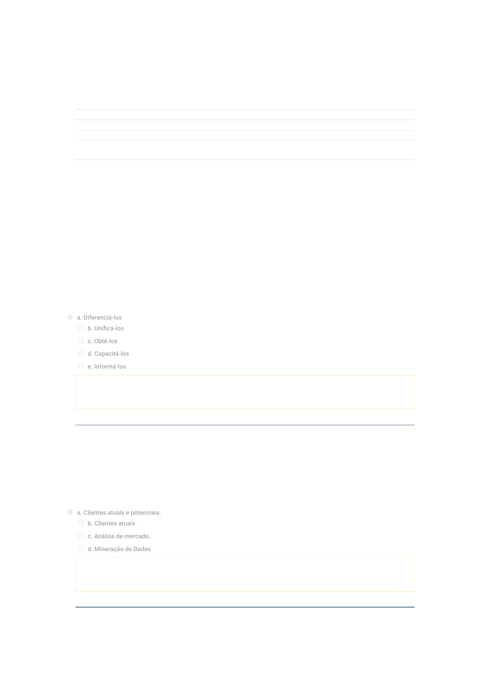 02/06/2020 Exercícios - SDI500-201 - 14: avaliação da tentativa https://faculdadetrevisan.mrooms.net/mod/quiz/review.php?attempt=129250&cmid=23280 1/2 Página inicial / Minhas disciplinas / (SDI500 / EAD / 1º semestre de 2020) SISTEMAS DE INFORMAÇÃO / Aula 14 / Exercícios - SDI500-201 - 14 Iniciado em terça, 2 jun 2020, 20:51 Estado Finalizada Concluída em terça, 2 jun 2020, 20:53 Tempo empregado 2 minutos Avaliar 10,00 de um máximo de 10,00(100%) Questão 1 Correto Atingiu 2,50 de 2,50 Questão 2 Correto Atingiu 2,50 de 2,50 Sistemas de informação do tipo CRM tem como pilares: Identi�car os clientes atuais e potenciais, ______________ com base em suas necessidades e valor para a empresa, interagir com o cliente para conhecido e customizar a experiência do cliente. O termo que melhor completa a lacuna é: Escolha uma: a. Diferenciá-los b. Uni�cá-los c. Obtê-los d. Capacitá-los e. Informá-los Sua resposta está correta. A resposta correta é: Diferenciá-los. O foco principal das aplicações CRM é: Escolha uma: a. Clientes atuais e potenciais. b. Clientes atuais. c. Análise de mercado. d. Mineração de Dados Sua resposta está correta. A resposta correta é: Clientes atuais e potenciais.. https://faculdadetrevisan.mrooms.net/ https://faculdadetrevisan.mrooms.net/course/view.php?id=337 https://faculdadetrevisan.mrooms.net/course/view.php?id=337#section-16 https://faculdadetrevisan.mrooms.net/mod/quiz/view.php?id=23280 02/06/2020 Exercícios - SDI500-201 - 14: avaliação da tentativa https://faculdadetrevisan.mrooms.net/mod/quiz/review.php?attempt=129250&cmid=23280 2/2 Questão 3 Correto Atingiu 2,50 de 2,50 Questão 4 Correto Atingiu 2,50 de 2,50 Em um sistema CRM, associe os processos às áreas: Áreas de atendimento da organização Área de vendas da organização Área de marketing da organização Help Desk Gerenciamento de pedidos Gerenciamento de publicidade Sua resposta está correta. A resposta correta é: Áreas de atendimento da organização → Help Desk, Área de vendas da organização → Gerenciamento de pedidos, Área de marketing da organização → Gerenciamento de publicidade. Um CRM composto por aplicações voltadas ao cliente, como um Call Center, é denominado: Escolha uma: a. Transacional b. Analítico c. Padrão d. Mineração de dados e. Operacional Sua resposta está correta. A resposta correta é: Operacional. ◄ Palavra do Mestre Seguir para... Saiba Mais ► https://faculdadetrevisan.mrooms.net/mod/page/view.php?id=21339&forceview=1 https://faculdadetrevisan.mrooms.net/mod/page/view.php?id=21340&forceview=1