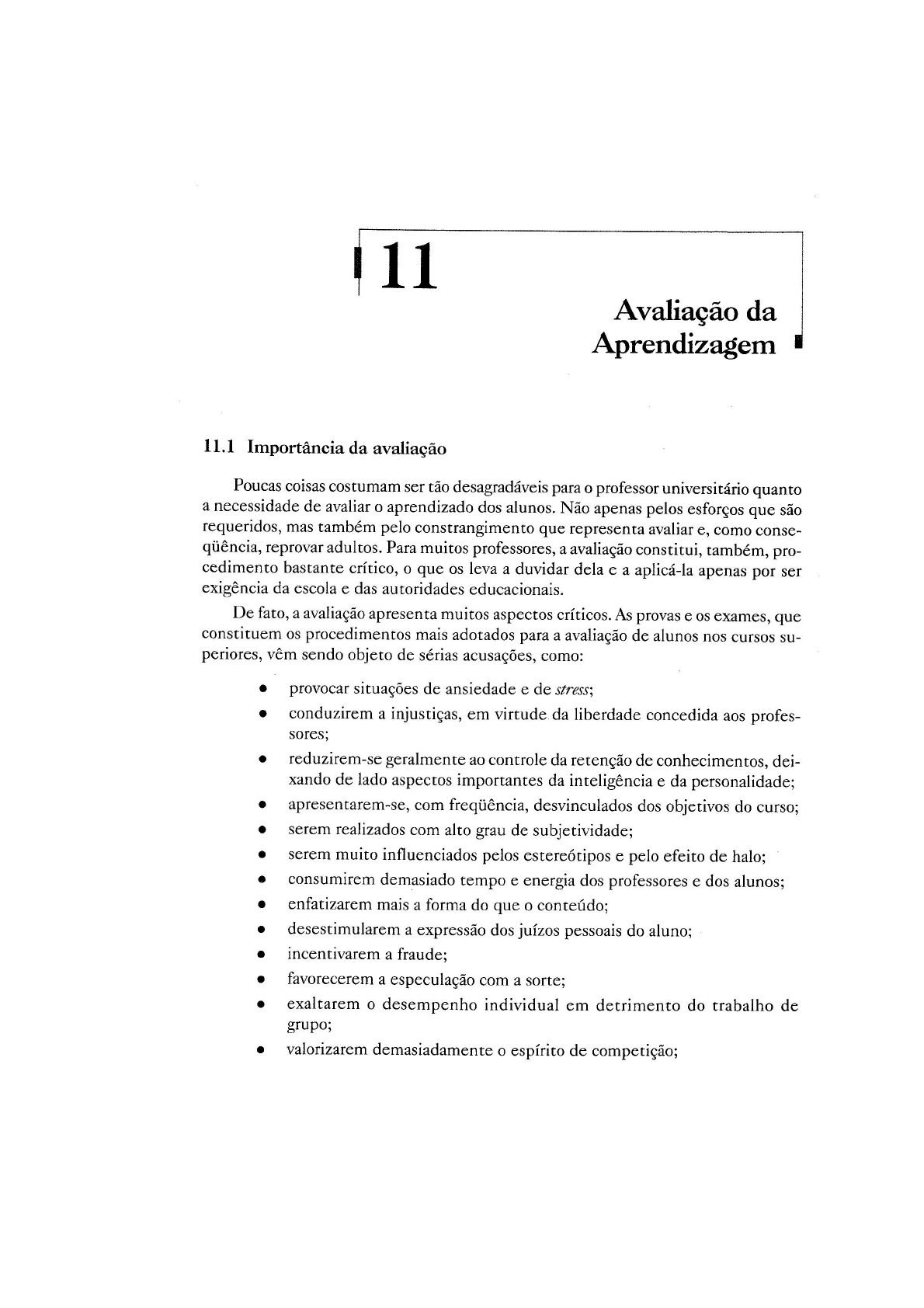 Avaliação da Aprendizagem 11.1 Importância da avaliação Poucas coisas costumam ser tão desagradáveis para o professor universitário quanto a necessidade de avaliar o aprendizado dos alunos. Não apenas pelos esforços que são requeridos, mas também pelo constrangimento que representa avaliar e, como conse- quência, reprovar adultos. Para muitos professores, a avaliação constitui, também, pro- cedimento bastante crítico, o que os leva a duvidar dela c a aplicá-la apenas por ser exigência da escola e das autoridades educacionais. De fato, a avaliação apresenta muitos aspectos críticos. As provas e os exames, que constituem os procedimentos mais adotados para a avaliação de alunos nos cursos su- periores, vêm sendo objeto de sérias acusações, como: provocar situações de ansiedade e de stress; conduzirem a injustiças, em virtude da liberdade concedida aos profes- sores; reduzirem-se geralmente ao controle da retenção de conhecimentos, dei- xando de lado aspectos importantes da inteligência e da personalidade: apresentarem-se, com frequência, desvinculados dos objetivos do curso; serem realizados com alto grau de subjetividade; serem muito influenciados pelos estereótipos e pelo efeito de halo; consumirem demasiado tempo e energia dos professores e dos alunos; enfatizarem mais a forma do que o conteúdo; desestimularem a expressão dos juízos pessoais do aluno; incentivarem a fraude; favorecerem a especulação com a sorte; exaltarem o desempenho individual em detrimento do trabalho de grupo; valorizarem demasiadamente o espírito de competição; 106 Metodologia do Ensino Superior e fazerem com que o professor ensine em função das provas; e dificultarem aos alunos avançar segundo o seu próprio ritmo; € e não respeitarem o saber elaborado pelos alunos. Todas estas objeções são, pelo menos em parte, verdadeiras. Não se pode negar que os exames tenham sido utilizados de forma tão abusiva a ponto de viciar a ação educativa da escola. Não são raros os casos de alunos cuja carreira foi seriamente pre- judicada por exames. Uma análise atenta e crítica dos exames pode mesmo identificá- los como privilegiados instrumentos do imobilismo social (Bourdieu e Passeron, 1976; Luckesi, 2003; Berbel, 2001). Daí, porém, concluir que os exames e as provas possam ser eliminados soa como algo utópico. O processo de avaliação encontra-se intimamente relacionado com o pro- cesso de aprendizagem. Não se pode pensar em educação por objetivos sem conside- rar algum tipo de avaliação. O fato de os exames terem sido tradicionalmente mal utilizados nas escolas su- periores não significa que sejam destituídos de valor. Em favor deles pode-se dizer que: e embora a medida rigorosa seja talvez impossível, é possível a obtenção de resultados bastante satisfatórios do ponto de vista estatístico; e são úteis para que os alunos possam situar-se em relação à matéria e aos outros alunos; e constituem uma forma de controle do trabalho dos professores; e representam uma forma privilegiada de fornecimento de feedback para o professor e para o aluno. 11.2 Fundamentos de uma avaliação adequada ao ensino superior nos tempos atuais 112.1 A avaliação é parte integrante do processo de aprendizagem A avaliação ao longo dos últimos séculos vinculou-se quase exclusivamente à fun- ção seletiva da escola. Grande parte dos esforços dos professores foi dedicada para determinar quais os alunos que seriam eliminados em cada uma das etapas do proces- so educacional. Assim, as instituições educacionais passaram a dirigir sua atenção pri- mordial ao aluno raro, o que teve como efeito a eliminação da maioria das crianças pro- venientes das classes operárias e a oferta de vantagens especiais aos filhos de profis- sionais liberais (Bloom et al., 1983, p. 5). Essa concepção de avaliação, bem como a própria idéia de utilização da escola para fins de seleção, está completamente ultrapassada. Não apenas por razões de ordem humanística, mas também em decorrência de fatores socioeconômicos. Os países, à medida que se desenvolvem, passam a necessitar de maior percentual de pessoas com Avaliação da Aprendizagem 107 formação universitária. Nesse contexto, a principal função da escola passa a ser a de promover o desenvolvimento do indivíduo. Ou, em outras palavras, sua principal tare- fa é a de fornecer aos alunos os conhecimentos e as habilidades necessárias para vive- rem de forma eficiente numa sociedade complexa. Numa escola com estas características, a avaliação deixa de ser vista como instru- mento de seleção e de fiscalização, externo ao processo de aprendizagem, mas como um método de coleta e análise dos dados necessários à melhoria da aprendizagem dos alunos; como parte integrada e essencial desse processo. 11.22 A avaliação vincula-se diretamente aos objetivos da aprendizagem Uma avaliação entendida como parte do processo de aprendizagem exige, antes de mais nada, que se considerem seus objetivos. São estes que determinam o que será avaliado, com que instrumentos, em que nível etc. No início do ano letivo (ou do semestre, conforme o caso), o professor precisa deixar bem claro para si € para os alunos que mudanças espera que neles ocorram como resultado do curso. A partir destes objetivos, ele poderá não apenas escolher as estra- tégias mais adequadas para facilitar a aprendizagem, mas também os procedimentos para avaliar em que medida aqueles objetivos foram alcançados. 11.2.3 Aavaliação deve ser contínua Tradicionalmente, concebe-se a avaliação como algo que ocorre no fim de um ci- clo didático. Porém, a avaliação deve ser contínua durante o curso. À medida que os alunos são submetidos a contínuas avaliações, cria-se um siste- ma de feedback, que lhes possibilita identificar o que lhes falta aprender para alcançar os objetivos do curso. Dessa forma, a avaliação passa a ter um cará