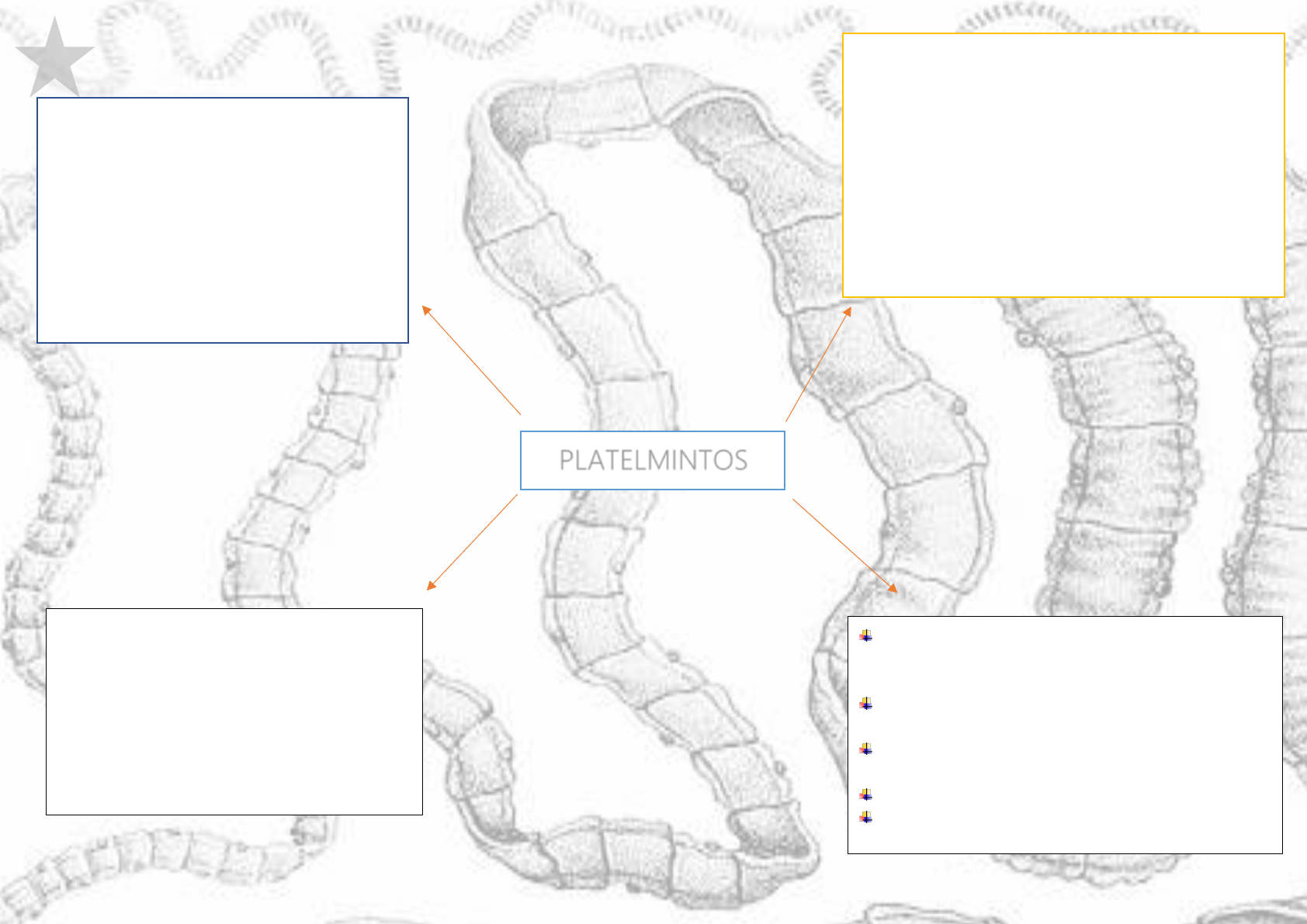 PLATELMINTOS São parasitas obrigatórios, ciclo heteroxeno (parasita apresenta seu ciclo biológico em dois hospedeiros – um definitivo e outro intermediário) Adultos – parasitam tubo digestivo, dutos biliares e pancreáticos de vertebrados Larvas – parasitam tecidos de vertebrados e invertebrados – cistos de diferentes tipos: Cisticerco; Cisto hidático. o Corpo geralmente em forma de fita; o São segmentados, providos anteriormente de um órgão de fixação (escólex) que apresenta estruturas adesivas (ex. Ventosas); o Não apresentam tubo digestivo; o São hermafroditas; o Cada proglote possui um conjunto completo de órgãos reprodutivos; o Apresenta crescimento contínuo: proglotes são destacadas e eliminadas com as fezes e novas se formam. ➢ São animais endoparasitos; ➢ heteróxenos obrigatórios, com raras exceções; adultos parasitos de vertebrados; ➢ larvas parasitas de vertebrados ou invertebrados; ➢ hermafroditas; ➢ corpo em forma de fita, dividido em segmentos, em geral, achatado dorsoventralmente; ➢ sem cavidade geral e tubo digestório. o Acelomados o Sem sustentação o Tubo digestório incompleto o Não há sistema circulatório (difusão) o Respiração cutânea o Excretam amônia o Assexuada e sexuada, hermafroditas o Autofecundação e fecundação cruzada. PLATELMINTO DOENÇA CAUSADA CICLO BIOLÓGICO TRATAMENTO FORMA INFECTANTE FORMA DIAGNÓSTICA FORMATO DO OVO TAENIA SOLIUM Ordem Cyclopyllidea TENÍASE (VERME ADULTO NO INTESTINO DELGADO) CISTICERSOSE (LARVA CYSTICERCUS CELLULOSAE) PORCO CICLO HETERÓXENO: HD: HOMEM HI: PORCO INTESTINO DELGADO HD: NÃO HÁ HI: HOMEM OLHO, S.N,C, PELE, MÚSCULO PRAZIQUANTEL NICLOSAMIDA ‘’ANTI-ATAQUE’’ (CUIDAR OLHOS E CÉREBRO) PRAZIQUANTEL ALBENDAZOL CISTICERCOS *INGESTÃO* OVO *INGESTÃO* CISTICERCO PESQUISA DE OVOS E PROGLOTES NAS FEZES (TAMISAÇÃO) OVO NAS FEZES CISTICERCO CLÍNICO, EXAME DO LÍQUIDO CEFALORRAQUIDIANO, RADIOLÓGICO, ELISA TAENIA SAGINATA Ordem Cyclopyllidea TENÍASE (VERME ADULTO NO INTESTINO DELGADO) BOI CICLO HETERÓXENO: HD: HOMEM HI: BOI INTESTINO DELGADO PRAZIQUANTEL NICLOSAMIDA CISTICERCOS *INGESTÃO* PESQUISA DE OVOS E PROGLOTES NAS FEZES (TAMISAÇÃO) OVO NAS FEZES OU FITA ADESIVA HYMENOLEPIS NANA Ordem Cyclopyllidea HIMENOLEPÍASE ALGUNS INSETOS (PULGAS) CICLO MONOXÊNICO HD: HOMEM HI: SIFONÁPTEROS (EXCETO = HETERÓXENO) JEJÚNO E ÍLEO PRAZIQUANTEL NITAZOXANIDE OVOS E CISTICERCOS *INGESTÃO* EXAME PARASITOLÓGICO DE FEZES (EPF) , PESQUISA DE OVOS COM FILAMENTOS http://www.parasitologiaclinica.ufsc.br/index.php/info/conteudo/fotografias/ovos-hnana/ HYMENOLEPIS DIMINUTA Ordem Cyclopyllidea TÊNIA DO RATO RATO CICLO HETERÓXENO: HD: RATO/CAMUNDONGO E EVENTUALMENTE O HOMEM. HI: LARVAS DE PULGAS; BARATAS. MUCOSA INTESTINAL PRAZIQUANTEL NICLOSAMIDA EMBRIÃO HEXACANTO, PENETRANDO NA MUCOSA INTWSTINAL E TRANSFORMA-SE EM CISTICERCÓIDE CLÍNICO E LABORATORIAL (PRESENÇA DE OVOS NAS FEZES). SEM FILAMENTOS (MAIORES) DIPHYLLOBOTHRIUM LATUM Ordem Pseudophyllidea TÊNIA DO PEIXE DIFILOBOTRÍASE PEIXE HI: 1° CRUSTÁCEOS (LARVA CILIADA – CORACÍDIO) HI: 2° PEIXES HD: HOMEM HOMEM: INTESTINO DELGADO (JEJUNO) PRAZIQUANTEL INGESTÃO DA CARNE CONTENDO A LARVA ESPARGANOS OU PLEROCERCÓIDE VITAMINA B12 (ANEMIA PERNICIOSA) (PRESENÇA DE OVOS NAS FEZES). ECHINOCOCCUS GRANULOSUS Ordem Cyclopyllidea HIDATIDÓSE OVELHAS CACHORRO HD: CÃO HI: OVELHA, HOMEM (ACIDENTAL) FÍGADO, PULMÃO, MÚSCULO. REMOÇÃO CIRURGICA DO CISTO + ALBENDAZOL OVO *INGESTÃO* CLÍNICO,RADIOLÓGICO OU ATRAVÉS DE SOROS SOROLÓGICOS. http://www.scielo.br/pdf/rsbmt/v39n1/a17v39n1.pdf http://www.scielo.br/pdf/rsbmt/v39n1/a17v39n1.pdf https://www.msdmanuals.com/pt-pt/profissional/doen%C3%A7as-infecciosas/cest%C3%B3deos-vermes-em-fita/difilobotr%C3%ADase-infec%C3%A7%C3%A3o-por-t%C3%AAnia-de-peixe https://www.msdmanuals.com/pt-pt/profissional/doen%C3%A7as-infecciosas/cest%C3%B3deos-vermes-em-fita/difilobotr%C3%ADase-infec%C3%A7%C3%A3o-por-t%C3%AAnia-de-peixe Escólex ▸ Taenia solium → ovóide ou piriforme (0,6 a 1 mm Ø), 4 ventosas e duas fileiras de acúleos no rostro (forma de foice) ▸ Taenia saginata → quadrangular (1,5 a 2 mm Ø), 4 ventosas, sem acúleos ➢ Escólex o Dilatação na extremidade mais delgada → fixação no intestino o Possuem ventosas e acúleos ➢ Colo o Porção mais delgada logo após escólex o Células em intensa atividade multiplicadora (zona de crescimento) ➢ Estróbilo o Cadeia de segmentos (anéis ou proglotes) o Diferenciam os órgãos internos do helminto o Proglote → órgãos reprodutores masculino e feminino → quanto mais afastada do escólex, mais evoluídas as proglotes o Proglotes jovens → proglotes maduras → proglotes gravídicas o Apólise → desprendimento das proglotes grávidas.
