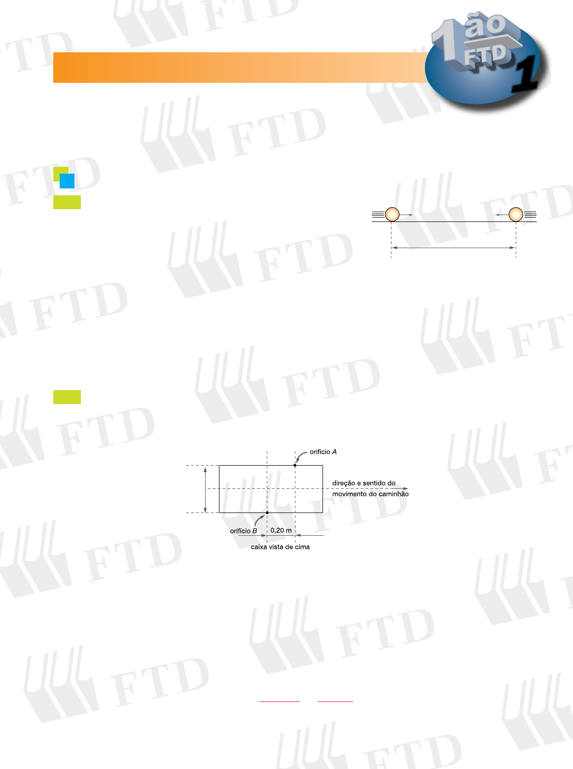 � Resolução das atividades complementares Física F3 — Cinemática escalar p. 31 1 1 Duas bolas de dimensões desprezíveis se aproximam uma da outra, executando movimentos retilíneos e uniformes (veja figura). Sabendo-se que as bolas possuem velocidades de 2 m/s e 3 m/s e que, no instante t 5 0, a distância entre elas é de 15 m, determine o instante da colisão. t � 0 15 m B 2 m/s 3 m/sA 2 (Vunesp-SP) Uma caixa de papelão vazia, transportada na carroceria de um caminhão, que trafega a 90 km/h num trecho reto de uma estrada, é atravessada por uma bala perdida. A largura da caixa é de 2 m e a distância entre as retas perpendiculares às duas laterais perfuradas da caixa e que passam, respectivamente, pelos orifícios de entrada e de saída da bala (ambos na mesma altura) é de 0,20 m. Supondo que a direção do disparo é perpendicular às laterais perfuradas da caixa e ao deslocamento do caminhão e que o atirador estava parado na estrada, determine a velocidade da bala, suposta constante. 2,00 m Resolução: Temos: s s v t s t A A A A 5 1 ? 5 1 ? 0 0 2 s s v t s t B B B B 5 1 ? 5 2 ? 0 15 3 Condição de encontro (sA 5 sB): 2t 5 15 2 3t 5t 5 15 → t 5 3 s 3 s Resolução: Dados: vc 5 90 km/h 5 25 m/s sc 5 2 m sd 5 0,2 m Vamos determinar quanto tempo a bala levou para atravessar a caixa: sc 5 vct → 0,2 5 25 ? t → t 5 8 ? 1023 s Esse mesmo intervalo de tempo foi utilizado pela bala para se deslocar 2 m; logo: sd 5 vb ? t → 2 5 vb ? 8 ? 1023 → vb 5 ? 5 ?2 2 8 10 2 10 83 3 → vb 5 250 m/s 250 m/s � 3 (UFPE-UFRPE) A figura a seguir representa duas pessoas, A e B, situadas ao longo de uma linha férrea retilínea. Quando A golpeia o trilho, B percebe o barulho através do ar 10 s após o impacto. Quantos centésimos de segundo após a batida de A, poderia o observador B ter sentido a vibração através do trilho, se a velocidade do som através do trilho é de 6 800 m/s? (Sabe-se que a velocidade do som através do ar vale 340 m/s.) A B 4 (Faap-SP) Dois móveis percorrem a mesma distância, partindo do mesmo ponto e no mesmo sentido, com velocidades constantes iguais a 50 m/s e 150 m/s. Sabendo que o móvel de menor velocidade gasta 2 segundos a mais que o dobro do tempo gasto pelo outro, determine a distância percorrida por eles. 0,50 s Resolução: Tomando o meio como o ar: s 5 vartar → s 5 340 ? 10 → s 5 3 400 m Como a distância percorrida é a mesma, temos: s 5 vtrilho ? t → 3 400 5 6 800 ? t → t 5 0,50 s Resolução: Fazendo um esquema: Como as velocidades são constantes, as funções horárias são: sA 5 50(2x 1 2) e sB 5 150x Como as distâncias percorridas são iguais: sA 5 sB → 50(2x 1 2) 5 150x 2x 1 2 5 3x x 5 2 s sB 5 150 ? 2 5 300 m M N 50 m/s 150 m/s tA � 2x � 2 tB � x A B 300 m � 5 (FEI-SP) Duas bicicletas saem no mesmo instante de um cruzamento conforme indicado. A velocidade da bicicleta A é vA 5 12 km/h e da bicicleta B é vB 5 16 km/h. Se as trajetórias forem retilíneas, qual será a menor distância entre as bicicletas após 1 hora? VB VA 6 (UFRJ) Dois trens, um de carga e outro de passageiros, movem-se nos mesmos trilhos retilíneos, em sentidos opostos, um aproximando-se do outro, ambos com movimentos uniformes. O trem de carga, de 50 m de comprimento, tem uma velocidade de módulo igual a 10 m/s e o de passageiros, uma velocidade de módulo igual a v. O trem de carga deve entrar num desvio para que o de passageiros possa prosseguir viagem nos mesmos trilhos, como ilustra a figura. No instante focalizado, as distâncias das dianteiras dos trens ao desvio valem 200 m e 400 m, respectivamente. Calcule o valor máximo de v para que não haja colisão. desvio trem de carga 10 m/s 400 m 200 m 50 m trem de pasageiros v 20 km Resolução: Dados: vA 5 12 km/h vB 5 16 km/h t 5 1 hora sA 5 vA ? t → sA 5 12 ? 1 5 12 km sB 5 vB ? t → sB 5 16 ? 1 5 16 km Após 1 h, temos a seguinte situação: d2 5 122 1 162 d 5 400 d 5 20 km sB � 16 km sB � 12 km distância (d) Resolução: trem de carga: vc 5 10 m/s trem de passageiros: vp 5 v Para que não ocorra colisão, o trem de carga deve percorrer 250 m (200 m 1 50 m) no mesmo tempo em que o trem de passageiros percorrerá 400 m. v v s v v c p p 5 D D 5 D D 5 D D 5 5 D D 5 s t s t t t s t c p → → → → 10 250 25 4400 25 16→ vp 5 m/s 16 m/s � p. 32 7 (AFA-SP) Uma esteira rolante com velocidade ve transporta uma pessoa de A para B em 15 s. Essa mesma distância é percorrida em 30 s se a esteira estiver parada e a velocidade da pessoa for constante e igual a vp. Se a pessoa caminhar de A para B, com a velocidade vp, sobre a esteira em movimento, cuja velocidade é ve, o tempo gasto no percurso, em segundos, será: a) 5 c) 15 b) 10 d) 30 8 (EsPCEx-SP) Um caminhão de 10 m de comprimento, descrevendo um movimento retilíneo e uniforme, ingressa em uma ponte com uma velocidade de 36 km/h. Passados 20 s, o caminhão conclui a travessia da ponte. O comprimento da ponte é de: a) 100 m c) 190 m e) 210 m b) 110 m d) 200 m Resolução: v 5 D D s t ve → velocidade da esteira ve 5 D D s t e Dse → comprimento da esteira D 5 ? 5 D s s 15e e15 v ve e→ vp 5 D D s t e vp → velocidade da pessoa D 5 5 D s s 30e e30 v vp p→ Percorrendo a esteira com a soma das velocidades: v ve p1 5 D D D 1 D 5 D D D 5 Ds t s 15 s 30 s t s 30 se e e e e 10 e→ → 3 1 DD D 5 t t→ 10 s Resolução: Transforme km/h em m/s km/h m/s 4 3,6 3 3,6 36 km/h 4 3,6 5 10 m/s v 5 D D s t comprimento do caminhão Ds 5 (10 1 x) m comprimento da ponte 10 10 20 10 200 1905 1 1 5 5x x x m→ → � 9 O que significa dizer que um corpo está em movimento retilíneo e uniforme? 10 Um carro movimenta-se sobre uma trajetória retilínea segundo a função horária s 5 20 1 6t (no SI). a) Qual a posição inicial e a velocidade do carro? b) Qual a posição do carro no instante 10 s? c) Em que instante o carro passa pela posição 92 m? d) Construa o gráfico de s 5 20 1 6t no intervalo de 0 a 15 s? p. 37 11 Uma part
