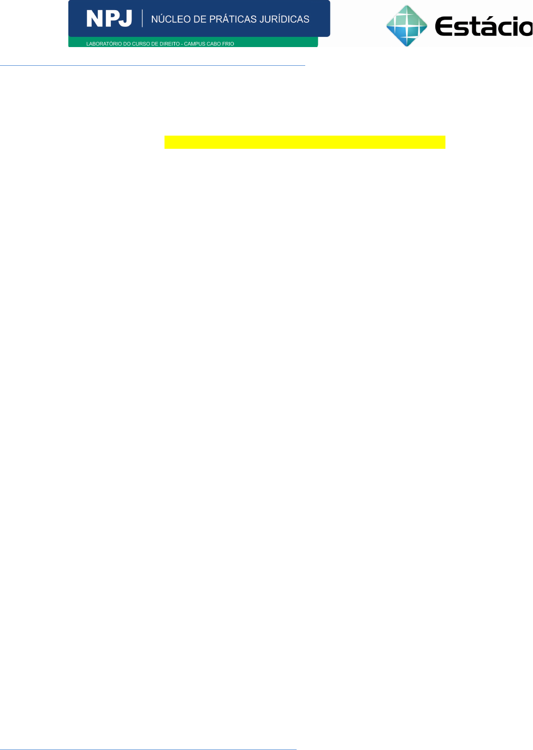 UNIVERSIDADE ESTÁCIO DE SÁ – CAMPUS CABO FRIO FACULDADE DE DIREITO Atividade Proposta: RELATÓRIO DE AUTOS FINDOS A análise de autos findos é uma atividade importante para que o(a) estagiário(a) desenvolva uma análise sobre tudo que ocorreu durante o processo judicial que está sendo apresentado, se familiarizando com os andamentos e apresentação das peças processuais conforme já estudado nas disciplinas teóricas de direito material e processual em sala de aula. 1. DADOS DO(A) ACADÊMICO(A): NOME: MATRÍCULA: Estágio ___ 2. DADOS DO PROCESSO: Número do processo: Vara/Juizado/Câmara/Turma: Data do arquivamento: Autor: Réu: 3. DADOS DA PETIÇÃO INICIAL (resumo contendo os fatos, fundamentos jurídicos e pedidos): 4. DADOS DA CONTESTAÇÃO (resumo contendo defesa processual/preliminar, defesa de mérito e pedidos do requerido): 5. ESPÉCIES DE PROVAS PRODUZIDAS NO PROCESSO: 6. ESPÉCIES DE AUDIÊNCIAS REALIZADAS NO PROCESSO: 7. SENTENÇA (Analisar o relatório, a fundamentação e a decisão): 8. RECURSOS (Relatar se alguma das partes se insurgiram da sentença, com qual tipo de recurso e com qual fundamentação): 9. EXECUÇÃO (Relatar se há petição de cumprimento de sentença ou execução provisória): 8