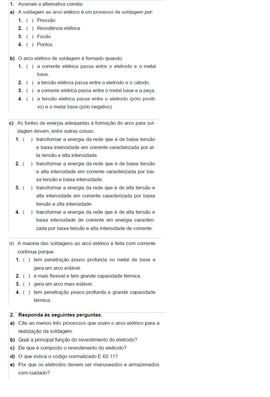 ARCO ELÉTRICO Respostas: 1- a) (fusão) b) (1) c) (4) d) (3) 2- a) Eletrodo revestido, TIG; MIG/MRG; arco submerso; plasma. b) Evitar a contaminação da poça de fusão pela atmosfera. c) Elementos de liga, desoxidantes, estabilizadores de arco, formadores de escória, materiais fundentes e materiais que formam atmosfera protetora. d) E = eletrodo para soldagem a arco elétrico. 60 = limite mínimo de resistência à tração do metal de solda. 11 = soldar em todas as posições em CC+CA. e) Porque em caso de choque ou dobra seu revestimento pode ser quebrado, sua alma exposta, comprometendo seu desempenho. 3- a) Fonte de energia, porta eletrodo, grampo de retorno, cabo ou condutor, picadeira, escova de fios de aço, equipamentos de proteção individual (EPI). b) Prender o eletrodo e energizá-lo. c) Para proteção contra radiação, raios ultravioleta e infra-vermelhos e intensidade luminosa. 4- a) (3) b) (4) c) (1) d) (6) e) (5)