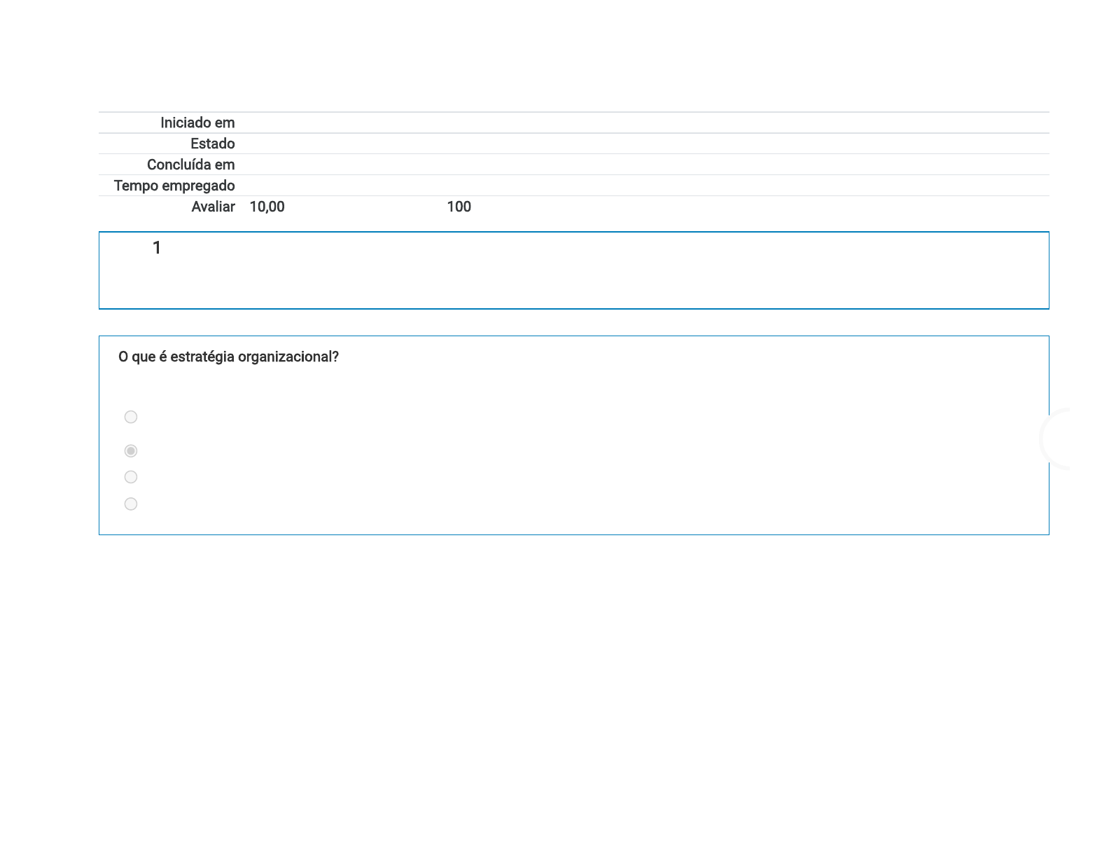 10/06/2020 Atividade 03 - Avaliação de Aprendizagem: Revisão da tentativa https://www.ead.pr.gov.br/mod/quiz/review.php?attempt=254163&cmid=31546 1/5 Iniciado em segunda, 8 Jun 2020, 14:51 Estado Finalizada Concluída em segunda, 8 Jun 2020, 14:54 Tempo empregado 2 minutos 14 segundos Avaliar 10,00 de um máximo de 10,00(100%) Questão 1 Correto Atingiu 2,00 de 2,00 O que é estratégia organizacional? Escolha uma: a. É o meio utilizado para atender aos próprios interesses organizacionais em detrimento dos objetivos do governo ou da sociedade. b. Trata-se da de�nição de um futuro desejado e dos meios e�cazes para alcançá-lo. c. São métodos de trabalho utilizados para justi�car ações adotadas sem um planejamento associado. d. É a indicação do futuro desejado sem qualquer discussão de como chegar até ele. Sua resposta está correta. A resposta correta é: Trata-se da de�nição de um futuro desejado e dos meios e�cazes para alcançá-lo.. 10/06/2020 Atividade 03 - Avaliação de Aprendizagem: Revisão da tentativa https://www.ead.pr.gov.br/mod/quiz/review.php?attempt=254163&cmid=31546 2/5 Questão 2 Correto Atingiu 2,00 de 2,00 Selecione entre os diversos itens abaixo, três que constituem o tripé do propósito da unidade, ou seja, aqueles sobre os quais todos os demais aspectos se apoiam: Escolha uma ou mais: a. Competências organizacionais b. Mapa estratégico c. Valores d. Objetivos e. Cultura organizacional f. Análise de contexto g. Visão de futuro h. Metas de desempenho i. Missão j. Indicadores Sua resposta está correta. As respostas corretas são: Missão, Valores, Visão de futuro 10/06/2020 Atividade 03 - Avaliação de Aprendizagem: Revisão da tentativa https://www.ead.pr.gov.br/mod/quiz/review.php?attempt=254163&cmid=31546 3/5 Questão 3 Correto Atingiu 2,00 de 2,00 A construção da Agenda Estratégica segue uma certa lógica temporal. Enumere em ordem de acontecimentos cada um dos elementos abaixo: Estabelecimento do propósito (missão, visão e valores). Compreensão do Ambiente Institucional. Modelando indicadores de desempenho e metas. Construção do Mapa Estratégico (contendo os diversos objetivos que levam ao cumprimento do propósito). Estabelecendo esforços de implementação (plano de ação, coisas a fazer). 2 1 4 3 5 Sua resposta está correta. A resposta correta é: Estabelecimento do propósito (missão, visão e valores). → 2, Compreensão do Ambiente Institucional. → 1, Modelando indicadores de desempenho e metas. → 4, Construção do Mapa Estratégico (contendo os diversos objetivos que levam ao cumprimento do propósito). → 3, Estabelecendo esforços de implementação (plano de ação, coisas a fazer). → 5. 10/06/2020 Atividade 03 - Avaliação de Aprendizagem: Revisão da tentativa https://www.ead.pr.gov.br/mod/quiz/review.php?attempt=254163&cmid=31546 4/5 Questão 4 Correto Atingiu 2,00 de 2,00 Associe cada um dos três critérios de uma boa Agenda Estratégica com o seu respectivo conceito: Conter um conjunto minimamente relevante e signi�cativo de resultados e esforços. Seus elementos programáticos devem ser convergentes entre si e com os resultados das políticas públicas (objetivos, programas, projetos). Satisfazer as expectativas das partes interessadas. Foco Coerência Legitimidade Sua resposta está correta. A resposta correta é: Conter um conjunto minimamente relevante e signi�cativo de resultados e esforços. → Foco, Seus elementos programáticos devem ser convergentes entre si e com os resultados das políticas públicas (objetivos, programas, projetos). → Coerência, Satisfazer as expectativas das partes interessadas. → Legitimidade. 10/06/2020 Atividade 03 - Avaliação de Aprendizagem: Revisão da tentativa https://www.ead.pr.gov.br/mod/quiz/review.php?attempt=254163&cmid=31546 5/5 Questão 5 Correto Atingiu 2,00 de 2,00 Marque verdadeiro ou falso para a a�rmativa a seguir. Os objetivos estratégicos são declarações de resultados quanti�cáveis, dispostos no mapa estratégico em perspectivas e vinculados entre si por meio de relações de causa e efeito. Escolha uma opção: Verdadeiro Falso A resposta correta é 'Verdadeiro'. https://www.ead.pr.gov.br/mod/book/view.php?id=31545&forceview=1 https://www.ead.pr.gov.br/mod/url/view.php?id=31547&forceview=1