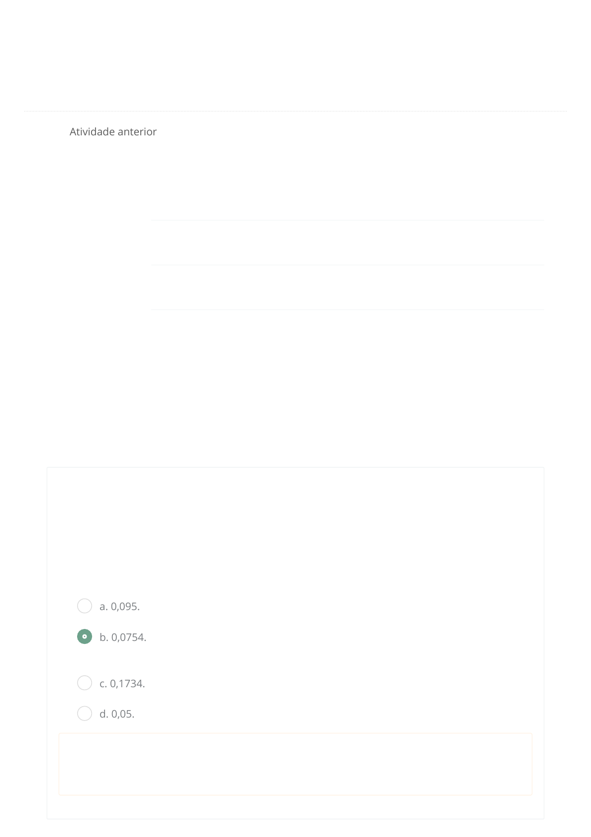 / MÉTODOS QUANTITATIVOS ESTATÍSTICOS Atividade anterior Iniciado em domingo, 14 Jun 2020, 17:25 Estado Finalizada Concluída em domingo, 14 Jun 2020, 17:32 Avaliar 10,0 de um máximo de 10,0(100%) Questão 1 Correto Uma máquina produz 100m de �tas de cetim por dia, que serão vendidos em peças de 10m. A probabilidade de que uma peça tenha defeito é de 2%. Um cliente que comprou 25 peças a�rmou que recebeu 2 peças com defeito. A probabilidade desse fato ter ocorrido é de Escolha uma: Sua resposta está correta. A resposta correta é: 0,0754.. a. 0,095. S b. 0,0754. c. 0,1734. d. 0,05. https://aula.fael.edu.br/mod/quiz/view.php?id=3331&forceview=1 https://aula.fael.edu.br/ / Questão 2 Correto Qual o desvio-padrão amostral dos salários dos assistentes administrativos da empresa "PagaBem" ? Escolha uma: Sua resposta está correta. A resposta correta é: R$296,20.. a. R$1080,00. b. R$548,56. c. R$358,29. S d. R$296,20. https://aula.fael.edu.br/ / Questão 3 Correto Uma amostra de 15 peças é extraída, com reposição, de um lote que contém 10% de peças defeituosas. A probabilidade em porcentagem de que o lote não contenha peças defeituosas é de Escolha uma: Sua resposta está correta. A resposta correta é: 20,59%. a. 2,06% b. 25,32% S c. 20,59% d. 30,55% https://aula.fael.edu.br/ / Questão 4 Correto Para se estudar o desempenho de duas companhias corretoras de ações, selecionaram-se de cada uma delas amostras aleatórias das ações negociadas. Para ação selecionada, computou-se a porcentagem de lucros apresentada durante um período �xado de tempo. Os dados estão a seguir: Qual das corretoras apresentou resultados com menor variabilidade, conforme a análise do desvio-padrãoamostral e o coe�ciente de variação? Escolha uma: Sua resposta está correta. A resposta correta é: A corretora A apresentou a menor variabilidade com desvio-padrão amostral igual a 12,817398 e coe�ciente de variação de 20,817% . a. A corretora A apresentou a menor variabilidade com desvio-padrão amostral igual a 11,401754 e coe�ciente de variação de 18,098% S b. A corretora A apresentou a menor variabilidade com desvio-padrão amostral igual a 12,817398 e coe�ciente de variação de 20,817% c. A corretora B apresentou a menor variabilidade com desvio-padrão amostral igual a 15,45346 e coe�ciente de variação de 24,0% d. A corretora B apresentou a menor variabilidade com desvio-padrão amostral igual a 21,767166 e coe�ciente de variação de 30,087% https://aula.fael.edu.br/ / Questão 5 Correto O número ideal de classes (k) para um conjunto de dados, conforme orientação de Sturges (arredondando para cima com número inteiro) para 300 dados (elementos) e para 1000 dados (elementos) é: Escolha uma: Sua resposta está correta. A resposta correta é: para 300 dados o n.º de classes é de k = 10 e para 1 000 dados o n.º de classes é de k = 11. a. para 300 dados o n.º de classes é de k = 9 e para 1 000 dados o n.º de classes é de k = 10 S b. para 300 dados o n.º de classes é de k = 10 e para 1 000 dados o n.º de classes é de k = 11 c. para 300 dados o nº de classes é de k = 11 e para 1 000 dados o nº de classes é de k = 12 d. para 300 dados o nº de classes é de k = 11 e para 1 000 dados o nº de classes é de k = 11 https://aula.fael.edu.br/ / Questão 6 Correto Determine o valor de z, no qual a área refere-se à limitada pela curva normal. A área entre 0 e z é de 0,4582. Escolha uma: Sua resposta está correta. A resposta correta é: O valor desejado é z = 1,73.. a. O valor desejado é z = 1,00. S b. O valor desejado é z = 1,73. c. O valor desejado é z = 0,17. d. O valor desejado é z = 1,32. https://aula.fael.edu.br/ / Questão 7 Correto No porto chegam navios à razão de r = 6 navios por hora. Observa-se a o processo durante um período de meia hora (t = 1/2), sendo a variável aleatória o número de navios que chegam ao porto por hora. A média e o desvio-padrão conforme distribuição de Poisson é de: Escolha uma: Sua resposta está correta. A resposta correta é: média (u) = 3 e desvio-padrão (o) = 1,732051.. a. média (u) = 4 e desvio-padrão (o) = 2,332151. b. média (u) = 3 e desvio-padrão (o) = 0,430251. S c. média (u) = 3 e desvio-padrão (o) = 1,732051. d. média (u) = 2 e desvio-padrão (o) = 1,0. https://aula.fael.edu.br/ / Questão 8 Correto Situação: suponha que em três dias foram coletadas amostras de volume de bagagem no aeroporto, obtendo os seguintes pesos por mala: 1º dia = 10,1 ? 18,2 ? 20,5 ? 5,2 ? 19,1 2º dia = 15,8 ? 14,0 ? 13,5 ? 16,8 ? 16,7 3º dia = 19,8 ? 10,0 ? 21,0 ? 26,8 ? 19,7 Assinale a alterantiva correta. Escolha uma: Sua resposta está correta. A resposta correta é: O 2.º dia apresenta menor dispersão/variação, com amplitude igual a 3,3.. a. O 1.º dia é o que apresenta menor dispersão/variação, com amplitude de igual a 15,3. b. O 2.º dia é o que apresenta menor dispersão/variação, com amplitude igual a 0,9. c. O 1.º dia e o 2.º dia apresentam maior dispersão/variação com amplitude igual a 0,1. S d. O 2.º dia apresenta menor dispersão/variação, com amplitude igual a 3,3. https://aula.fael.edu.br/ / Questão 9 Correto Numa fábrica foram instaladas 1 000 lâmpadas novas. Sabe-se que a duração média das lâmpadas é de 800 horas e desvio-padrão de 100 horas, com distribuição Normal. Qual a quantidade de lâmpadas que durarão menos de 500 horas? Escolha uma: Sua resposta está correta. A resposta correta é: Aproximadamente 2 lâmpadas.. a. Aproximadamente 4 lampadas. b. Aproximadamente 3 lâmpadas. c. Aproximadamente 1 lâmpada. S d. Aproximadamente 2 lâmpadas. https://aula.fael.edu.br/ / Questão 10 Correto Para as 10 idades de mulheres gestantes, ordenadas da mais nova até a mais velha, o percentil correspondente a 20 é igual a Escolha uma: Sua resposta está correta. A resposta correta é: 30.. a. 27. b. 5. c. 20. S d. 30. https://aula.fael.edu.br/