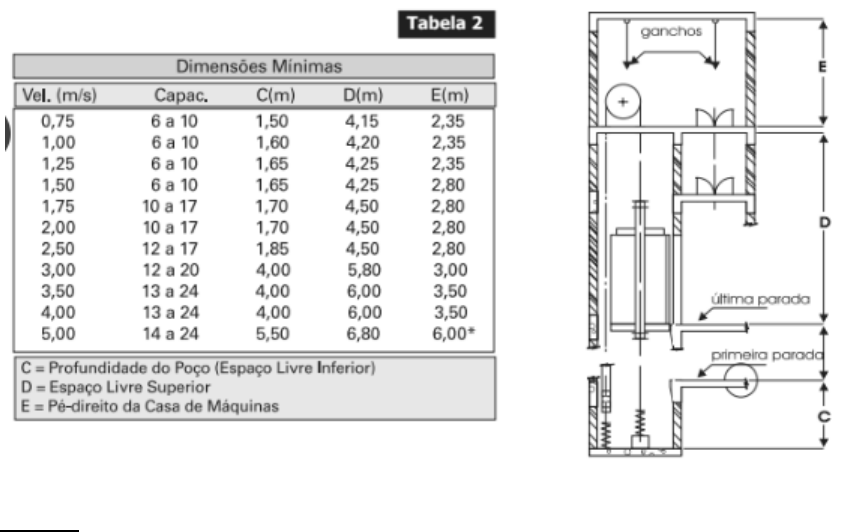 CHECK-LIST PARA ELEVADORES SEGUNDO NBR NM 207 A norma estabelece somente os requisitos que os materiais e o equipamento devem atender tendo em vista a operação segura dos elevadores. o Guias inclinadas no máximo 15º com a vertical Na tabela a seguir encontram-se as alturas mínimas para o espaço livre superior, em função das diferentes velocidades dos elevadores. CAIXA o Contrapeso de um elevador deve estar na mesma caixa do carro* o Cada caixa deve ser totalmente fechada por paredes, pisos e tetos sem perfurações, as únicas aberturas permitidas são:* a) Abertura para portas de pavimento b) Abertura para portas de inspeção e emergência da caixa e portinholas de inspeção c) Abertura para saída de gases e fumaças em caso de incêndio d) Abertura para ventilação e) Aberturas permanentes entre a caixa e as casas de máquinas e de polias o Portas de inspeção devem possuir altura mínima de 1,40m e largura mínima de 0,65m. o As portas de emergência devem possuir altura mínima de 1,80m e largura mínima de 0,35m. o As portinholas de inspeção devem possuir altura máxima de 0,50m e largura máxima de 0,50m. o Portas de inspeção e emergência e portinholas de inspeção não se devem abrir para o interior da caixa. o As portas e as portinholas devem ser providas de trava com chave permitindo o fechamento autônomo e fechar e travar sem o uso da chave. As portas de inspeção e emergência devem poder ser abertas a partir do inferior da caixa sem chave mesmo estando travadas. o O funcionamento do elevador somente deve ser possível quando todas as portas citadas forem travadas. o A caixa deve ser convenientemente ventilada e não deve ser utilizada para a ventilação de locais alheios ao serviço dos elevadores. Devem ser previstas aberturas de ventilação, na parte superior da caixa, com área total de no mínimo 1% da seção transversal da caixa. Esta ventilação poderá ser feita diretamente do exterior ou através da casa de máquinas ou casa de polias. o As paredes laterais da caixa devem possuir acabamento liso e de cor clara. o A distância horizontal entre a parede da caixa e a soleira não deve exceder 0,125m.* o Quando o contrapeso estiver apoiado em seu para-choque totalmente comprimido, as seguintes quatro condições devem ser satisfeitas simultaneamente (v é a velocidade nominam em m/s) a) Os comprimentos das guias do carro, expressos em m, devem ser tais que possam acomodar um percurso guiado adicional de pelo menos 0,1+0,035v² b) A distância vertical livre, expressa em m, entre o nível da área mais alta no topo da cabina e o nível mais alto do teto da caixa deve ser pelo menos igual a 1,0+0,035v² c) A distância vertical livre, expressa em m, entre as partes mais baixas do teto da caixa : 1. As peças mais altas do equipamento fixado no teto da cabina, exceto como especificado em 2 abaixo, deve ser pelo menos de 0,3+0,035v². 2. A parte mais alta dos cursores ou das ligações dos cabos deve ser pelo menos igual a 0,1+0,035v². d) Deve ter acima da cabina espaço suficiente para acomodar um paralelepípedo reto retangular de pelo menos 0,5m x 0,6m x 0,8m apoiado em uma de suas faces. o Quando o carro estiver apoiado em seu para-choque totalmente comprimido, os comprimentos das guias do contrapeso, expressos em m, devem ser tais que possam acomodar um percurso guiado adicional de pelo menos 0,1 + 0,035v². o As paredes devem ser constituídas de material incombustível formando uma superfície lisa. Se existirem saliências na direção do movimento do elevador, estas devem ser chanfradas a 60º ou mais com a horizontal.** o Quando houver distância superior a 11 m entre paradas consecutivas, devem existir portas de emergência na Caixa.** o Não pode existir na Caixa qualquer equipamento além do necessário para o funcionamento do elevador.** o Poço deve ser aproximadamente nivelado. o O poço deve ser impermeabilizado contra infiltração de água o Quando o carro repousar no seu para-choque completamente comprimido, as seguintes condições devem ser simultaneamente atendidas: a) Deve existir no poço um espaço suficiente para acomodar um paralelepípedo reto retangular de no mínimo 0,5m x 0,6m x 1,0m apoiado em qualquer uma das faces, devendo a área de apoio ser pintada com tinta de cor amarelo brilhante; b) A distância vertical livre entre o fundo do poço e 1. As partes mais baixas do carro, exceto as especificadas em 2 abaixo, devem ser pelo menos igual a 0,5m; 2. As partes mais baixas dos cursores, dos blocos do freio de segurança, do protetor da soleira devem ser pelo menos igual a 0,1m o No poço deve ter, disponível para o pessoal da manutenção: a) Um interruptor, facilmente acessível da porta de acesso e do piso do poço, que pare o elevador e mantenha-o parado que não tenha risco de engano sobre a posição de parada correspondente; Um interruptor adicional poderá ser requerido se estas condições não puderem ser atendidas simultaneamente por um único interruptor. b) Uma tomada elétrica; c) Meios para ligar a iluminação da caixa. o A caixa deve ser usada exclusivamente com os propósitos do elevador. Ela não deve conter cabos ou dispositivos, etc, que não sejam do elevador.* o A caixa deve ser provida com iluminação elétrica de instalação permanente, proporcionando iluminação mínima de 20lx durante reparos e manutenção, mesmo quando todas as portas estão fechadas. Esta iluminação deve compreender uma lâmpada em cada um dos pontos mais alto e mais baixo da caixa e lâmpadas intermediárias com distância entre elas não superior a 7m. o Deve existir acesso ao fundo do Poço. o Entre os Poços de elevadores adjacentes deve existir parede divisória, ou proteção de chapa metálica ou tela de arame, de abertura de malha inferior a 5 cm, com altura mínima de 2,50 m acima do nível do fundo do Poço. o Quando houver porta na parede divisória dos Poços de elevadores adjacentes, essa porta deverá t