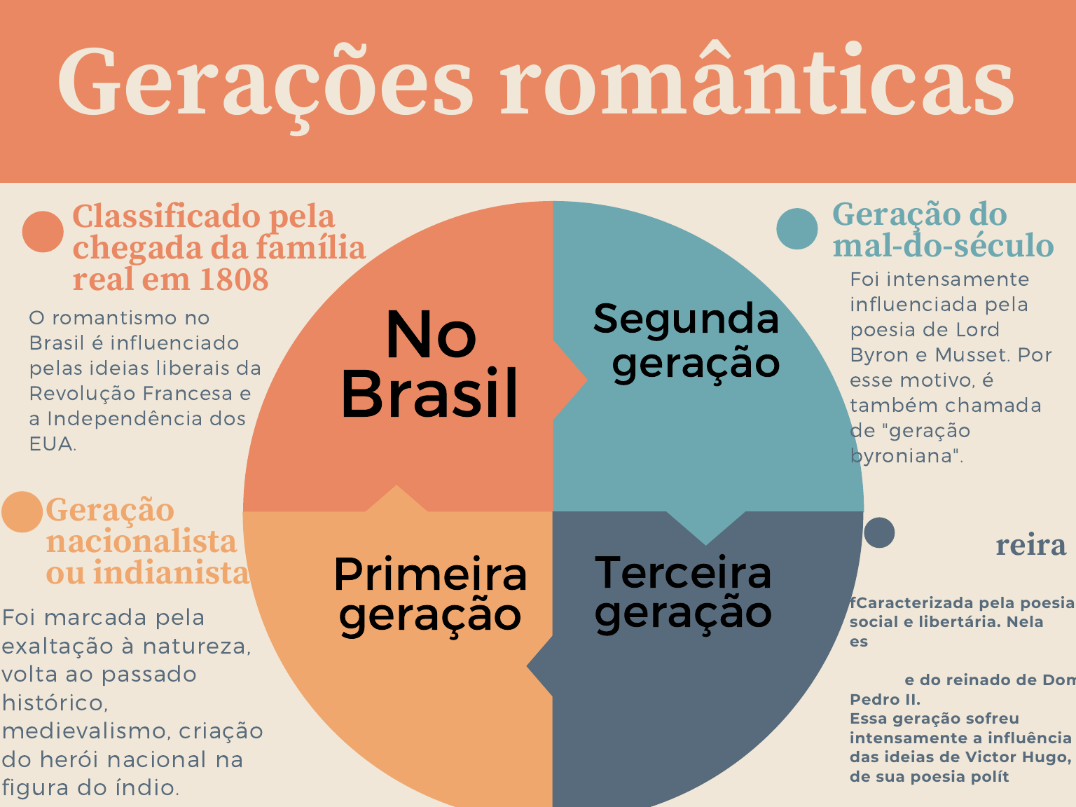 No Brasil Segunda geração Terceira geração Primeira geração O romantismo no Brasil é influenciado pelas ideias liberais da Revolução Francesa e a Independência dos EUA. Classificado pela chegada da família real em 18081 Foi intensamente influenciada pela poesia de Lord Byron e Musset. Por esse motivo, é também chamada de "geração byroniana". Geração do mal-do-século 2 Foi marcada pela exaltação à natureza, volta ao passado histórico, medievalismo, criação do herói nacional na figura do índio. Geração nacionalista ou indianista fCaracterizada pela poesia social e libertária. Nela estão refletidas as lutas internas da segunda metade do reinado de Dom Pedro II. Essa geração sofreu intensamente a influência das ideias de Victor Hugo, de sua poesia político- social. Geração Condoreira Gerações românticas Principais represent- antes Primeira geração Entre os principais poetas podemos destacar Gonçalves Dias, Gonçalves de Magalhães e Araújo Porto Alegre. Segunda Geração Os principais poetas dessa geração foram Álvares de Azevedo, Casimiro de Abreu, Junqueira Freire e Fagundes Varela. Terceira Geração Seu principal representante foi Castro Alves, seguido por Sousândrade. MARIA LAIANE MESQUITA COSTA 2ºinformática