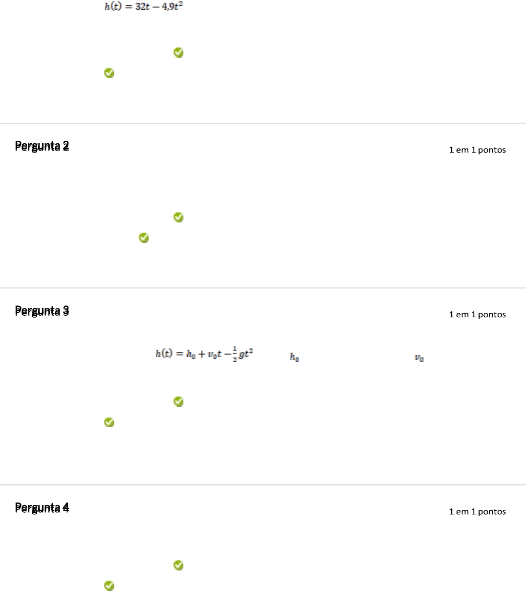 Uma bola é lançada verticalmente para cima com velocidade inicial de 32 m/s e considerando a aceleração gravitacional igual a 9,8 m/s² é obtido uma relação para determinar a altura desta bola conforme o tempo, dada por: . Sobre esta função quadrática é possível a rmar que: Resposta Selecionada: a parábola que representa a trajetória da bola é côncava para baixo. Resposta Correta: a parábola que representa a trajetória da bola é côncava para baixo. Feedback Resposta correta. A função que corresponde a trajetória da bola é côncava para baixo, uma da vez que o coe ciente do termo que contém o expoente dois é negativo. resposta: A representação grá ca da função quadrática se difere em relação aos pontos que interceptam os eixos das abcissas e das ordenadas, mas são representados por curvas bastante similares. O grá co de uma função polinomial do segundo grau é sempre representação de uma: Resposta Selecionada: parabola. Resposta Correta: parabola. Feedback da Resposta correta. A representação grá ca de uma função quadrática é sempre uma resposta: parábola, essa curva pode ser côncava para cima ou côncava para baixo. A altura h, acima do solo, de um objeto lançado em queda livre, sob ação exclusiva da forca gravitacional é informada pela função , em que é a altura inicial em metros, é a velocidade inicial em metros por segundo e g é a aceleração gravitacional. Sobre o domínio desta função é possível a rmar que: Resposta Selecionada: precisa ser adequado as condições da natureza da variável. Resposta Correta: precisa ser adequado as condições da natureza da variável. Feedback Resposta correta. A aplicação das funções polinomiais de segundo grau na física, como este, o da de queda livre requer atenção na determinação do domínio, uma vez que o domínio precisa ser resposta:adequado ao contexto da situação e consequentemente as condições da natureza da variável. Existem diversos tipos de funções, assim para compreender melhor suas aplicações e atribuições é comum o estudo destas relações individualmente. A função polinomial do 2º grau possui características próprias e pode também ser denominada por Resposta Selecionada: função quadrática. Resposta Correta: função quadrática. Feedback Resposta correta. A função polinomial do segundo grau também pode ser denominada por da função quadrática, uma vez que entre seus termos deve-se ter uma incógnita com expoente resposta:igual a dois. O vértice de uma parábola corresponde ao ponto de máximo ou de mínimo de uma função polinomial do segundo grau. Assim em toda função quadrática é possível determinar seu vértice. Qual das situações cotidianas abaixo representa uma possibilidade de utilizar o conceito de ponto mínimo ou máximo? Resposta Selecionada: Receita e lucro de uma empresa. Resposta Correta: Receita e lucro de uma empresa. Feedback Resposta correta. Na economia, no contexto de uma empresa é possível encontrar o lucro da máximo e a receita máxima, uma vez que estas funções são quadráticas, assim possibilita resposta:encontrar o vértice. Através das raízes reais das funções quadráticas é possível encontrar informações relevantes quanto ao grá co desta função, contudo só este dado não permite encontrar a representação grá ca da função. O termo independente, também indicado por c na função permite a localização de um ponto em qual eixo do plano cartesiano? Resposta Selecionada: Eixo das ordenadas. Resposta Correta: Eixo das ordenadas. Feedback Resposta correta. O termo independente, também indicado por c na função permite a da localização de um ponto no eixo do plano cartesiano denominado eixo das ordenadas, que é a resposta: localização de pontos que possuem abcissa zero. Em toda parábola, que é a representação grá ca de uma função polinomial do segundo grau, existe uma reta que passa pelo vértice da função e é equidistante em relação as raízes da função quadrática. Esta reta recebe o nome de eixo: Resposta Selecionada: de simetria Resposta Correta: de simetria Feedback Resposta correta. Em toda parábola, existe uma reta que passa pelo vértice da função e é da equidistante em relação as raízes da função quadrática. Esta reta recebe o nome de eixo de resposta:simetria, uma vez que há existe uma simetria em relação a esta reta. Quando uma função de segundo grau é igualada a zero é possível determinar suas raízes reais. E possível encontrar suas raízes distintas, duas raízes iguais que equivale a uma. ou nenhuma raiz. Sobre as raízes da função é possível a rmar que: Resposta Selecionada: existem uma raiz real impar. Resposta Correta: existem uma raiz real impar. Feedback Resposta correta. Para encontrar as raízes da função solicitada é necessário utilizar a formula da de Bhaskara substituindo os números referentes aos coe cientes. Toda função polinomial do segundo grau possui como representação grá ca, esta pode ser côncava para cima ou côncava para baixo dependendo do sinal do coe ciente que acompanha o termo a. Sobre a função quadrática: , julgue as seguintes asserções: I. A concavidade da parábola é voltada para baixo. II. A função não possui zero da função. III. O discriminante é um valor menor que zero. IV. A parábola corta o eixo y no ponto (0, -8). É correto o que se a rma em: Resposta Selecionada: IV, apenas. Resposta Correta: IV, apenas. Feedback Resposta correta. A concavidade da parábola é voltada para cima, uma vez que o coe ciente de da a é um valor positivo, maior que zero; já o discriminante é um valor maior que zero e devido a resposta:isso é obtido duas raízes reais distintas; logo a parábola corta o eixo y no ponto (0,-8). Saber identi car os coe cientes de uma função quadrática é fundamental para entender o comportamento de tal função. Na ausência dos coe cientes b e c, a funç