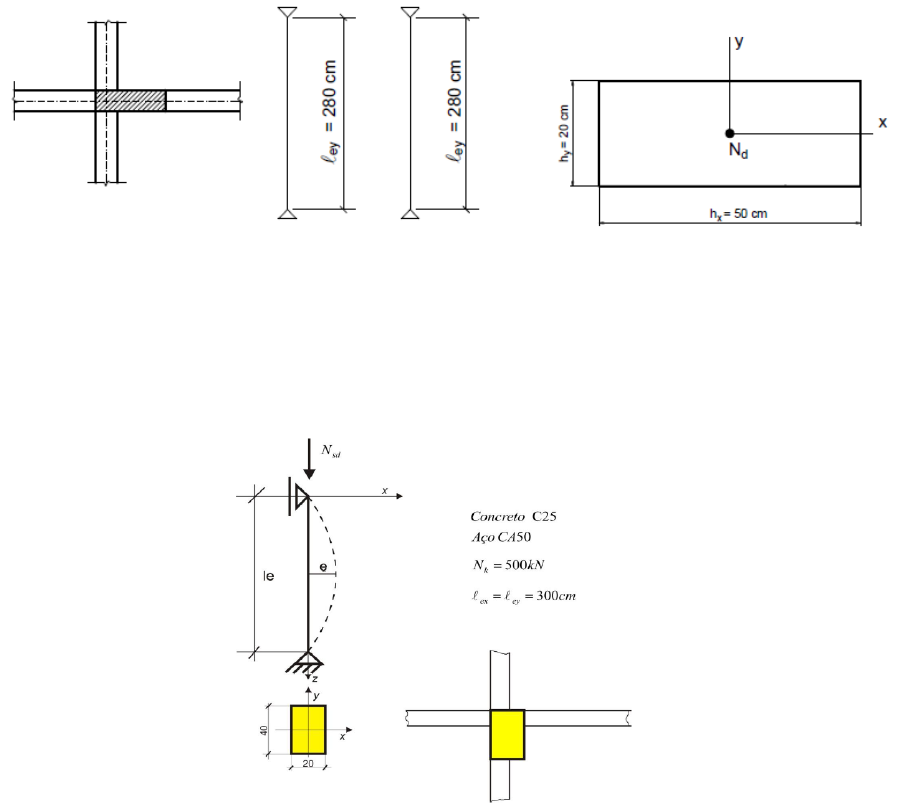 Lista de Exercícios – Pilares 1. Descreva com suas palavras o que são e onde ocorrem os efeitos de 2ª ordem globais e locais. 2. Diferencie estruturas de nós fixos e nós móveis. 3. Diferencie o que são estruturas de contraventamento e estruturas contraventadas, dê exemplos. 4. Dimensionar a armadura longitudinal do seguinte pilar intermediário: Dados: Nk=785,7kN, seção transversal 50 x 20 cm, lex = ley = 280cm, Concreto C30, Aço CA-50 R: ni=0,51 mi,y=0,10 5. Dimensionar a armadura longitudinal do seguinte pilar intermediário: Dados: Nk=500kN, seção transversal 20 x 40 cm, lex = ley = 300cm, Concreto C25, Aço CA-50 R: ni=0,49 mi,x=0,11 6. Dimensionar a armadura longitudinal do seguinte pilar de extremidade: Dados: Nk=600kN, seção transversal 20 x 50 cm, lex = ley = 300cm, Concreto C25, Aço CA-50, L,viga,x=300cm, b,viga=15, h,viga=40; q,viga=60kN/m R: ni=0,47 mi,x=0,10 7. Dimensionar a armadura longitudinal do seguinte pilar de extremidade: Dados: Nk=1.110,0kN, seção transversal 20 x 70 cm, lex = ley = 280cm, Concreto C20, Aço CA-50, L,viga,x=300cm, b,viga=15, h,viga=40; q,viga=60Kn/m R: Ni=0,78 mi,x=0,14 8. Dimensionar a armadura longitudinal do seguinte pilar de canto: Dados: Nk=1000kN, seção transversal 20 x 40 cm, lex = ley = 350cm, Concreto C25, Aço CA-50 (Ábacos de flexão oblíqua), L,viga,x=300cm, L,viga,y=380cm b,viga=15, h,viga=40; q,viga=60kN/m R: Ni=0,98 mi,x=0,20 mi,y=0,09 9. Dimensionar a armadura longitudinal do seguinte pilar de canto: Dados: Nk=820kN, seção transversal 20 x 50 cm, lex = ley = 280cm, Concreto C20, Aço CA-50 (Ábacos de flexão oblíqua), L,viga,x=300cm, L,viga,y=380cm b,viga=15, h,viga=40; q,viga=60kN/m R: Ni=0,80 mi,x=0,14 mi,y=0,06