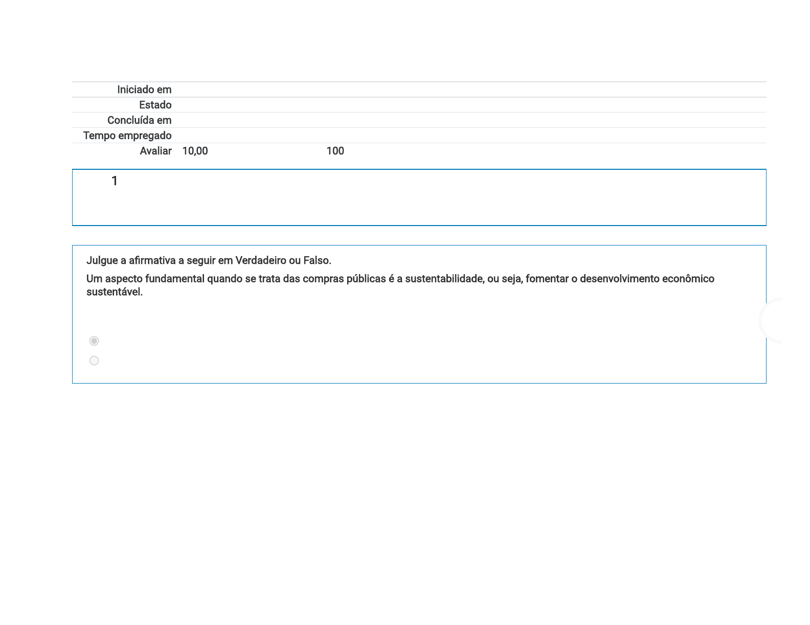 17/06/2020 Atividade 18 - Avaliação de Aprendizagem: Revisão da tentativa https://www.ead.pr.gov.br/mod/quiz/review.php?attempt=259006&cmid=31025 1/5 Iniciado em quarta, 17 Jun 2020, 12:41 Estado Finalizada Concluída em quarta, 17 Jun 2020, 12:48 Tempo empregado 6 minutos 32 segundos Avaliar 10,00 de um máximo de 10,00(100%) Questão 1 Correto Atingiu 2,00 de 2,00 Julgue a a�rmativa a seguir em Verdadeiro ou Falso. Um aspecto fundamental quando se trata das compras públicas é a sustentabilidade, ou seja, fomentar o desenvolvimento econômico sustentável. Escolha uma opção: Verdadeiro Falso A resposta correta é 'Verdadeiro'. 17/06/2020 Atividade 18 - Avaliação de Aprendizagem: Revisão da tentativa https://www.ead.pr.gov.br/mod/quiz/review.php?attempt=259006&cmid=31025 2/5 Questão 2 Correto Atingiu 2,00 de 2,00 Julgue a a�rmativa a seguir em verdadeiro ou falso. Em geral, podemos criar indicadores de desempenho para diversos aspectos envolvendo a gestão e a prestação de serviços públicos. Dessa forma, é relativamente fácil criar indicadores para as áreas meio da Administração Pública. Escolha uma opção: Verdadeiro Falso A resposta correta é 'Falso'. 17/06/2020 Atividade 18 - Avaliação de Aprendizagem: Revisão da tentativa https://www.ead.pr.gov.br/mod/quiz/review.php?attempt=259006&cmid=31025 3/5 Questão 3 Correto Atingiu 2,00 de 2,00 Relacione cada uma das etapas do PDCA ao seu respectivo conceito. Planejar o trabalho a ser realizado através de um plano de ação, após a identi�cação, reconhecimento das características e descoberta das causas principais do trabalho a ser feito. Caso haja alguma diferença entre o plano e a execução, proceder com a tomada de ação corretiva; caso contrário, padronizar e concluir o plano. Realizar o trabalho planejado, de acordo com o plano de ação. Medir e avaliar o que foi feito, identi�cando a diferença entre o realizado e o que foi planejado no plano de ação. P A D C Sua resposta está correta. A resposta correta é: Planejar o trabalho a ser realizado através de um plano de ação, após a identi�cação, reconhecimento das características e descoberta das causas principais do trabalho a ser feito. → P, Caso haja alguma diferença entre o plano e a execução, proceder com a tomada de ação corretiva; caso contrário, padronizar e concluir o plano. → A, Realizar o trabalho planejado, de acordo com o plano de ação. → D, Medir e avaliar o que foi feito, identi�cando a diferença entre o realizado e o que foi planejado no plano de ação. → C. 17/06/2020 Atividade 18 - Avaliação de Aprendizagem: Revisão da tentativa https://www.ead.pr.gov.br/mod/quiz/review.php?attempt=259006&cmid=31025 4/5 Questão 4 Correto Atingiu 2,00 de 2,00 Marque a única alternativa correta. Escolha uma: a. O processo de compras públicas possui diversos indicadores consagrados. Dessa forma, não se con�gura uma atividade complexa o seu monitoramento e a veri�cação dos fatores de melhoria necessários. b. Os agentes públicos devem buscar continuamente resultados na execução das políticas públicas. Para isso, os indicadores se constituem em ferramentas fundamentais e imprescindíveis. c. Atualmente não há di�culdade em se encontrar indicadores para as áreas meio da Administração Pública. d. O ambiente do setor público é bastante dinâmico e instável. Justamente por isso, o planejamento deve ser estável, não havendo a possibilidade de revisão ou adaptação do mesmo. Sua resposta está correta. A resposta correta é: Os agentes públicos devem buscar continuamente resultados na execução das políticas públicas. Para isso, os indicadores se constituem em ferramentas fundamentais e imprescindíveis.. 17/06/2020 Atividade 18 - Avaliação de Aprendizagem: Revisão da tentativa https://www.ead.pr.gov.br/mod/quiz/review.php?attempt=259006&cmid=31025 5/5 Questão 5 Correto Atingiu 2,00 de 2,00 Julgue a a�rmação a seguir em verdadeiro ou falso. O PDCA é uma metodologia que possui início, meio e �m bem de�nidos, de forma a auxiliar os gestores a entender e atuar melhor na gestão das organizações. Escolha uma opção: Verdadeiro Falso A resposta correta é 'Falso'. https://www.ead.pr.gov.br/mod/lesson/view.php?id=31024&forceview=1 https://www.ead.pr.gov.br/mod/questionnaire/view.php?id=31026&forceview=1