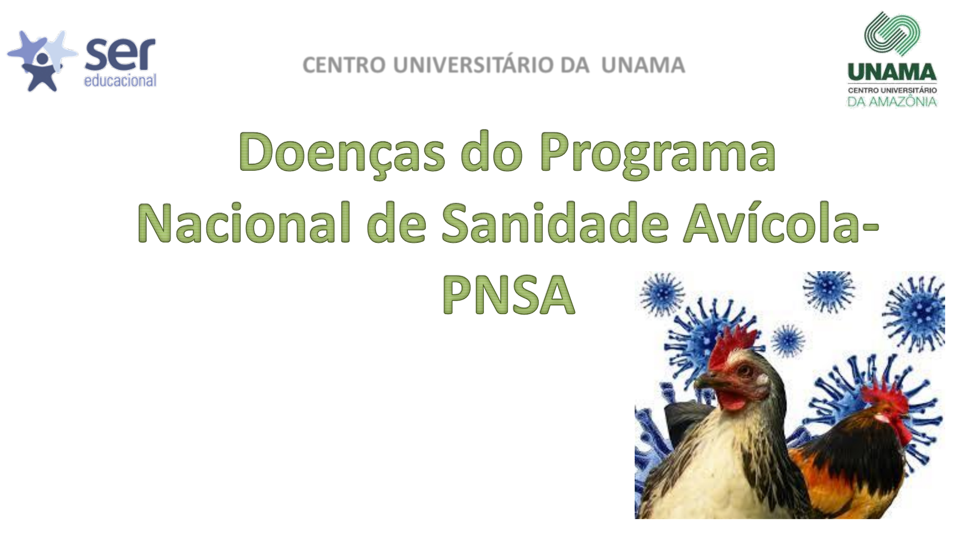 Professora: Alessandra Ximenes Disciplina: Produção e Sanidade de Aves e Suínos 2020.1 CENTRO UNIVERSITÁRIO DA UNAMA Introdução ▪ Foi instituído no âmbito da Secretaria de Defesa Agropecuária pela Portaria nº 193, de 19 de setembro de 1994: ✓ Estabelecendo diversas as NORMAS e AÇÕES para regulamentar a PRODUÇÃO AVÍCOLA e salvaguardar o plantel avícola nacional. Introdução ▪ Definir ações que possibilitem a certificação sanitária do plantel avícola nacional; ▪ Favorecer a elaboração de produtos avícolas saudáveis para o mercado interno e externo. PNSA- Objetivos Introdução 1-Vigilância Epidemiológica e Sanitária das principais doenças aviárias – vigilância oficial: ▪ Doenças de Transmissão Horizontal: ✓Doença de Newcastle (DNC); ▪ Transmissão de doenças exóticas: ✓Influenza aviária (IA); ▪ Controle e erradicação de doenças aviárias de transmissão vertical: ✓Salmoneloses: S. Gallinarum, S. Pullorum, S. Enteritidis e S. Typhimurium (controle/erradicação de doenças de transmissão vertical) ; ✓Micoplasmoses: M .gallisepticum, M. synoviae, M. melleagridis. PNSA- Atuação Introdução 2- Assistência e erradicação dos focos das doenças de controle oficial; 3- Padronização das medidas de biosseguridade e de desinfecção; 4- Realização de inquérito epidemiológico local; 5- Vigilância sanitária realizada pelo VIGIAGRO nos pontos de ingresso de material genético (portos, aeroportos e postos de fronteiras); PNSA- Atuação O local de saída e chegada devem ser registrados pelo MAPA. 6- Controle e fiscalização do trânsito de animais; Doenças de Newcastle (DNC) ▪ A DNC é exótica na avicultura industrial brasileira e eventuais focos devem ser erradicados. ▪ Sua presença é de notificação obrigatória e imediata ao MAPA. É uma enfermidade viral, aguda, altamente contagiosa, que acomete aves silvestres e comerciais, com sinais respiratórios, frequentemente seguidos por manifestações nervosas, diarreia e edema da cabeça. ▪ Severidade varia com a susceptibilidade e com o patótipo viral. ▪ Pseudo peste aviária, neumoencefalite aviária, desordem respiratório-nervosa; ▪ Vírus é encontrado nas descargas respiratórias e intestinais de aves contaminadas. Doenças de Newcastle Etiologia ▪ Enfermidade viral (Paramyxovirus), aguda, altamente contagiosa; (RNA) ▪ Sinais respiratórios, manifestações nervosas, diarreia e edema da cabeça; ▪ Família: Paramyxoviridae; ▪ Gênero: Avulavírus da família Paramyxovírus do sorotipo-1 (APMV-1). ▪ O período de incubação: pode durar de 3 a 12 dias. ▪ A manifestação dos sintomas da doença pode variar. ▪ Tudo depende da tensão específica que infectou o indivíduo. ▪ Todas as cepas têm uma característica comum - a capacidade de lidar com fatores externos de natureza física e química. Doenças de Newcastle Sinais Clínicos • Altamente patogênica (altos índices de mortalidade), com lesões hemorrágicas no trato digestório; Velogênico Viscerotrópico (“Forma de Doyle”) • Alta mortalidade e são observados sinais nervosos e respiratórios; • Em galinhas todas as idades Velogênico Neurotrópico • Patogenicidade intermediária, sinais respiratórios + brandos/ sintomatologia nervosa, mas com baixa mortalidade; Mesogênico • patogenicidade muito baixa, infecções respiratórias brandas ou subclínicas; Rara mortalidade. • Cepa mais usada em vacinais. Lentogênica ou vacinal • Cepa replica no trato gastrointestinal, causando uma infeção entérica subclínica. Entérica Assintomática “Forma de Doyle” Doenças de Newcastle Sinais Clínicos Velogênico Viscerotrópico (“Forma de Doyle”) Velogênico Neurotrópico “forma de Beach” Os principais sinais são apatia, diarreia esverdeada e lesões hemorrágicas, principalmente nos intestinos; Problemas respiratórios como espirros e corrimento nasal ou ruído dos pulmões, inchamento da cabeça e face, fraqueza, sinais nervosos como torcicolo (figura 3), paralisia das pernas e tremores musculares e finalmente ocorre mortalidade, que pode chegar até 100% das aves; Viscerotrópico velogênico Hemorragia do sist. Linfóide em foram de crescente na pálpebra inferior (fase inicial) Hemorragia focal e necrose das amígdalas cecais ocorre na infecção. Focos hemorrágicos no proventrículo correspondem à necrose do tecido linfóide subjacente. baço manchado indicando necrose multifocal as aves geralmente são brilhantes e alertas, mas têm hemiparesia. Frango com conjuntivite. congestão difusa e focos de hemorragia traqueal Neurotrópico velogênico Proventriculite com hemorragia multifocal na mucosa Doenças de Newcastle ▪ A infecção pode ocorrer através da inalação ou ingestão, sendo que o vírus está presente no ar exalado pelas aves, nas fezes e em toda parte da carcaça da ave durante a infecção aguda e na morte. ▪ A contaminação de outras aves pode ocorrer por meio de aerossóis e pela ingestão de água ou comida contaminada. Epidemiologia ▪ Transmissão horizontal, direta ou indireta; ▪ Patos e gansos ficam portadores, mas sem SC; ▪ Galinhas, perus, faisões e pavões mais sensíveis a doença; Doenças de Newcastle Prevenção ▪ Detecção precoce de lotes infectados (monitoria laboratorial para vigilância). ▪ Sacrifício das aves infectadas; ▪ Queda completa do nível de anticorpos: ocorre até a idade de abate de frangos de corte, tem sido utilizada como uma forma de verificar se há vírus circulando em determinada região. Controle ▪ Baseia em biossegurança (rígida seguridade); ▪ Uso de vacinas: ✓ Matrizes: para transferência de imunidade passiva ás progênies; ✓ Somente reprodutoras e poedeiras comerciais, sem vacinar os frangos de corte ou, ainda, vacinando toda a população avícola. Doenças de Newcastle Pode ser através de vacina viva ou inativada e deve seguir Programa de Vacinação. Prevenção D