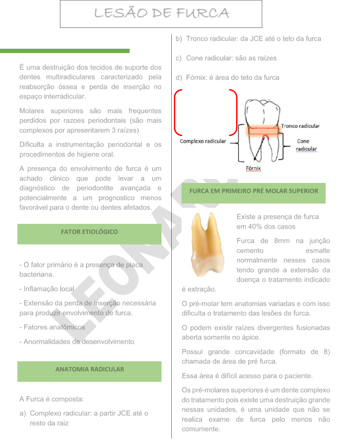 LEONARDO DE SOUSA LIMA @lslreal É uma destruição dos tecidos de suporte dos dentes multiradiculares caracterizado pela reabsorção óssea e perda de inserção no espaço interradicular. Molares superiores são mais frequentes perdidos por razoes periodontais (são mais complexos por apresentarem 3 raízes) Dificulta a instrumentação periodontal e os procedimentos de higiene oral. A presença do envolvimento de furca é um achado clinico que pode levar a um diagnóstico de periodontite avançada e potencialmente a um prognostico menos favorável para o dente ou dentes afetados. - O fator primário é a presença de placa bacteriana. - Inflamação local - Extensão da perda de inserção necessária para produzir envolvimento de furca. - Fatores anatômicos - Anormalidades de desenvolvimento A Furca é composta: a) Complexo radicular: a partir JCE até o resto da raiz b) Tronco radicular: da JCE até o teto da furca c) Cone radicular: são as raízes d) Fórnix: é área do teto da furca Existe a presença de furca em 40% dos casos Furca de 8mm na junção cemento esmalte normalmente nesses casos tendo grande a extensão da doença o tratamento indicado é extração. O pré-molar tem anatomias variadas e com isso dificulta o tratamento das lesões de furca. O podem existir raízes divergentes fusionadas aberta somente no ápice. Possui grande concavidade (formato de 8) chamada de área de pré furca. Essa área é difícil acesso para o paciente. Os pré-molares superiores é um dente complexo do tratamento pois existe uma destruição grande nessas unidades, é uma unidade que não se realiza exame de furca pelo menos não comumente. LESÃO DE FURCA FATOR ETIOLÓGICO ANATOMIA RADICULAR FURCA EM PRIMEIRO PRÉ MOLAR SUPERIOR Ao avaliar as raízes deve se observar a divergência entre as raízes que significa a distância entre os radiculares LEONARDO DE SOUSA LIMA @lslreal O procedimento respectivo nesses elementos raramente é possível devido a anatomia do complexo radicular. Nem sempre vai ser necessário extrair porem possui um prognostico pior (PMS) Não existe furca na área palatina do molar superior são 3 furcas V, M e D: O primeiro molar superior dos molares é o mais robusto apresenta 3 cones radiculares 2 vestibulares e 1 na palatina, na vestibular a entrada da furca estar em uma distância de 3,5mm então necessita ter doença até osso, área para que se tenha uma lesão de furca. FURCA MESIAL – distância média de JEC entrada de furca 3mm a entrada até mais próxima da face proximal. Essa entrada se encontra mais palatina do que para vestibular então na hora da sondagem, sonda por palatino. Porque a raiz mesiovestibular é mais achatada e longa já a raiz palatina é menor e arredonda. Furca distal – distancia media da JEC a entrada de furca 5mm esta num ponto equidistante das faces vestibulares e palatinas abaixo do ponto de contato por isso acesso é mais difícil, caso haja a presença do dente adjacente. Um fato que complica são pacientes que possuem raízes muitas próximas dos dentes vizinhos. Normalmente são dois cones A entrada de furca é mais ou menos ao meio, tanto em vestibular como em lingual. Furca de vestibular > 3mm Furca lingual >4mm A diferença entre uma e oura é que a entrada da furca lingual é mais longa e a vestibular de furca grau II e grau III é sinal de o paciente é periodontite severa, pois entra como fator agravante devido à complexidade do tratamento. Para realizar o diagnóstico de furca utiliza se as sondas willians ou sonda milimetrada Pc15 para o diagnostico inicial se a sondagem for superior a 5mm faz uso de sonda nabers para confirmar o envolvimento de furca e classificar o seu grau. PRIMEIRO MOLAR SUPERIOR MOLARES INFERIORES DIAGNÓSTICO LEONARDO DE SOUSA LIMA @lslreal Nem toda lesão de furca é originada por biofilme – diagnóstico diferencial entre a periodontia e a endodontia, e para isso seja realizado o teste de sensibilidade e para que essa dúvida seja tirada, caso o teste negativo, a origem, é através da patologia pulpar. a) Lesão endodôntica b) Lesão periodontal c) Trauma oculsal – quando há uma imagem semelhante com a lesão de furca, mas quando a sonda é inserida não entra (habito parafuncional, bruxismo) a realização do desgaste oclusal e na próxima semana observa se o inicio da reversão do caso. Quando houve lesões periodontais associadas problemas endodônticos – primeiro realizar tratamento endodôntico e depois caso necessário realiza se a terapia periodontal. Quando não existe perda óssea nas interproximais certamente não é devido doença periodontal. Uma perda entre as raízes pode estar associada a lesão endodôntica ou trauma oclusal. Eliminar os (depósitos duros e moles do biofilme) das superfícies do complexo radicular e por isso sempre se faz raspagem e alisamento radicular depende do tratamento escolhido. Estabelecer uma anatomia das superfícies afetas que facilite o controle do biofilme pelo paciente. Sonda milimetrada pc15 DIAGNÓSTICO DIFERENCIAL TRATAMENTO E OBJETIVO LEONARDO DE SOUSA LIMA @lslreal Existe outra possibilidade através instrumentos de pontas finas e instrumentos especiais. Curetas de Gracey Ultrassônicos Limas periodontais Controle do biofilme bacteriano Obs: componente mais crítico da manutenção do dente multiradicular é sempre redução bem- sucedida ou eliminação das áreas de retenção de placa da área de furca e higienizar bem, pelo paciente. Uma terapia cirúrgica efetiva pode exercer um papel principal na obtenção deste objetivo, ou seja, um prognóstico vai depender do grau de higiene oral do paciente. Lesões de bifurcações pode ser mantida como terapia periodontal conservadora, instrumentos ultrassónicos, antimicrobiano locais (PVPI usado em faces livres já em faces próximas não tem benefício) As lesões de classe II livres têm mais sucesso com tratamento não cirúrgico do que lesões proximais que o acesso é muito di