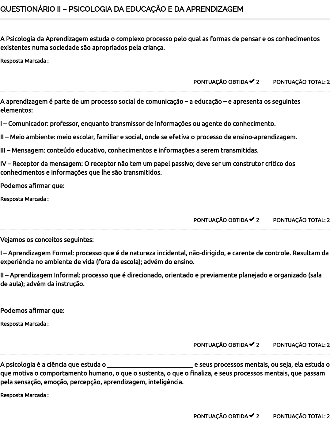 QUESTIONÁRIO II – PSICOLOGIA DA EDUCAÇÃO E DA APRENDIZAGEM PONTUAÇÃO TOTAL: 2PONTUAÇÃO OBTIDA 2 A Psicologia da Aprendizagem estuda o complexo processo pelo qual as formas de pensar e os conhecimentos existentes numa sociedade são apropriados pela criança. Resposta Marcada : Verdadeiro PONTUAÇÃO TOTAL: 2PONTUAÇÃO OBTIDA 2 A aprendizagem é parte de um processo social de comunicação – a educação – e apresenta os seguintes elementos: I – Comunicador: professor, enquanto transmissor de informações ou agente do conhecimento. II – Meio ambiente: meio escolar, familiar e social, onde se efetiva o processo de ensino-aprendizagem. III – Mensagem: conteúdo educativo, conhecimentos e informações a serem transmitidas. IV – Receptor da mensagem: O receptor não tem um papel passivo; deve ser um construtor crítico dos conhecimentos e informações que lhe são transmitidos. Podemos a�rmar que: Resposta Marcada : Todos estão corretos. PONTUAÇÃO TOTAL: 2PONTUAÇÃO OBTIDA 2 Vejamos os conceitos seguintes: I – Aprendizagem Formal: processo que é de natureza incidental, não-dirigido, e carente de controle. Resultam da experiência no ambiente de vida (fora da escola); advém do ensino. II – Aprendizagem Informal: processo que é direcionado, orientado e previamente planejado e organizado (sala de aula); advém da instrução. Podemos a�rmar que: Resposta Marcada : Nenhuma das a�rmativas acima. PONTUAÇÃO TOTAL: 2PONTUAÇÃO OBTIDA 2 A psicologia é a ciência que estuda o ___________________________ e seus processos mentais, ou seja, ela estuda o que motiva o comportamento humano, o que o sustenta, o que o �naliza, e seus processos mentais, que passam pela sensação, emoção, percepção, aprendizagem, inteligência. Resposta Marcada : Comportamento humano. PONTUAÇÃO TOTAL: 2PONTUAÇÃO OBTIDA 2 A psicologia também, aplica à educação e ao ensino, busca mostrar como, através da interação entre professor e alunos, entre os alunos, é possível a aquisição do saber e da cultura acumulados. Por tanto papel do professor nesse processo, é dispensável. Resposta Marcada : Falso PONTUAÇÃO TOTAL: 2PONTUAÇÃO OBTIDA 2 A Psicologia no âmbito da escolar deve também contribuir para: Marque a alternativa correta. Resposta Marcada : Otimizar as relações entre professores e alunos, além dos pais, direção e demais pessoas que interagem nesse ambiente. PONTUAÇÃO TOTAL: 2PONTUAÇÃO OBTIDA 2 Sobre o Grupo de papéis autoritários, podemos dizer que: I – Substituto da autoridade paterna: professor que se coloca como líder. Pode assumir a liderança de 2 formas: autocrática ou democrática, ambas envolvem o sistema de status no grupo. II – Fonte de informações: sua função é transferir conhecimentos para os alunos; é aquele que sabe. Se orienta em termos acadêmicos em sua abordagem. Forja uma concepção passiva do aluno quando se vê como o único que sabe tudo. III – Líder de grupo: assume o papel de orientador dos alunos, orientando a todos de igual maneira. Não é nem paternalista demais, nem rígido demais. Mantém um bom e equilibrado nível de relações afetuosas com todos. Marque a alternativa correta: Resposta Marcada : Apenas II. PONTUAÇÃO TOTAL: 2PONTUAÇÃO OBTIDA 2 Ocorre quando o aluno apresenta di�culdade na elaboração da linguagem escrita. A criança pode encontrar di�culdades para desenvolver suas habilidades na área mencionada. Esta é a descrição de um dos principais distúrbios de aprendizagem, qual é? Resposta Marcada : Disgra�a 20 / 20 PONTUAÇÃO TOTAL: 2PONTUAÇÃO OBTIDA 2 É de fundamental relevância também, que haja um engajamento, tanto entre professor como toda instituição escolar, primeiramente, procurando tomar conhecimento da clientela a qual está recebendo, e depois disso, partir para o seu planejamento escolar, considerando neste, as características e conhecimentos de cada educando permitindo, assim, que o discente se sinta incluso na sala de aula, onde proporcionará diante dessa ação maior índice de aprendizagem. Vale salientar que o professor, não é o único responsável, e sim toda a instituição escolar, pois caberá a esta preparar e capacitar professores, supervisores e orientadores educacionais e dispor de uma equipe multipro�ssional. Dentre os pro�ssionais que não necessariamente devem estar incluídos nessa equipe podemos destacar: Resposta Marcada : Clínico Geral PONTUAÇÃO TOTAL: 2PONTUAÇÃO OBTIDA 2 É importante o diálogo entre professor – aluno – família, mesmo que o apoio familiar soa de total irrelevância para o desenvolvimento da criança. Resposta Marcada : Falso Total