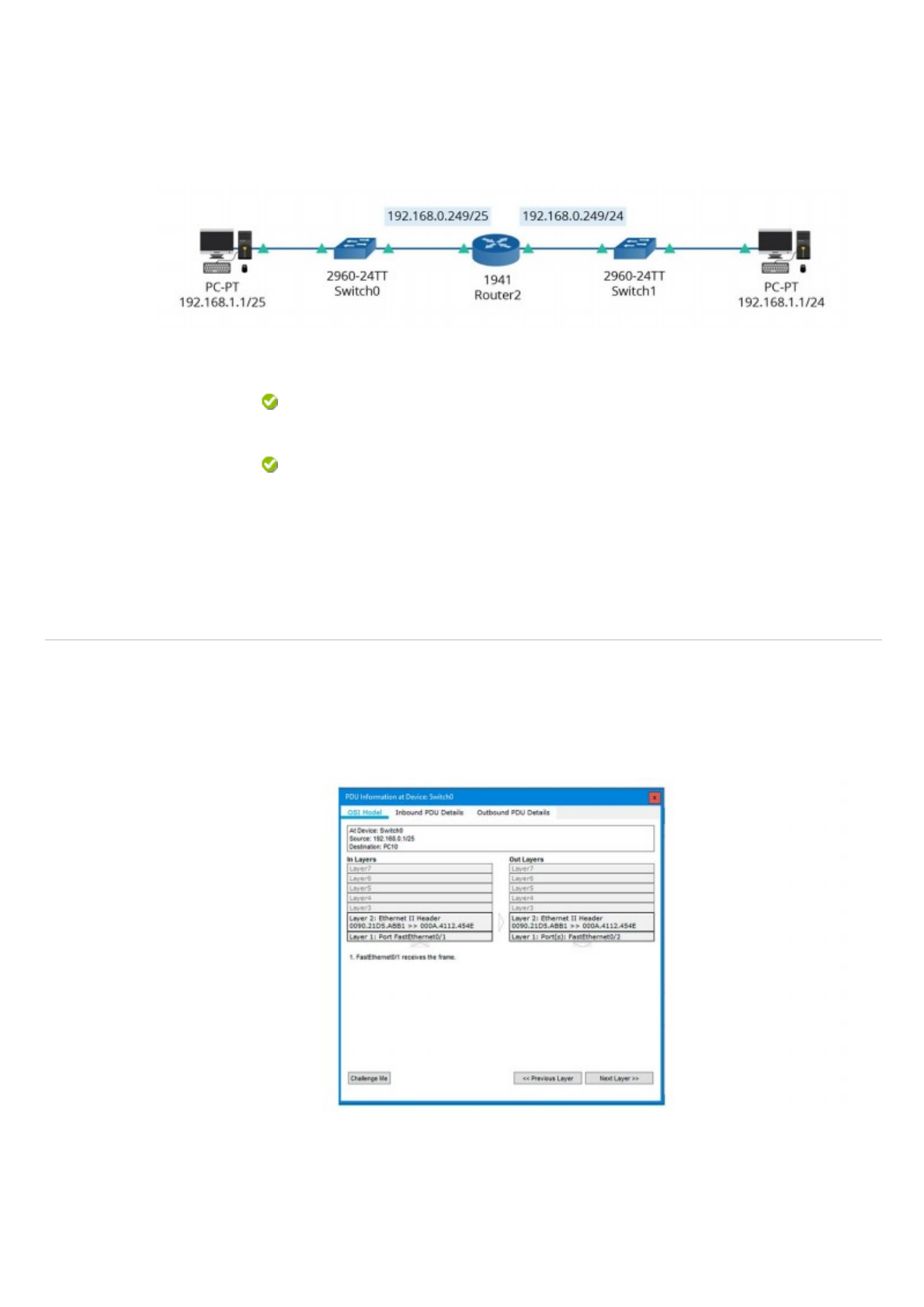 20/06/2020 Revisar envio do teste: ATIVIDADE 4 (A4) – 2020.1 REDES ... https://unp.blackboard.com/webapps/assessment/review/review.jsp?attempt_id=_31581891_1&course_id=_561210_1&content_id=_12655563_1… 1/7 Pergunta 1 Resposta Selecionada: Resposta Correta: Feedback da resposta: O Cisco Packet Tracer pode ser utilizado para a simulação da comutação de pacotes em nível de rede, utilizando o dispositivo roteador. Esse cenário ajuda a reproduzir ambientes em que temos diferentes sub-redes interligadas, definidas a partir das máscaras de sub-rede. Na figura a seguir, as interfaces do roteador e os endereços dos computadores estão configurados conforme as informações presentes. Fonte: Elaborada pelo autor. Em relação a este cenário apresentado, assinale a alternativa correta. O computador 192.168.0.1/25 não está na mesma rede da interface do roteador 192.168.0.249/25, portanto, não haverá comunicação entre estes. O computador 192.168.0.1/25 não está na mesma rede da interface do roteador 192.168.0.249/25, portanto, não haverá comunicação entre estes. Resposta correta. Esta resposta está correta, pois o endereço IP 192.168.0.249/25 atribuído na interface do roteador tem como endereço de rede 192.168.0.128, enquanto o endereço de rede do computador com IP 192.168.0.1/25 tem como endereço de rede 192.168.0.0, ou seja, estão em sub-redes diferentes. Assim, o computador não conseguirá comunicação com o computador 192.168.1.1/24 por meio desse roteador. Pergunta 2 No ambiente de simulação do Cisco Packet Tracer , é possível monitorar os eventos que ocorrem no tráfego de pacotes (PDU) do cenário criado, pela lista de eventos (event list ). Nesta lista, eventos podem ser selecionados e um detalhamento maior da PDU pode ser apresentado para uma análise com maior profundidade. Fonte: Elaborada pelo autor. Com relação à figura, analise as afirmativas abaixo e assinale V para a(s) verdadeira(s) e F para a(s) falsa(s): 1. ( ) O quadro Ethernet está sendo direcionado para o endereço físico 000A.4112.454E. 2. ( ) O evento mostra uma PDU entrante no switch pela interface da porta Fast Ethernet fa0/2. 1 em 1 pontos 1 em 1 pontos 20/06/2020 Revisar envio do teste: ATIVIDADE 4 (A4) – 2020.1 REDES ... https://unp.blackboard.com/webapps/assessment/review/review.jsp?attempt_id=_31581891_1&course_id=_561210_1&content_id=_12655563_1… 2/7 Resposta Selecionada: Resposta Correta: Feedback da resposta: 3. ( ) O quadro Ethernet tem como origem o equipamento com endereço 192.168.0.2 entrando pela interface fa0/1. 4. ( ) O endereço físico 0090.21D5.ABB1 corresponde ao endereço MAC do quadro entrante no switch. Assinale a alternativa que apresenta a sequência correta: V, F, F, V. V, F, F, V. Resposta correta. A sequência está correta, pois o quadro Ethernetapresenta como endereço físico de origem 0090.21D5.ABB1 e endereço de destino 000A.4112.454E. Este quadro entra no switch pela interfaceFast Ethernet fa0/1 e sai pela interface Fast Ethernet fa0/2. Pergunta 3 Foi implementado o cenário a seguir na ferramenta Cisco Packet Tracer , contendo três roteadores interligados e duas redes locais em diferentes localidades. A primeira rede local está na sub-rede 172.16.0.0/16, enquanto a segunda rede local está na sub-rede 192.168.0.0/24. Fonte: Elaborada pelo autor. Testes de ping foram realizados entre estas duas redes, e somente o computador com endereço IP 172.16.0.3/16 não está conseguindo obter resposta no comandoping para o endereço IP 192.168.0.2/24. Já o computador com endereço IP 172.16.0.2/16 está conseguindo executar o comando ping para o computador 192.168.0.2/24 com sucesso. Com base no comando ipconfig no computador 172.16.0.3/16, foi possível descobrir o problema. Fonte: Elaborada pelo autor. 1 em 1 pontos 20/06/2020 Revisar envio do teste: ATIVIDADE 4 (A4) – 2020.1 REDES ... https://unp.blackboard.com/webapps/assessment/review/review.jsp?attempt_id=_31581891_1&course_id=_561210_1&content_id=_12655563_1… 3/7 Resposta Selecionada: Resposta Correta: Feedback da resposta: Nesse sentido, assinale a alternativa que indica o problema da falha no teste de pingapresentado. Está faltando a configuração do endereço IP do default gateway. Está faltando a configuração do endereço IP do default gateway. Resposta correta. Esta alternativa está correta, pois, pelo resultado do comando ipconfig, o endereço IP do default gateway está com o valor 0.0.0.0. Nesse caso, o computador 172.16.0.3 não conseguirá atingir ogateway no roteador Router 0, o qual permitirá a comunicação com a rede 192.168.0.0. Pergunta 4 Resposta Selecionada: Resposta Correta: Feedback da resposta: Leia o excerto a seguir: “Existem duas escolhas básicas para conectar redes diferentes: podemos criar dispositivos que traduzem ou convertam pacotes de cada tipo de rede em pacotes para outra rede ou, como bons cientistas de computação, podemos tentar resolver o problema acrescentando uma camada de abstração, criando uma camada comum em cima das diferentes redes. De qualquer forma, os dispositivos são colocados nas fronteiras entre as redes.” TANENBAUM, A. S.; WETHERALL, D. Redes de computadores . 5. ed. São Paulo: Pearson Prentice Hall, 2011. p. 267. Assinale a alternativa que apresenta o campo na opção Desktop->IP Configuration do PC para permitir a comunicação deste computador com outras sub-redes utilizando endereçamento IPv4. Default Gateway Default Gateway Resposta correta. Esta alternativa está correta, pois o campo Default Gateway indica o endereço da rede do elemento Gateway que irá fazer a interligação com outras sub- redes. Este endereço IP deve fazer parte da mesma sub-rede do computador que deseja fazer esta comunicação. Pergunta 5 No cenário a seguir, temos uma rede construída no Cisco Packet Tracer, composta por dois roteadores, Router A e Router B, os quais são interligados pela rede 10.0.0.0. No Router A, temos a conexão da rede