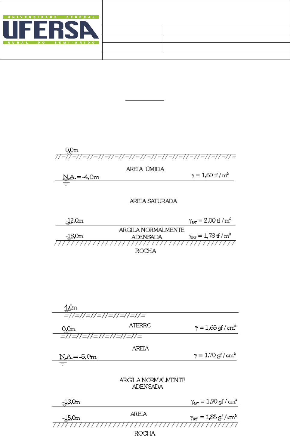 UNIVERSIDADE FEDERAL RURAL DO SEMI-ÁRIDO DEP. DE CIÊNCIAS AMBIENTAIS E TECNOLÓGICAS CAMPUS MOSSORÓ/RN DISCIPLINA Mecânica dos Solos II PROFESSOR Me. Manoel Leandro Araújo e Farias SEMESTRE 2020.3 ATIVIDADE 03 ATENÇÃO: A organização e a clareza na resolução das questões são critérios de avaliação. QUESTÕES 1) Qual será o recalque total devido ao adensamento da camada de argila indicada no perfil a seguir, caso seja provocado um rebaixamento do lençol d’água de 3,00 m. Dados da camada de argila: CV = 6 x 10 -4 cm2/s; e0 = 1,19; LL = 54%. 2) Qual será o tempo necessário para que ocorra um recalque por adensamento de 33 cm, causado pelo aterro construído recentemente numa extensa área, esquematizado no perfil abaixo. Dados da camada de argila: CC = 0,6; CV = 10 -4 cm²/seg; e0 = 1,2. 3) Uma camada de argila com espessura de 6m e dupla face drenante é submetida a uma carga uniformemente distribuída de 6,1 t/m2. Um ano após o carregamento, 50% do adensamento médio da camada já ocorreu. Qual o valor do coeficiente de adensamento? Calcule o tempo associado a 50% do adensamento para o caso de ser aplicado um carregamento igual ao dobro do anterior. 4) Um ensaio de adensamento foi realizado em amostra de argila. O tempo necessário para atingir uma porcentagem média de adensamento de 50% foi de 20 minutos. A amostra tem 2,5cm de espessura e seu teor de umidade inicial é 40%. Pede- se o coeficiente de adensamento e o tempo para uma camada de 3m de espessura e drenagem simples atingir 90% de recalque? 5) Duas camadas argilosas idênticas foram adensadas para a mesma sobrecarga. A primeira camada apresentou uma porcentagem média de adensamento de 50% após decorridos 20 minutos, enquanto que a segunda apresentou uma porcentagem média de 90% após decorridos 40 minutos. Estas observações estão corretas? Explique. 6) Uma camada de argila de 1,5m de espessura está localizada entre 2 camadas drenantes. No centro da camada de argila, a tensão total vertical inicial é 200kPa e a poro- pressão é 100kPa. O aumento de tensão vertical causado pela construção de uma estrutura, no centro da camada de argila será de 100kPa. Qual será a tensão vertical efetiva no centro da camada e o excesso de poro pressão quando 60% do recalque acontecer?