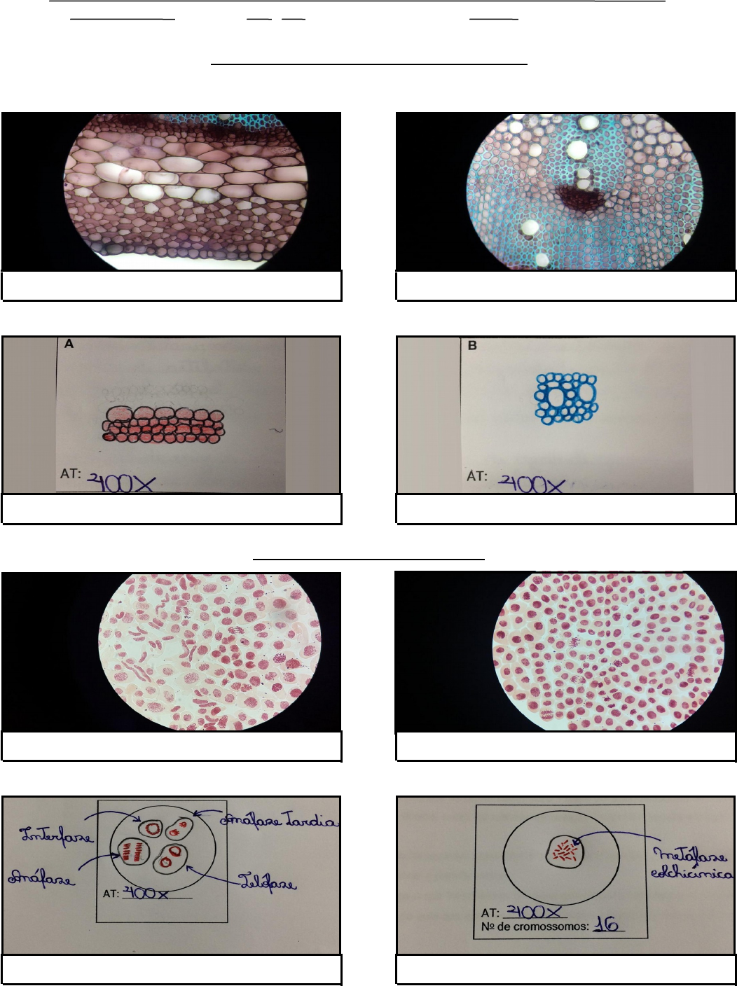 GBI175 – MICROSCOPIA DE LUZ PARA O ESTUDO DAS CÉLULAS Portfólio do relatório 10 – Coleta, fixação, preparo e observação ao microscópio Nome: Bancada: Data: / /2019 Turma: Atividade: Preparo de lâminas permanentes Parede primária rica em celulose (Imagem) Parede secundária rica em lignina (Imagem) Parede primária rica em celulose (Apostila) Parede secundária rica em lignina (Apostila) Atividade: Fases do ciclo celular AT: 400 X AT: 400 X Esquema da apostila (Parede 2ária) Esquema da apostila (Parede 1ária) AT: 400 X (Fases do ciclo: Imagem) AT: 400 X (Fases do ciclo: Imagem) Esquema da apostila (Metáfase colchicínica) Esquema da apostila (Fases do ciclo celular)