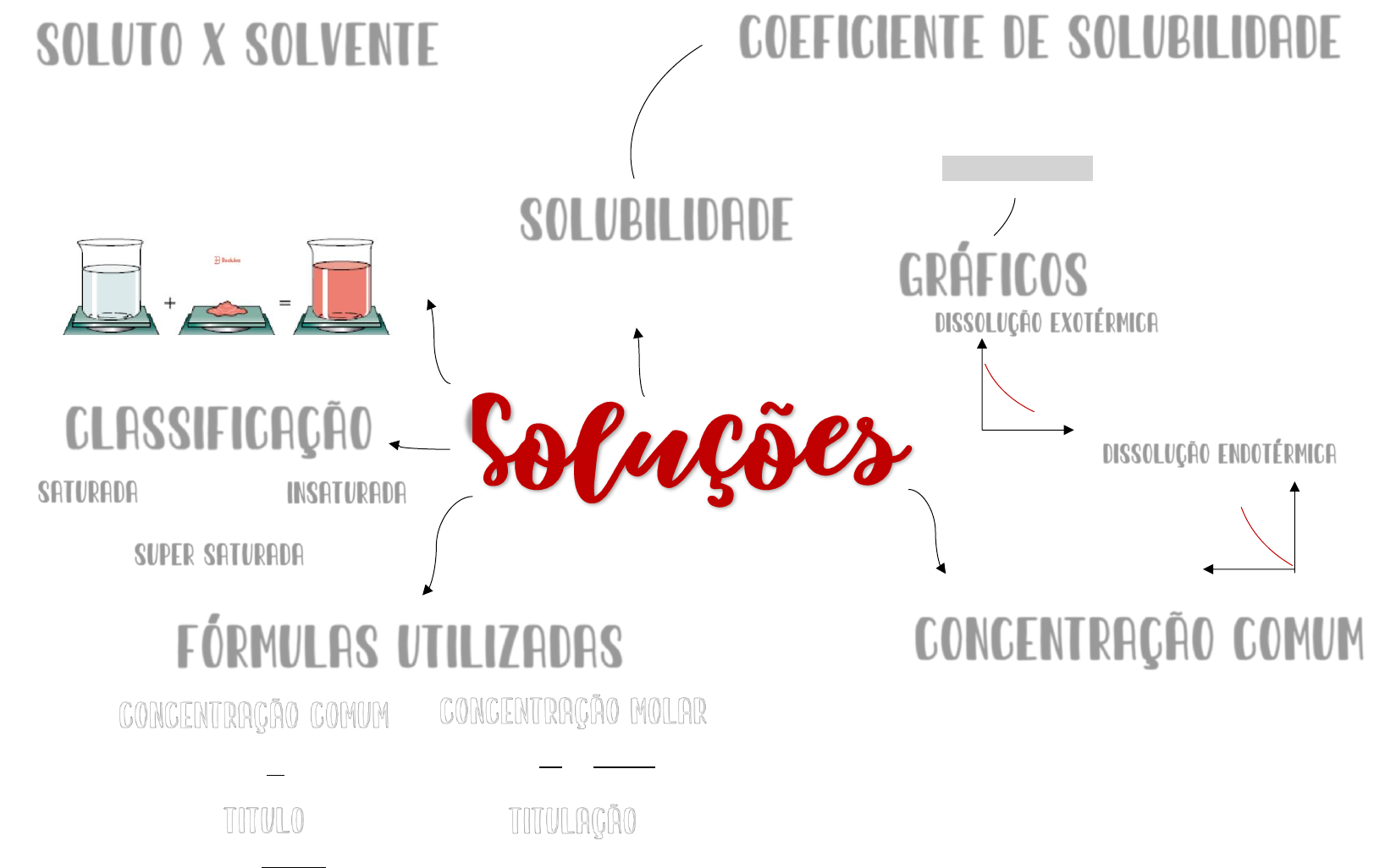 As soluções químicas são misturas homogêneas formadas por duas ou mais substâncias Soluto x solvente As soluções químicas são misturas homogêneas formadas por duas ou mais substâncias As soluções químicas são misturas homogêneas formadas por duas ou mais substâncias substância que se encontra dispersa no solvente, é presente em menor quantidade na solução. substância na qual o soluto será dissolvido apresenta-se em maior quantidade na solução. Classificação saturada insaturada Super saturada soluto = Cs soluto < Cs soluto > Cs é a aptidão que um corpo ou matéria tem de se dissolver, ou não, em determinado tipo de líquido. é definido como a capacidade máxima que determinado soluto tem de se dissolver em uma determinada quantidade de solvente. Esse elemento é representado pelas letras “Cs”. Usamos a seguinte fórmula para definir o valor do coeficiente: Cs = 100 . m1 /m2 Dissolução exotérmica Dissolução endotérmica Solubilidade g do soluto/100g de água por temperatura x Solubilidade g do soluto/100g de água por temperatura x A medida da quantidade de um determinado soluto dissolvido em certo volume de solução é denominada de concentração comum. Assim, esse tipo de concentração é uma das formas de se trabalhar a quantidade ou teor dos componentes de uma solução. A concentração comum nada mais é do que a relação matemática estabelecida entre a massa do soluto dissolvida em certo volume de solução CONCENTRAÇÃO COMUM 𝑪 = 𝑴 𝑽 CONCENTRAÇÃO MOLAR 𝑴 = 𝒏𝟏 𝑽 = 𝒎𝟏 𝒎𝟐 𝒙 𝑽 TITULAÇÃO 𝑪𝒇 × 𝑽𝒇 = 𝑪𝒊 × 𝑽𝒊 + 𝑪𝟐 × 𝑽𝟐 TITULO 𝑇𝑚 = 𝑚1 𝑥 % 𝑚 SOLUTO SOLVENTE SOLUÇÃO Concentração comum solubilidade Coeficiente de solubilidade gráficos Fórmulas utilizadas