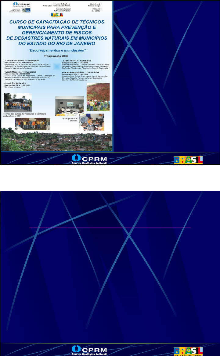 1 Ministério de Minas e EnergiaCiências da Terra para a Sociedade Curso de Capacitação de Técnicos Municipais para Prevenção e Gerenciamento de Riscos de Desastres Naturais SERVIÇO GEOLÓGICO DO BRASIL CPRM Ministério de Minas e EnergiaCiências da Terra para a Sociedade PÚBLICO-ALVO Técnicos municipais envolvidos com o tema 2 Ministério de Minas e EnergiaCiências da Terra para a Sociedade OBJETIVO Capacitar os técnicos municipais para realizar o gerenciamento de áreas de risco sujeitas a escorregamentos, enchentes e inundações, incluindo uma proposta que contemple a participação ativa das comunidades. Ministério de Minas e EnergiaCiências da Terra para a Sociedade INSTITUIÇÕES ENVOLVIDAS MUNICIPIOS DO ESTADO DO RIO DE JANEIRO 3 Ministério de Minas e EnergiaCiências da Terra para a Sociedade Onde ocorrem os problemas? O que e como ocorre? Quando ocorrem os problemas? O que fazer? Identificação da Tipologia do Processo Mapeamento das Áreas de Risco Correlação com condições hidrometeorológicas adversas, Monitoramento Medidas Estruturais e Não-Estruturais 4 PERGUNTAS BÁSICAS Para o gerenciamento de áreas urbanas com riscos de escorregamentos e inundações Ministério de Minas e EnergiaCiências da Terra para a Sociedade MODELO DE ABORDAGEM DA UNDRO 1. Identificação dos riscos 2. Análise dos riscos 3. Medidas de prevenção 4. Planejamento para situações de emergência 5. Informações públicas e treinamento (Office of the United Nations Disasters Relief Co-Ordinator) Sequência de ações de Prevenção e Preparação, segundo os programas de Mitigações de Desastres, 1991 4 Ministério de Minas e EnergiaCiências da Terra para a Sociedade RISCOS AMBIENTAIS RISCOS NATURAIS RISCOS SOCIAISRISCOS TECNOLÓGICOS RISCOS FÍSICOS RISCOS BIOLÓGICOS RISCOS GEOLÓGICOS RISCOS ATMOSFÉRICOS RISCOS HIDROLÓGICOS RISCOS ASSOCIADOS À FAUNA RISCOS ASSOCIADOS À FLORA ENDÓGENOS EXÓGENOS ASSALTOS, GUERRAS, SEQUESTROS, ATENTADOS, ETC VAZAMENTOS DE PRODUTOS TÓXICOS, RADIOATIVOS, INFLAMÁVEIS, COLISÃO, ETC FURACÃO, SECA, RAIO, TEMPESTADE, ETC ENCHENTES E INUNDAÇÕES TERREMOTOS, VULCÕES, TSUNAMIS DOENÇAS, PRAGAS, PICADAS, ETC DOENÇAS, PRAGAS, ERVAS TÓXICAS, ETC ESCORREGAMENTOS, SOLAPAMENTOS EROSÃO, ASSOREAMENTO, SUBSIDÊNCIA, ETC Ministério de Minas e EnergiaCiências da Terra para a Sociedade A AA AÇÇÃO ANTRÃO ANTRÓÓPICA PICA –– INTERVENINTERVENÇÇÕES COMO AGENTES ÕES COMO AGENTES INDUTORESINDUTORES 5 Ministério de Minas e EnergiaCiências da Terra para a Sociedade Exemplo em Nova Friburgo – Janeiro/2007 recorrência estimada de precipitação ~70 anos Ministério de Minas e EnergiaCiências da Terra para a Sociedade Floresta Formigão Vilage Progresso Lazareto Riograndina São Geraldo Janeiro / 2007 Consequências em Nova Friburgo: 6 Ministério de Minas e EnergiaCiências da Terra para a Sociedade PROPOSTA DE MÉTODO PARA MAPEAMENTO PRÉ-SETORIZAÇÃO PERCEPÇÃO E PARÂMETROS BÁSICOS SETORIZAÇÃO Feita com o auxílio de FICHAS DE CAMPO (check list) Ministério de Minas e EnergiaCiências da Terra para a Sociedade PROPOSTA DE MÉTODO PARA MAPEAMENTO SETORIZAÇÃO • feita com o auxílio de FICHAS DE CAMPO (check list) • uso de plantas, mapas, ou mesmo guias de ruas • uso de fotografias aéreas, imagens de satélite • uso de fotografias oblíquas de baixa altitude (helicóptero) • trabalhos de campo com equipe treinada • conhecimento do histórico da área • DETERMINAÇÃO DO GRAU DE PROBABILIDADE DE OCORRÊNCIA DO PROCESSO OU MESMO DORISCO DO SETOR 7 Ministério de Minas e EnergiaCiências da Terra para a Sociedade ROTEIRO DE CADASTRO DE RISCO DE ESCORREGAMENTOS – Check List Ministério de Minas e EnergiaCiências da Terra para a Sociedade SETOR 1 (R4) SETOR 3 (R2) SETOR 4 (R1) EXEMPLO DE SETORIZAÇÃO 8 Ministério de Minas e EnergiaCiências da Terra para a Sociedade DETERMINAÇÃO DO GRAU DE RISCO As evidências de instabilidade (trincas no solo, degraus de abatimento em taludes, trincas em moradias ou em muros de contenção, árvores ou postes inclinados, cicatrizes de escorregamento, feições erosivas, proximidade da moradia em relação ao córrego etc.) são expressivas e estão presentes em grande número e/ou magnitude. Mantidas as condições existentes, é muito provável a ocorrência de eventos destrutivos durante episódios de chuvas intensas e prolongadas. R4 Muito Alto Observa-se a presença de significativa(s) evidência(s) de instabilidade (trincas no solo, degraus de abatimento em taludes etc.) Mantidas as condições existentes, é perfeitamente possível a ocorrência de eventos destrutivos durante episódios de chuvas intensas e prolongadas. R3 Alto Observa-se a presença de alguma(s) evidência(s) de instabilidade (encostas e margens de drenagens), porém incipiente(s). Mantidas as condições existentes, é reduzida a possibilidade de ocorrência de eventos destrutivos durante episódios de chuvas intensas e prolongadas. R2 Médio Não há indícios de desenvolvimento de processos destrutivos em encostas e margens de drenagens. Mantidas as condições existentes, não se espera a ocorrência de eventos destrutivos. R1 Baixo DescriçãoGraus de Risco Ministério de Minas e EnergiaCiências da Terra para a Sociedade EXEMPLO DE SETORIZAÇÃO DE RISCO 9 Ministério de Minas e EnergiaCiências da Terra para a Sociedade CONCEPÇÃO DAS INTERVENÇÕES Ministério de Minas e EnergiaCiências da Terra para a Sociedade Q Implantar o Plano Preventivo de Defesa Civil com o objetivo de reduzir a vulnerabilidade das comunidades em risco. Q Implantação de sistema de alerta preventivo para ocorrência de chuvas intensas. Q Constituir, juntamente com moradores voluntários das áreas de risco, núcleos de defesa civil (NUDECs). Q Estimular e capacitar essas pessoas a compartilhar com a gestão municipal as atividades de prevenção, auto-defesa e atendimento emergencial. Q Implantar programas de educação a