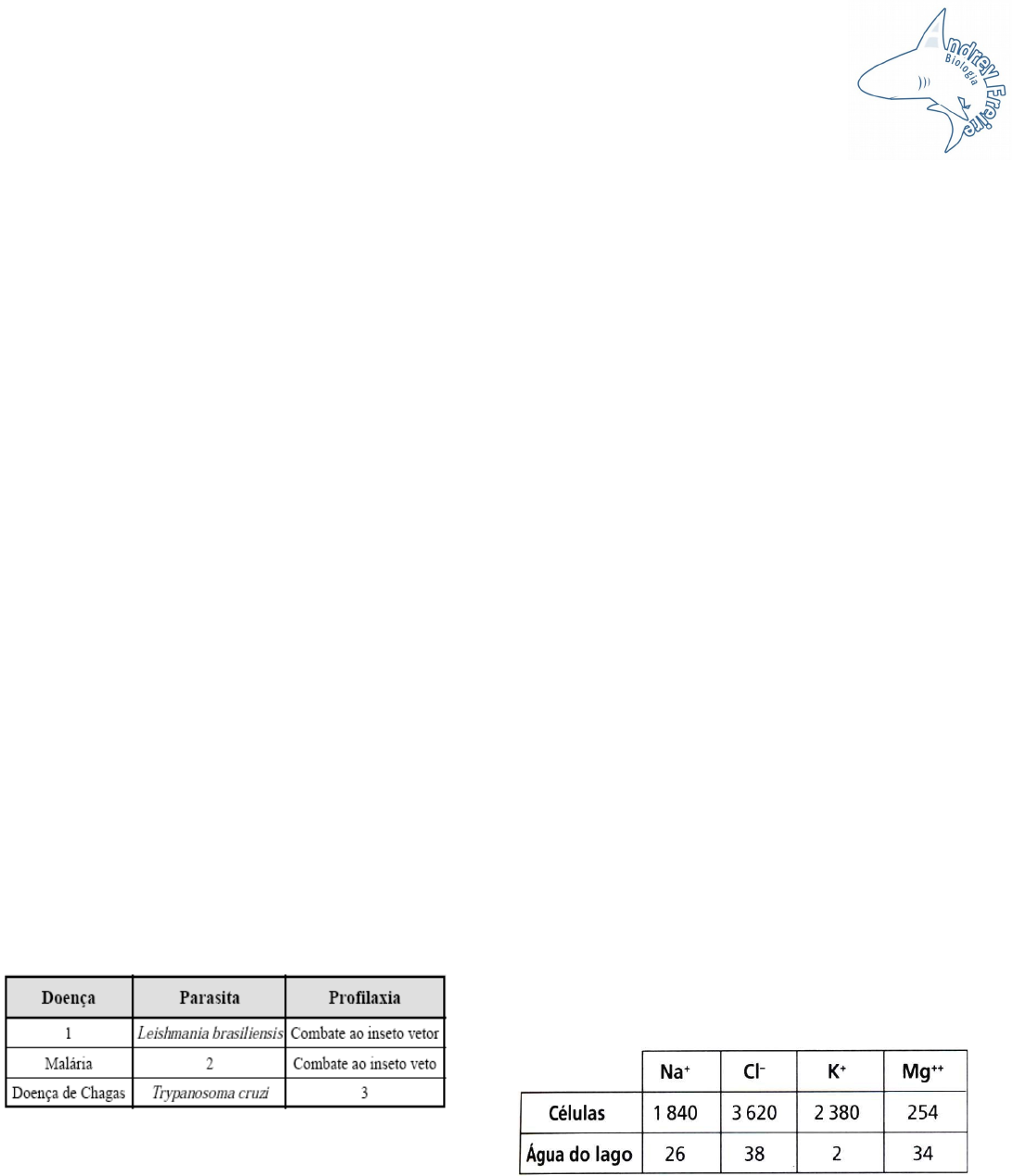 Simulado 9 Prof.: Andrey Freire 1. Univali-SC “No Brasil, a diarréia é responsável pela morte de 5.000 crianças por ano (4.200 até um ano deidade). O grande vilão apontado pelos médicos é o rotavírus. Desde a sua descoberta, em 1973, os virologistas têm se dedicado à produção de uma vacina, para tentar irradicar a doença. A vacina vem sendo testada desde o início da década, porém com um índice de eficiência (75%) menor que o da vacina contra o sarampo (95%). No entanto, o produto final, aprovado, agora, nos E.U.A., é dez vezes mais potente. A nova versão da vacina deverá ser testada, aqui no Brasil,ainda este ano. Se apresentar bons resultados em termos de efeitos colaterais, deverá fazer partedo calendário de vacinação.” VEJA, 23/09/1998. A vacinação contra vírus exige a infecção por microorganismos vivos, previamente enfraquecidos, desenvolvidos em meios de cultura especiais. Esses vírus: a) conservam os anticorpos indispensáveis à imunização; b) conservam os antígenos indispensáveis à imunização; c) são atacados por antígenos fabricados pelo organismo vacinado; d) induzem a formação de antígenos; e) induzem o desenvolvimento da doença. 2. Mackenzie-SP Assinale a alternativa que NÃO apresenta correspondência entre a doença, o agente causador e o agente transmissor. a) febre amarela, vírus e Aedes aegypti b) dengue, vírus e Aedes aegypti c) malária, protozoário e Anopheles d) elefantíase, protozoário e Culex e) doença de Chagas, protozoário e Triatoma 3. UFCE Considere o quadro abaixo. Assinale a alternativa que contém os itens que completam corretamente o quadro acima, substituindo, respectivamente, os números 1, 2 e 3: a) Leishmaniose tegumentar – Plasmodium vivax – combate ao inseto vetor. b) Leishmaniose visceral – Plasmodium malariae – Combate ao caramujo vetor. c) Calazar – Plasmodium vivax – Combate aos roedores. d) Leishmaniose tegumentar – Plasmodium falciparum – Combate aos roedores. e) Calazar – Plasmodium malariae – Combate ao inseto vetor. 4. (UF-PA) Sobre as funções dos tipos de retículo endoplasmático, pode–se afirmar que: a) o rugoso está relacionado com o processo de síntese de esteróides; b) o liso tem como função a síntese de proteínas; c) o liso é responsável pela formação do acrossomo dos espermatozóides; d) o rugoso está ligado à síntese de proteína; e) o liso é responsável pela síntese de poliolosídios. 5. (UF-CE) O aspecto comum do Complexo de Golgi, em células animais, deduzindo através de observações ao microscópio eletrônico, é de: a) vesículas formadas por dupla membrana, sendo a interna sem granulações e com dobras voltadas para o interior; b) membranas granulosas delimitando vesículas e sacos achatados, que dispõem paralelamente; c) um complexo de membranas formando tubos anastomosados, com dilatações em forma de disco; d) sacos e vesículas achatadas, formadas por membrana dupla em que a interna, cheia de grânulos, emite para o interior prolongamentos em forma de dobras; e) membranas lisas delimitando vesículas e sacos achatados, que se dispõem paralelamente. 6. (VUNESP) Numa célula eucariótica, a síntese de proteínas, a síntese de esteróides e a respiração celular estão relacionadas, respectivamente: a) ao Complexo de Golgi, às mitocôndrias, aos ribossomos; b) ao retículo endoplasmático liso, ao retículo endoplasmático granular, ao Complexo de Golgi; c) aos ribossomos, ao retículo endoplasmático liso, às mitocôndrias; d) ao retículo endoplasmático granular, às mitocôndrias, ao Complexo de Golgi; e) ao retículo endoplasmático liso, ao Complexo de Golgi, às mitocôndrias. 7. (UMC-SP) Os resultados da dosagem da concentração de determinados íons no meio intracelular de uma alga de água doce e da água do lago, que é seu habitat, estão mostrados na tabela abaixo (em mg/L). Analisando esses dados, pode-se inferir que as células dessa alga absorvem esses íons por: a) difusão, b) osmose e transporte ativo. c) osmose, d) difusão e osmose. e) transporte ativo. 8. (UFSE) Um protista endoparasita do intestino de um inseto é transferido para um recipiente com água doce. Espera-se que esse protista: a) perca moléculas de água por osmose até murchar. b) permaneça inalterado por ser impermeável à água. c) absorva moléculas de água por transporte ativo até se romper. d) perca moléculas de água por difusão até murchar. e) absorva moléculas de água por osmose até se romper. 9. (ENEM) As áreas numeradas no gráfico mostram a composição em volume, aproximada, dos gases na atmosfera terrestre, desde a sua formação até os dias atuais. Considerando apenas a composição atmosférica, isolando outros fatores, pode-se afirmar que: I. não podem ser detectados fósseis de seres aeróbicos anteriores a 2,9 bilhões de anos. II. as grandes florestas poderiam ter existido há aproximadamente 3,5 bilhões de anos. III. o ser humano poderia existir há aproximadamente 2,5 bilhões de anos. É correto o que se afirma em: a) I, apenas. b) II, apenas. c) I e II, apenas. d) II e III, apenas. e) I, II e III. 10. (ENEM) O gráfico abaixo representa a evolução da quantidade de oxigênio na atmosfera no curso dos tempos geológicos. O número 100 sugere a quantidade atual de oxigênio na atmosfera, e os demais valores indicam diferentes porcentagens dessa quantidade. De acordo com o gráfico é correto afirmar que: a) as primeiras formas de vida surgiram na ausência de O2. b) a atmosfera primitiva apresentava 1% de teor de oxigênio. c) após o início da fotossíntese, o teor de oxigênio na atmosfera mantém-se estável. d) desde o Pré-cambriano, a atmosfera mantém os mesmos níveis de teor de oxigênio. e) na escala evolutiva da vida, quando surgiram os anfíbios, o teor de oxigênio atmosférico já se havia estabilizado.