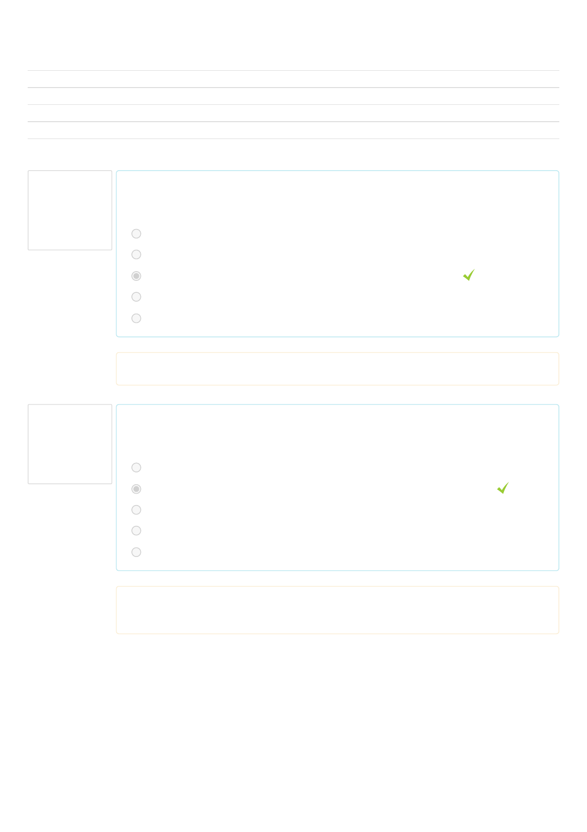 / ► 3º ANO ► Questão 1 Correto Atingiu 0,20 de 0,20 Questão 2 Correto Atingiu 0,20 de 0,20 Iniciado em Estado Concluída em Tempo empregado Avaliar 2,00 de um máximo de 2,00(100%) A área do trapézio também pode ser descoberta, além da sua fórmula, através: Escolha uma: a. De um quadrado dividido por dois b. Da soma da área de um quadrado com a soma de um triângulo c. Da soma da área de um retângulo com a soma de um triângulo d. Da soma da área de quatro triângulos iguais e. De um retângulo dividido por dois A resposta correta é: Da soma da área de um retângulo com a soma de um triângulo. A matriz Identidade é uma matriz: Escolha uma: a. Feita somente com números zeros b. Com a diagonal principal igual a uns e demais elementos iguais a zero c. Com uma linha de uns e demais elementos iguais a zero d. Feita somente com números uns e. Com uma coluna de uns e demais elementos iguais a zero A resposta correta é: Com a diagonal principal igual a uns e demais elementos iguais a zero. http://supletivounicanto.com.br/unieduc/my/ http://supletivounicanto.com.br/unieduc/course/view.php?id=16 http://supletivounicanto.com.br/unieduc/course/view.php?id=16#section-3 http://supletivounicanto.com.br/unieduc/mod/quiz/view.php?id=123 / Questão 3 Correto Atingiu 0,20 de 0,20 Questão 4 Correto Atingiu 0,20 de 0,20 Questão 5 Correto Atingiu 0,20 de 0,20 Quanto a multiplicação de matrizes, é correto afirmar que: Escolha uma: a. Não existe multiplicação de matrizes b. É calculado da mesma forma que efetuamos soma e subtração de matrizes c. Não é possível multiplicar matrizes com valores negativos d. O número de colunas da primeira matriz deve ser igual ao número de linhas da segunda matriz e. Só é possível multiplicar matrizes quadradas A resposta correta é: O número de colunas da primeira matriz deve ser igual ao número de linhas da segunda matriz. Uma Matriz Linha é uma matriz: Escolha uma: a. Que não possui linhas b. Que possui uma única Linha c. Que possui uma única coluna d. Que não possui colunas e. Que possui a mesma quantidade de linhas e colunas A resposta correta é: Que possui uma única Linha. O Teorema de Pitágoras serve para: Escolha uma: a. Calcular o perímetro de figuras geométricas b. Calcular lados desconhecidos de um triângulo qualquer c. Calcular lados desconhecidos de um triângulo retângulo d. Calcular lados desconhecidos de um trapézio e. Calcular a área de um triângulo A resposta correta é: Calcular lados desconhecidos de um triângulo retângulo. / Questão 6 Correto Atingiu 0,20 de 0,20 Questão 7 Correto Atingiu 0,20 de 0,20 Questão 8 Correto Atingiu 0,20 de 0,20 As determinantes das matrizes só podem ser calculadas quandas estas são matrizes quadradas. Quando a matriz não é quadrada, temos como resultado: Escolha uma: a. Sempre dizemos que a determinante está incompleta. b. Apenas números positivos. c. Apenas números negativos. d. Sempre dizemos que a determinante é zero. e. Nenhum resultado, pois este não existe. A resposta correta é: Nenhum resultado, pois este não existe.. A figura geométrica de maior importância, pois permite que através de sua área, possamos descobrir a área de todas as outras figuras geométricas, é: Escolha uma: a. O Trapézio b. O Retângulo c. O Quadrado d. O Triângulo e. O Círculo A resposta correta é: O Triângulo. Se dois pontos não estão sobre a reta numérica, para calcular a distância entre eles será necessário: Escolha uma: a. De um triângulo eqüilátero que passe sobre eles b. Calcular o ângulo que as duas fazem sobre uma reta imaginária c. Criar duas retas numéricas e subtrair uma da outra d. Das coordenadas dos dois pontos no plano cartesiano e. De passar duas retas paralelas e usar o Teorema de Tales A resposta correta é: Das coordenadas dos dois pontos no plano cartesiano. / Questão 9 Correto Atingiu 0,20 de 0,20 Questão 10 Correto Atingiu 0,20 de 0,20 A distância entre dois pontos quaisquer na reta numérica pode ser obtida através da seguinte forma: Escolha uma: a. Através do Teorema de Pitágoras b. Subtraindo da posição do maior ponto o menor ponto c. Somando-se a posição do menor ponto com a posição do maior ponto d. Somando as posições dos dois pontos e. Utilizando uma régua A resposta correta é: Subtraindo da posição do maior ponto o menor ponto. Uma matriz que possua dois números escritos na parte de fora dos colchetes, separados por um sinal de multiplicação, são: Escolha uma: a. A determinante da matriz b. A quantidade de colunas e linhas da matriz, nesta ordem c. A quantidade de linhas e colunas da matriz, nesta ordem d. O endereço dos elementos e. O endereço da matriz A resposta correta é: A quantidade de linhas e colunas da matriz, nesta ordem.