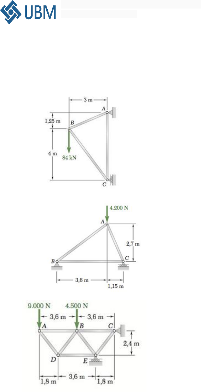 Mecânica dos Sólidos – 5ª Lista de Exercícios Profª Bárbara Drumond Exercícios 1) Usando o método dos nós, determine a força em cada elemento da treliça mostrada na figura. Indique se cada elemento está sob tração ou sob compressão. a) b) c) d) 2) Determine a força nos elementos FH, GH e GI da treliça de telhado mostrado na figura. 3) Uma treliça de ponte Warren é carregada tal como mostra a figura. Determine a força nos elementos CE, DE e DF.