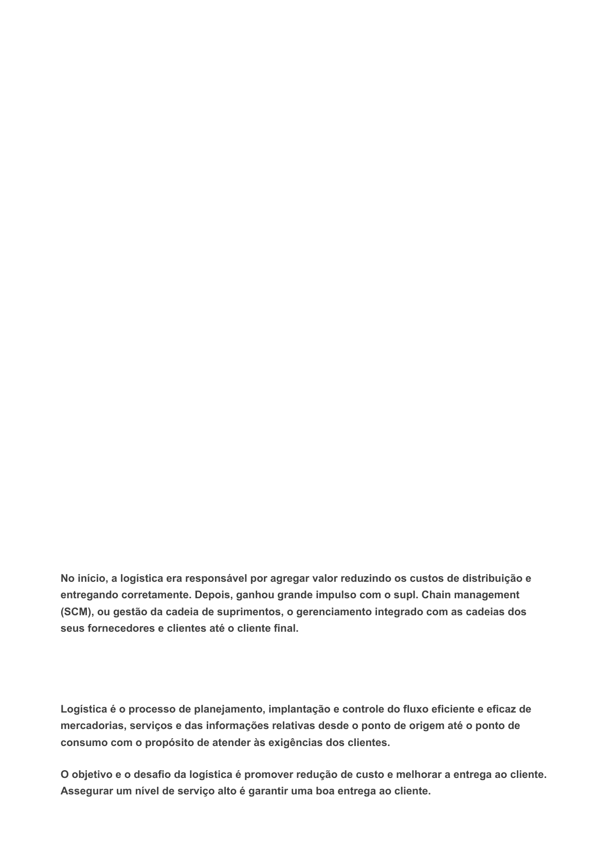 27/06/2020 Ultra https://sereduc.blackboard.com/ultra/courses/_24997_1/outline/assessment/_2141978_1/overview/attempt/_7518068_1/review?courseId=_2499… 1/6 Ocultar opções de resposta Pergunta 1 -- /0,6 Há algumas décadas estudiosos já vêm destacando a posição da logística no cenário empresarial e chamando a atenção para a crescente importância do setor. Sobre o que é a logística, sua origem e sua importância, assinale a alternativa INCORRETA. Incorreta: Sendo parte do processo de construção de valor, a logística acaba se tornando essencial para entregar ao cliente aquilo de que ela precisa. No início, a logística era responsável por agregar valor reduzindo os custos de distribuição e entregando corretamente. Depois, ganhou grande impulso com o supl. Chain management (SCM), ou gestão da cadeia de suprimentos, o gerenciamento integrado com as cadeias dos seus fornecedores e clientes até o cliente final. Resposta correta Foi a atividade logística militar da Primeira Guerra Mundial que deu origem a muitos dos conceitos logísticos utilizados atualmente. Logística é o processo de planejamento, implantação e controle do fluxo eficiente e eficaz de mercadorias, serviços e das informações relativas desde o ponto de origem até o ponto de consumo com o propósito de atender às exigências dos clientes. O objetivo e o desafio da logística é promover redução de custo e melhorar a entrega ao cliente. Assegurar um nível de serviço alto é garantir uma boa entrega ao cliente. Nota final Tentativa com a nota mais alta 3,6/6 1,8/6 Tentativa 1 Enviado: 23/05/20 17:56 (BRT) 27/06/2020 Ultra https://sereduc.blackboard.com/ultra/courses/_24997_1/outline/assessment/_2141978_1/overview/attempt/_7518068_1/review?courseId=_2499… 2/6 Ocultar opções de resposta Ocultar opções de resposta Pergunta 2 -- /0,6 A logística foi evoluindo ao longo do tempo, para o que chamamos de cadeia de suprimento. Sobre a logística e a cadeia de suprimentos, assinale a alternativa INCORRETA. O gerenciamento da cadeia de suprimento ou abastecimento (SCM, do inglês "supply chain management") engloba todas as atividades que envolvem materiais, do recebimento do pedido de vendas (ou previsão de vendas) à entrega ao cliente. Em decorrência das grandes mudanças globais, que afetam nossa economia e nosso mundo, devemos compreender os processos comerciais logísticos relevantes. Incorreta: A logística de suprimentos também é chamada de inbound. A logística de produção se inicia com o planejamento, a programação e o controle de estoque (PPCPE). Resposta correta A logística de produção representa o início do ciclo da cadeia logística. Esta é a etapa do processo de suprimento,+- em que são analisadas as demandas informadas pelo cliente para estabelecer o modelo logístico de suprimento de cada item. Pergunta 3 -- /0,6 Ter consciência de que o planejamento ajuda na tomada de decisão é fundamental para o sucesso do planejamento logístico. Sobre esse assunto, assinale a alternativa INCORRETA. Um sistema integrado de informações deve coletá-las, transformá-las, armazená-las e movimentá-las em todo o processo. 27/06/2020 Ultra https://sereduc.blackboard.com/ultra/courses/_24997_1/outline/assessment/_2141978_1/overview/attempt/_7518068_1/review?courseId=_2499… 3/6 Mostrar opções de resposta Ocultar opções de resposta Para a logística ser considerada eficaz, ela precisa apresentar algumas características, tais como: elaborar um pedido sempre perfeito; apresentar informações em tempo real e fazer o suprimento chegar aonde não chega hoje, assim como aonde os outros não chegam, com menor custo, mais rápido e com menor estoque. O planejamento apóia a operação da empresa e, no caso da logística, especificamente em relação aos estoques, a distribuição e a otimização dos custos logísticos. Incorreta: O principal objetivo do planejamento logístico é prever o comportamento do mercado e se adaptar a possíveis mudanças com a máxima antecedência possível. Resposta correta O sistema de informações logísticas (SIL) é um subsistema do sistema de informações gerenciais (SIG). Pergunta 4 -- /0,6 A redução de estoques é importante não apenas por causa do impacto financeiro, mas também dos problemas que eles podem mascarar. Sobre as estratégias para redução de estoques, assinale a alternativa INCORRETA. Pergunta 5 -- /0,6 Pesquisadores vêm destacando a posição da logística no cenário empresarial e chamando a atenção para a crescente importância do setor já há algumas décadas. Sobre o que é a logística, sua origem e sua importância, assinale a alternativa INCORRETA. Logística é o processo de planejamento, implantação e controle do fluxo eficiente e eficaz de mercadorias, serviços e das informações relativas desde o ponto de origem até o ponto de consumo com o propósito de atender às exigências dos clientes. 27/06/2020 Ultra https://sereduc.blackboard.com/ultra/courses/_24997_1/outline/assessment/_2141978_1/overview/attempt/_7518068_1/review?courseId=_2499… 4/6 Ocultar opções de resposta Incorreta: No início, a logística era responsável por agregar valor reduzindo os custos de distribuição e entregando corretamente. Depois, ganhou grande impulso com o supply chain management (SCM), ou gestão da cadeia de suprimentos, o gerenciamento integrado com as cadeias dos seus fornecedores e clientes até o cliente final. Foi a atividade logística militar da Segunda Guerra Mundial que deu origem a muitos dos conceitos logísticos utilizados atualmente. Sendo parte do processo de construção de valor, a logística acaba se tornando essencial para entregar ao cliente aquilo de que ela precisa. Resposta correta O objetivo e o desafio da logística é melhorar a entrega ao cliente. Assegurar um nível de serviço alto é garantir uma boa entrega ao cliente, mesmo que isso represente custo elevado. Pergunta 6 -- /0,6 Dentre os