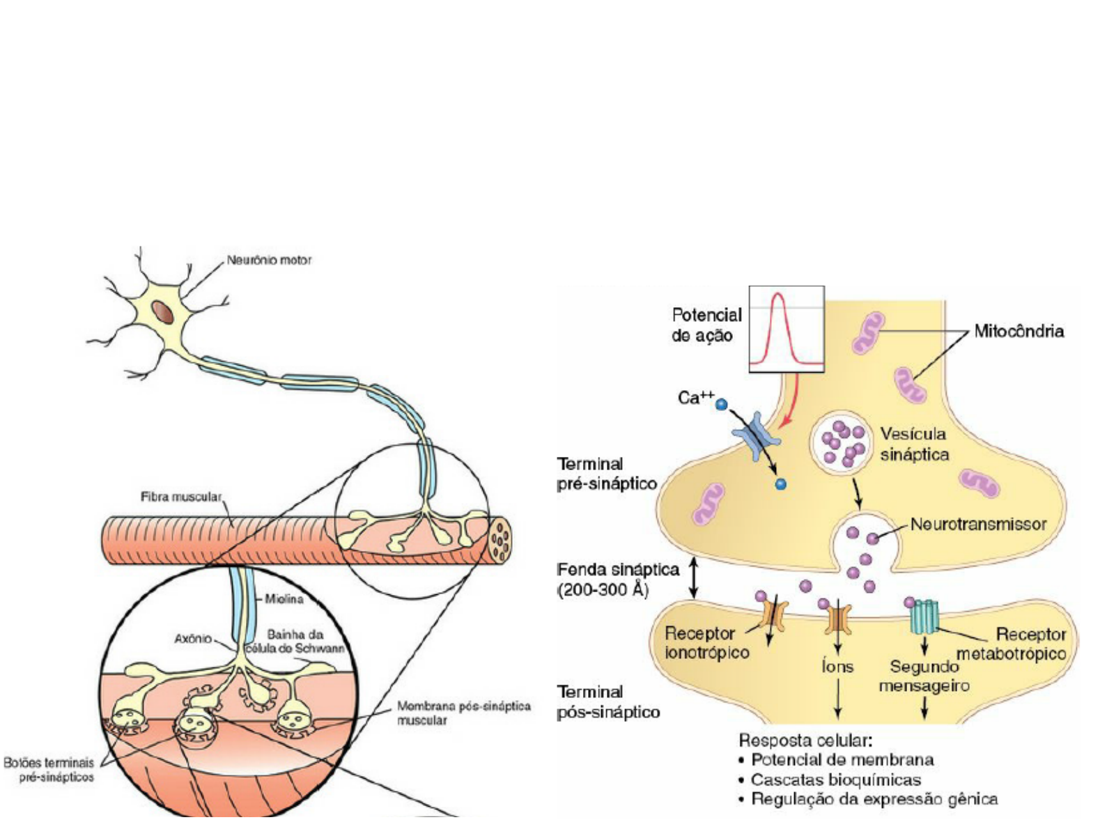 Transmissão Sináptica Fisiologia Animal I Sinapses A sinapse é o ponto de contato entre um neurônio e o neurônio seguinte. TIPOS DE SINAPSES — QUÍMICAS E ELÉTRICAS Os canais iônicos conectam o citoplasma das células pré-sináptica e pós-sináptica em uma junção comunicante. Ex: hipotálamo, no neocórtex, no hipocampo, no tálamo, musculatura lisa viceral e musculatura cardíaca Fenda sináptica, entre a membrana pré sináptica e a membrana pós-sináptica. O terminal pré-sináptico contém numerosas vesículas sinápticas repletas de neurotransmissor A membrana pós sináptica possui receptores para neurotransmissor específico. (gap junctions) Sinais são sempre transmitidos em uma única direção: - Neurônio Pré-Sináptico secreta o neurotransmissor para o neurônio no qual o neurotransmissor age, o Neurônio Pós- Sináptico. Condução “Unidirecional” nas Sinapses Químicas. fenda sináptica Potencial de Ação. A membrana pré-sináptica tem grande número de canais de cálcio dependentes de voltagem. Ca 2+ concentrado no lado externo da célula (2 mmol/ℓ) - interior da célula (0,0002 mmol/ℓ). Os neurotransmissores na fenda sináptica ligam-se a seus receptores pós-sinápticos específicos. Abertura dos canais regulados por ligantes. O tipo de neurotransmissor e seu receptor e s p e c í fi c o r e g u l a d o p o r l i g a n t e determinam que íons irão entrar ou sair. Neurotransmissores do SNP e do SNC SNP : acetilcolina (ACh), a norepinefrina e a epinefrina. SNC, diversas substâncias químicas: ACh, aminas, serotonina, dopamina, norepinefrina, epinefrina, glutamato, aspartato, glicina, ácido γ aminobutírico (GABA), peptídios e óxido nítrico Acetilcolina - colina e acetil coenzima A . Neurônios colinérgicos. Norepinefrina e a Epinefrina - aminoácidos Neurônios adrenérgicos SUBSTÂNCIAS QUÍMICAS QUE ATUAM COMO TRANSMISSORES SINÁPTICOS (1) células piramidais do córtex motor; (2) neurônios nos gânglios da base; (3) neurônios motores que inervam os músculos esqueléticos; (4) neurônios pré-ganglionares do sistema nervoso autônomo; (5) neurônios pós- ganglionares do sistema nervoso parassimpático; e (6) alguns dos neurônios pós-ganglionares do sistema nervoso simpático. - efeito excitatório; - efeitos inibitórios - ex: inibição do coração pelo nervo vago. Neurotransmissore de Moléculas Pequenas e de Ação Rápida Corpos celulares do tronco cerebral e no hipotálamo - Ex: aumento do nivel de vigília. - efeito excitatório; - efeitos inibitórios Mesencéfalo (subst negra) - ganglio da base sinapses da medula espinhal medula espinhal, cerebelo e cortex neurônios aferentes - PESP SUBSTÂNCIAS QUÍMICAS QUE ATUAM COMO TRANSMISSORES SINÁPTICOS SUBSTÂNCIAS QUÍMICAS QUE ATUAM COMO TRANSMISSORES SINÁPTICOS Receptores para neurotransmissores Mediante a at ivação de um “segundo mensageiro”( receptores metabotróficos) ,que no citoplasma da célula, ativa uma ou mais substâncias localizadas no interior do neurônio pós-sináptico: Atividade Celular Cana is Iôn icos: Receptores ionotrópico - canais catiônicos: Na+ , K+ e Ca2+ - transmissor excitatório - canais aniônicos: Cl- - transmissor inibitório inativação enzimática difusão Os neurotransmissores são removidos rapidamente da fenda sináptica: Receptores colinérgicos Se ligam à acetilcolina ACh - 2 tipos: Nicotínicos e Muscarinos Nicotínicos (nAChRs) - Músculo esquelético - SNC e SNA parassimpático - passagem de Na+ , K+ - Potencial excitatório pós sináptico PEPS / PPSEs. Receptores colinérgicos Muscarínicos (mAChRs) - SNC e SNA parassimp - Subtipos: M1, M2, M3… - Acoplados a prot G (2o mens) - PEPS ou PIPS - Ex: contração do músculo liso bronquial ACh-M3 - Induz redução de frequência cardíaca ACh-M2 Receptores adrenérgicos Receptores que se ligam à epinefrina e à norepinefrina - α e β. Neurotransmissores da divisão simpática Os receptores α- e β- a d r e n é r g i c o s i n i c i a m d i f e r e n t e s v i a s d e segundos mensageiros. Principal neurotransmissor excitatório no SNC - PPSE Resposta depende dos subtipos de receptores: - NMDA (N-metil-D-aspartato): Canais regulados por ligantes, que possibilitam a passagem de Na+, K+ e Ca2+. - AMPA (ácido α-amino-3-hidroxi-5-metil-4-isoxazol propiônico): abre os canais para o influxo de Na+ Receptores de glutamato O sistema nervoso autônomo inerva as células musculares lisas, as células musculares cardíacas e as células mioepiteliais das glândulas. Os terminais axônicos apresentam dilatações semelhantes a esferas em sua extensão. Contêm neurotransmissores adrenérgicos nas fibras nervosas simpáticas e neurotransmissores colinérgicos nas fibras nervosas parassimpáticas. Varicosidades / Botões terminais Neurônio motor inerva um grupo de fibras musculares esqueléticas. unidade motora junção neuromuscular Placa motora Os potenciais de ação alcançam o ramo terminal de um axônio e despolarizam a membrana présináptica. Sinapse neuromuscular A despolarização do ramo terminal abre os canais de Ca2+ regulados por voltagem. O influxo de Ca2+ desencadeia uma série de etapas que promovem a fusão da vesícula sináptica com a membrana terminal e a liberação de ACh A ACh liga-se aos nAChR do sercolema Abre os canais iônicos regulados por ligantes, que são permeáveis ao Na+ e ao K+. Potencial da placa motora (PPM). A á r e a p ó s - s i n á p t i c a é a m p l i a d a p o r p r e g a s juncionais que se estendem a partir da fenda sináptica primária Os potenciais de ação geram apenas PPM (enquanto as sinapses entre neurônios geram tanto PPSE quanto PPSI) Transmissão sináptica na sinapse neuromuscular. A ACh é o único neurotransmissor O nAChR é o único tipo de receptor Bibliografia Básica (ABNT): CUNNINGHAM, J. G. Tratado de Fisiologia Veterinária. 5. ed. Rio de Janeiro: Guanabara Koogan, 2014. DUKES, H.H.; SWENSON, M.J. Fisiologia dos 