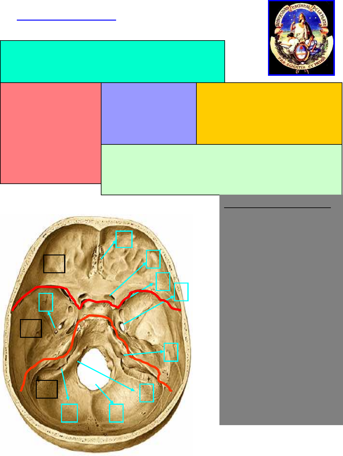 ANATOMIA HUMANA- AGUSTÍN PISCOPO 1 PARES CRANEALES Motores: 3º par o Motor ocular común. 4º par o Patético o troclear. 6º par o Motor ocular externo o abducens. 11º par o Espinal o Accesorio del vago. 12º par o Hipogloso mayor. Sensitivos: 1º par u Olfatorio. 2º par u Óptico. 8º par o Auditivo o vestíbulo coclear. Mixtos: 5º par o Trigémino. 7º par o Facial. 9º par o Glosofaríngeo. 10º par o Neumogástrico. A cada par CRANEAL le corresponde en la BASE DEL CRÁNEO, un agujero por el cuál, los nervios emergen desde sus distintos orígenes y van en busca del músculo, glándula, o componente al cuál deben inervar. El siguiente gráfico nos permite apreciar con un poco de más claridad lo dicho recientemente: Agujeros de base de cráneo. 1- Lámina cribiforme 2- Canal óptico. 3- Hendidura esfenoidal. 4- Agujero Oval. 5- Agujero redondo menor. 6- Conducto auditivo interno (CAI). 7- Agujero condíleo anterior. 8- Agujero rasgado posterior. 9-Agujero MAGNO. 10- Fosa craneana anterior. 11- Fosa craneana media. 12- Fosa craneana posterior 13- Silla turca. No sé puede ver el agujero Redondo Mayor por donde emerge el nervio maxilar superior. Las líneas rojas marcan la división de las fosas craneanas. 1 2 3 4 9 7 8 10 11 12 6 5 Los pares craneales son doce pares de nervios que emergen del encéfalo (bilaterales) y que serían homólogos a los nervios raquídeos. Según la información que llevan pueden clasificarse en: Motores, Sensitivos o Mixtos. ANATOMIA HUMANA- AGUSTÍN PISCOPO 2 Los pares craneales motores tienen eferencias, son eferentes, es decir, fibras que salen del sistema nervioso central y van hacia los órganos efectores (músculos, glándulas, etc.). Los pares craneales sensitivos son aferentes solo tienen aferencias, es decir, fibras que conducen la información hacia el sistema nervioso central. En cambio los nervios mixtos tienen tanto aferencias como eferencias, es decir son aferentes como eferentes. ANATOMIA HUMANA- AGUSTÍN PISCOPO 3 -1º par u Olfatorio ORIGEN: El nervio olfatorio esta formado por varios filetes nerviosos que se originan en las células bipolares de Schultze de epitelio olfatorio o pituitario. TRAYECTO Y RELACIONES: Las prolongaciones periféricas de las células de Schultze flotan en la cavidad nasal. Las centrales atraviesan la lámina cribosa del etmoides y llegan al bulbo olfatorio (hay uno de cada lado) para hacer sinapsis con la 2º neurona de la vía motora olfatoria. Hay que resaltar que este es un nervio que en sí no existe, sino que existen filetes del bulbo olfatorio. -2º par u Óptico ORIGEN: El nervio óptico esta formado por el conjunto de axones de las células ganglionares de la 8º capa de la retina, se desprende del globo ocular a 3 mm por dentro y un milímetro por debajo del polo posterior del globo ocular. TRAYECTO Y RELACIONES: El nervio óptico hace un primer trayecto infraorbitario y luego sale de la orbita por el agujero óptico, lugar por donde entra la arteria oftálmica. Luego sigue por el conducto óptico (trayecto intracanicular), que también comparte con la arteria oftálmica, para ubicarse en la cara inferior del cerebro por dentro de la arteria carótida interna (trayecto endocraneano). En seguida se cruza con el nervio óptico del lado opuesto sobre el cuerpo del esfenoides y forma así el quiasma óptico. El quiasma óptico es una lámina nerviosa que se ubica por arriba de la tienda de la hipófisis y se forma por el entrecruzamiento de las fibras nasales de ambos nervios ópticos solamente. LA IMAGEN PERMITE OBSERVAR LA DISTRIBUCION DE LOS NERVIOS SOBRE LA PARED ÓSEA, DE LA CAVIDAD NASAL. ANATOMIA HUMANA- AGUSTÍN PISCOPO 4 Las fibras nasales se cruzan en sentido transversal y latitudinal de manera que además de hacerse contralaterales, las fibras inferiores se hacen superiores y viceversa. A partir del quiasma se forman las BANDELETAS O CINTILLAS OPTICAS que están formadas por: * Las fibras temporales homolaterales. * Las fibras nasales contralaterales. Las cintillas ópticas contornean los pedúnculos cerebrales y terminan haciendo sinapsis con las neuronas de los cuerpos geniculados laterales o externos que representan las 3º neuronas de la vía visual. -3º par o Motor ocular común ORIGEN REAL: El núcleo motor del 3º par que está ubicado en el mesencéfalo a nivel del tubérculo cuadrigéminos anterior, en la parte anterolateral de la substancia gris que rodea al Acueducto de Silvio. Tiene un *NÚCLEO PARASIMPATICO: Núcleo iridioconstrictor de EDINGER WESTPHAL. El origen de las fibras de este núcleo es discutido aún no se sabe específicamente de donde surgen estas fibras. ORIGEN APARENTE: El 3º par sale del tronco por la cara antero interna del pedúnculo cerebral por la escotadura interpeduncular. TRAYECTO Y RELACIONES: El 3º par se forma por fibras que nacen del núcleo motor y de los núcleos vegetativos. Desde su origen el nervio motor ocular común va hacia delante y afuera y pasa por fuera de las apófisis clinoides posteriores. Corre por al cara externa del SENO CAVERNOSO y se introduce en esta pared externa ubicándose por arriba del 4º par y del NERVIO OFTALMICO (RAMA DEL 5º PAR, TRIGEMINO). En este gráfico se pueden apreciar distintos componentes del sistema olfatorio y nos permite ver la formación del QUIASMA OPTICO, el de la izquierda es una pequeña ampliación. ANATOMIA HUMANA- AGUSTÍN PISCOPO 5 Sigue por dentro del seno cavernoso hasta llegar a la HENDIDURA ESFENOIDAL, y la atraviesa por dentro del ANILLO DE ZINN. Cerca de la HENDIDURA ESFENOIDAL se divide en dos ramas terminales: RAMA SUPERIOR inerva al RECTO SUPERIOR y al ELEVADOR DEL PARPADO SUPERIOR. RAMA INFERIOR inerva a los músculos RECTO INFERIOR, RECTO INTERNO Y OBLICUO MENOR. Esta rama también manda unas fibras al ganglio oftálmico (del nervio oftálmico del 5º par) estas fibras hacen sinapsis con las neuronas del ganglio ciliar, cuyos axones forman los nervios ciliares cortos que llegan a globo o