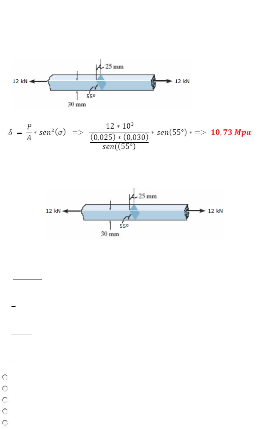 ACQF mecânica dos sólidos 1 semana Duas partes de um metal foi soldado com uma angulação de 55º, determine a tensão normal suportada no plano da solda. Duas partes de um metal foi soldado com uma angulação de 55º, determine a tensão de cisalhamento suportada no plano da solda. X = 12 * cos55 = 6,8829N Y = 12 * sen55 = 9,8298N A = 0,025 ∗0,030 𝑠𝑒𝑛55 = 915,5809 F = 12000 * cos(55) = 6882,9N 𝜏 = 𝑁 𝐴 Tensão normal 𝜏 = 9829,8 915,5809 = 10,73 MPa Tensão por cisalhamento 𝜏 = 6882,9 915,5809 = 7,517MPa 1,258 MPa 7,517 MPa 3,416 MPa 5,687 MPa 1,258 KN Um corpo é sustentado pelo suporte da figura abaixo, se o diâmetro do pino for D = 12 mm qual é a tensão de cisalhamanto do pino. V = F / 2 V = 5 kN / 2 V = 2,5 kN Calculemos a agora a área da seção transversal do pino: A = 113,0973355 A fórmula da tensão média de cisalhamento é a seguinte: onde, T: tensão média de cisalhamento; V: força cortante interna, no caso, 2,5 kN; A: área da seção transversal, no caso, 113,0973355 mm². Aos cálculos: τ = 2500 / 113,0973355 τ = 22,10485321 Mpa 0,128 Mpa 22,10 Mpa 2,559 Mpa 53,45 Mpa 9,588 Mpa 2 semana Determine o diâmetro de sustentação da haste da figura abaixo que suporta uma carga de 200 kN. O material da haste tem uma tensão última de 800 GPa e o fator de segurança dela vale 1,6. Determine o diâmetro de sustentação da haste da figura abaixo que suporta uma carga de 200 kN. O material da haste tem uma tensão última de 400 GPa e o fator de segurança dela vale 1,65. 8,354 cm 0,035 cm 1,024 mm 3,134 mm 2,578 mm 𝑑 = √ 1,65∗4∗200∗103 𝜋∗400∗106 = 1,024mm Determine o diâmetro de sustentação da haste da figura abaixo que suporta uma carga de 200 kN. O material da haste tem uma tensão última de 8 GPa e o fator de segurança dela vale 1,65. 𝑑 = √ 1,65∗4∗200∗103 𝜋∗8∗106 = 7,2471 24,56 cm 45,21 mm 10,14 mm 34,15 mm 7,24 mm 3 semana Um suporte rígio é sustentado por um pino em A e pelo cabo BC, a carga que está posicionada no ponto B provoca um deslocamento de 15 mm do ponto B para baixo. De acordo com solicitação mostrada na figura qual é a deformação normal do cabo BC? 14,001 mm/mm 0,0015 mm/mm 0,0054 mm/mm 0,0075 mm/mm 0,0254 mm/mm Após um temporal as paredes de uma residência se deslocaram fazendo com que uma das suas janelas se deformasse conforme mostra a figura abaixo. Sabendo que a base da janela não sofreu deformação e que sua medida vale 3150 mm qual é o valor da deformação normal do lado AB? - 8,147 x 10-3 mm/mm - 9,720 x 10-3 mm/mm - 7,589 x 10-3 mm/mm - 1,109 x 10-3 mm/mm - 2,631 x 10-3 mm/mm 4 semana Com base no diagrama de tensão-deformação da figura abaixo determine o módulo de elasticidade E para o aço. 320 GPa 350 GPa 124 GPa 200 GPa 405 GPa Um corpo de prova submetido a um pequeno aumento na tensão acima do limite de elasticidade provocará um colapso no material fazendo com que ele se deforme de forma permanente. Qual é o nome desse comportamento do material? Escoamento Endurecimento por deformação Estricção Estricção por deformação Comportamento elástico 7 semana Um pilar metálico construido com aço A-36 tem os segmentos AB e BD com áreas medindo 800 mm² e 1400 mm², respectivamente. Qual é o deslocamento vertical da extremidade A e o deslocamento do ponto B em relação a C se a força F aplocada em A for igual a 65 kN. Dado: Eaço = 210 GPa. A = 0,844 mm, B/C = 0,0612 mm A = 0,612 mm, B/C = 0,1045 mm A = 0,104 mm, B/C = 0,7841 mm A = 0,547 mm, B/C = 0,3867 mm A = 0,357 mm, B/C = 0,0637 mm Uma barra com 6 mm de diâmetro é fixada na parede como mostra a figura abaixo. A fixação foi feita em A de maneira que antes de ser submetida à carga P de 15 kN havia uma folga F igual a 2 mm entre a extremidade da barra e a parede B’. Determine a intensidade das reações em A e B’. Dado: E = 200 GPa. Nac = 10,65 kN; Nbc = 11,87 kN Nac = 19,42 kN; Nbc = 4,423 kN Nac = 54,25 kN; Nbc = 1,587 kN Nac = 14,57 kN; Nbc = 7,158 kN Nac = 11,87 kN; Nbc = 10,65 kN 8 semana Um eixo foi construido de aço com tensão de cisalhamento admissível de 70 MPa, sabendo se que o diâmetro do eixo é 35 mm determine o torque máximo que pode ser transmitido ao eixo. Se por ventura fosse feito um furo de 20 mm no eixo qual seria o torque admitido? T1 = 589,29 N.m; T2 = 526,46 N.m T1 = 902,54 N.m; T2 = 879,14 N.m T1 = 345,62 N.m; T2 = 224,87 N.m T1 = 117,25 N.m; T2 = 105,47 N.m T1 = 789,36 N.m; T2 = 654,23 N.m Um eixo de transmissão de engrenagens múltiplas tem diâmetro de 60 mm, se o valor de T1 for 30 N.m determine a tensão de cisalhamento máxima no eixo. Nota: o torque T1 está no sentido horário e os demais estão no sentido anti-horário. 1,24 MPa 6,98 MPa 5,48 MPa 7,89 MPa 2,87 MPa 9 semana Determine o diâmetro de sustentação da haste da figura abaixo que suporta uma carga de 500 kN. O material da haste tem uma tensão última de 8 GPa e o fator de segurança dela vale 4,25. 𝑑 = √ 4,25∗4∗500∗103 𝜋∗8∗106 = 18,3903mm 18,39 mm 54,32 mm 10,22 mm 27,58 mm 35,68 mm Um suporte rígido é sustentado por um pino em A e pelo cabo BC, a carga que está posicionada no ponto B provoca um deslocamento de 20 mm do ponto B para baixo. De acordo com solicitação mostrada na figura qual é (aproximadamente) a deformação normal do cabo BC? 0,8023 mm/mm 0,6154 mm/mm 0,0099 mm/mm 0,7014 mm/mm 0,5063 mm/mm