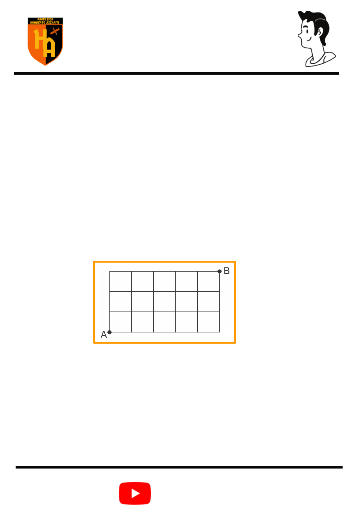 Prof. Humberto Azzariti MATEMÁTICA COMBINATÓRIA: PERMUTAÇÃO COM REPETIÇÃO HUMBERTO AZZARITI Gabarito: 1) 60 anagramas 2) Somatório = 31 3) 10 sequências 4) 15 maneiras 5) Letra E Acompanhe a resolução desses exercícios no meu canal. 1) Quantos anagramas que se pode formar com a palavra banana? 2) Em relação aos anagramas da palavra "cidade", assinale o que for correto. 01. Em 72 anagramas as vogais aparecem juntas. 02. Podem ser formados 360 anagramas. 04. Em 72 anagramas as consoantes aparecem juntas. 08. 60 anagramas começam com "c". 16. 180 é o número de anagramas que começam por vogal. 3) Uma urna contém 3 bolas vermelhas e 2 azuis. Elas são extraídas uma a uma sem reposição. Quantas sequências de cores podemos observar? 4) Se uma partida de futebol termina com o resultado de 4 gols para o time X e 2 gols para o time Y, existem diversas maneiras de o placar evoluir de 0 x 0 a 4 x 2. Quantas maneiras, no total, tem o placar de evoluir de 0 x 0 a 4 x 2? 5) (Upf 2016) Na figura a seguir, as linhas horizontais e verticais representam ruas e os quadrados representam quarteirões. A quantidade de trajetos de comprimento mínimo ligando A a B é: A) 40.320 B) 6.720 C) 256 D) 120 E) 56