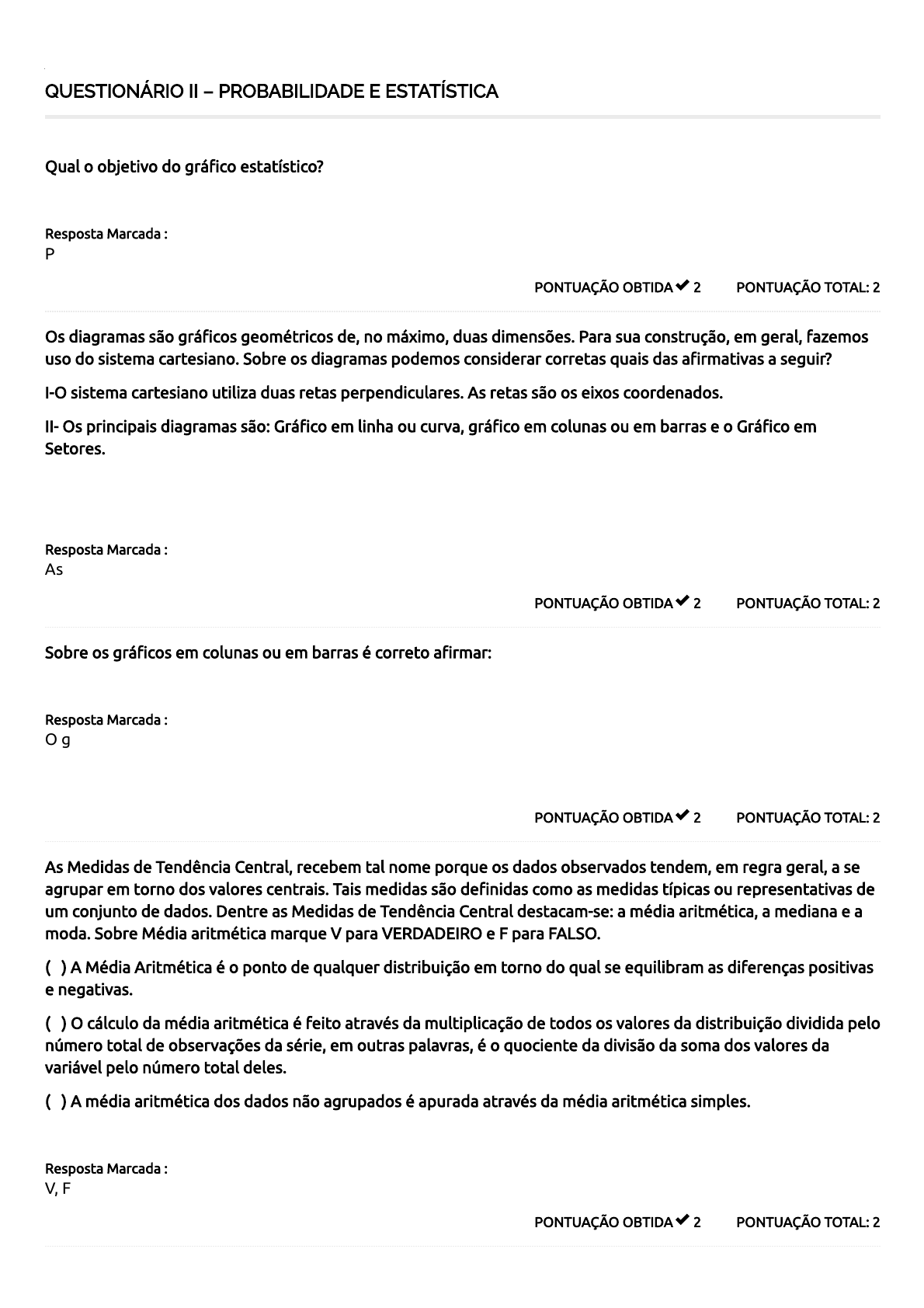 10/07/2020 Course Status – Centro Universitário Faveni https://ava.unifaveni.com.br/course-status/ 1/2 QUESTIONÁRIO II – PROBABILIDADE E ESTATÍSTICA PONTUAÇÃO TOTAL: 2PONTUAÇÃO OBTIDA 2 Qual o objetivo do grá�co estatístico? Resposta Marcada : Produzir uma impressão mais rápida do fenômeno em estudo. PONTUAÇÃO TOTAL: 2PONTUAÇÃO OBTIDA 2 Os diagramas são grá�cos geométricos de, no máximo, duas dimensões. Para sua construção, em geral, fazemos uso do sistema cartesiano. Sobre os diagramas podemos considerar corretas quais das a�rmativas a seguir? I-O sistema cartesiano utiliza duas retas perpendiculares. As retas são os eixos coordenados. II- Os principais diagramas são: Grá�co em linha ou curva, grá�co em colunas ou em barras e o Grá�co em Setores. Resposta Marcada : As duas a�rmativas podem ser consideradas corretas PONTUAÇÃO TOTAL: 2PONTUAÇÃO OBTIDA 2 Sobre os grá�cos em colunas ou em barras é correto a�rmar: Resposta Marcada : O grá�co em colunas ou em barras são representados por meio de retângulos, dispostos verticalmente em colunas, ou horizontalmente em barras. Quando em colunas, os retângulos possuem a mesma base, sendo que as alturas são proporcionais aos seus respectivos dados. PONTUAÇÃO TOTAL: 2PONTUAÇÃO OBTIDA 2 As Medidas de Tendência Central, recebem tal nome porque os dados observados tendem, em regra geral, a se agrupar em torno dos valores centrais. Tais medidas são de�nidas como as medidas típicas ou representativas de um conjunto de dados. Dentre as Medidas de Tendência Central destacam-se: a média aritmética, a mediana e a moda. Sobre Média aritmética marque V para VERDADEIRO e F para FALSO. ( ) A Média Aritmética é o ponto de qualquer distribuição em torno do qual se equilibram as diferenças positivas e negativas. ( ) O cálculo da média aritmética é feito através da multiplicação de todos os valores da distribuição dividida pelo número total de observações da série, em outras palavras, é o quociente da divisão da soma dos valores da variável pelo número total deles. ( ) A média aritmética dos dados não agrupados é apurada através da média aritmética simples. Resposta Marcada : V, F, V 10/07/2020 Course Status – Centro Universitário Faveni https://ava.unifaveni.com.br/course-status/ 2/2 20 / 20 PONTUAÇÃO TOTAL: 2PONTUAÇÃO OBTIDA 2 No cálculo da média aritmética dos dados agrupados com intervalo de classe, leva-se em conta que todos os valores incluídos em um certo intervalo de classe coincidem com? Resposta Marcada : Seu ponto médio. PONTUAÇÃO TOTAL: 2PONTUAÇÃO OBTIDA 2 O que é a moda mediana? Resposta Marcada : A Moda é o valor que ocorre com maior frequência em uma série de valores. PONTUAÇÃO TOTAL: 2PONTUAÇÃO OBTIDA 2 Quando tratamos com dados não agrupados, a moda é facilmente identi�cada. Na série de dados: 3, 4, 4, 4, 5, 5, obviamente a moda é: Resposta Marcada : 4 PONTUAÇÃO TOTAL: 2PONTUAÇÃO OBTIDA 2 Sobre Correlação, quais das a�rmativas mencionadas a seguir podem ser consideradas corretas? I- Quando consideramos variáveis do tipo peso e altura de um grupo de pessoas, procuramos veri�car se há alguma relação entre este par de variáveis e qual o grau desta possível relação. Por exemplo, em regra, quanto maior a altura maior deve ser o peso da pessoa. II- Uma vez caracterizada a relação, o próximo passo é descrevê-la através de uma função matemática. Resposta Marcada : As duas a�rmativas podem ser consideradas corretas PONTUAÇÃO TOTAL: 2PONTUAÇÃO OBTIDA 2 Como é chamado o instrumento adotado para a medida da correlação linear? Resposta Marcada : Coe�ciente de correlação PONTUAÇÃO TOTAL: 2PONTUAÇÃO OBTIDA 2 Sempre que desejamos estudar determinada variável em relação à outra, fazemos uma análise de: Resposta Marcada : Análise de regressão Total