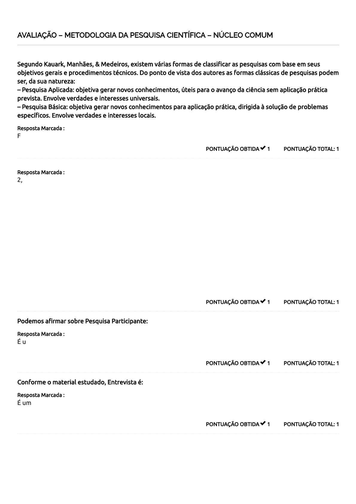 13/07/2020 Course Status – AVA Faculdade Futura https://ava.faculdadefutura.com.br/course-status/ 1/3 AVALIAÇÃO – METODOLOGIA DA PESQUISA CIENTÍFICA – NÚCLEO COMUM PONTUAÇÃO TOTAL: 1PONTUAÇÃO OBTIDA 1 Segundo Kauark, Manhães, & Medeiros, existem várias formas de classi�car as pesquisas com base em seus objetivos gerais e procedimentos técnicos. Do ponto de vista dos autores as formas clássicas de pesquisas podem ser, da sua natureza: – Pesquisa Aplicada: objetiva gerar novos conhecimentos, úteis para o avanço da ciência sem aplicação prática prevista. Envolve verdades e interesses universais. – Pesquisa Básica: objetiva gerar novos conhecimentos para aplicação prática, dirigida à solução de problemas especí�cos. Envolve verdades e interesses locais. Resposta Marcada : Falsa ENUMERE AS QUESTÕES CORRESPONDENTES:(1) PESQUISA APLICADA: (2) PESQUISAS EXPLORATÓRIAS (3) PESQUISAS DESCRITIVAS (4) PESQUISAS EXPLICATIVAS ( ) BUSCAM PROPORCIONAR UMA ABORDAGEM DO PROBLEMA PELO LEVANTAMENTO DE INFORMAÇÕES OU A CONSTITUIÇÃO DE HIPÓTESES, ENVOLVENDO LEVANTAMENTO BIBLIOGRÁFICO E DOCUMENTAL, ENTREVISTAS COM PESSOAS, ANÁLISE DE EXEMPLOS E OUTROS. ( ) OBJETIVA GERAR NOVOS CONHECIMENTOS PARA APLICAÇÃO PRÁTICA, DIRIGIDA À SOLUÇÃO DE PROBLEMAS ESPECÍFICOS. ENVOLVE VERDADES E INTERESSES LOCAIS. ( ) IDENTIFICAR AS CAUSAS E FATORES DA OCORRÊNCIA DOS FENÔMENOS, EXPLICANDO A RAZÃO DAS COISAS. ASSUME EM GERAL AS FORMAS DE PESQUISA EXPERIMENTAL E PESQUISA EX POST FACTO. ( ) SÃO REALIZADAS COM O INTUITO DE DESCREVER AS CARACTERÍSTICAS DO FENÔMENO, POPULAÇÃO OU ESTABELECIMENTO DE RELAÇÕES ENTRE VARIÁVEIS. A PESQUISA DESCRITIVA ENVOLVE TÉCNICAS DE COLETA DE DADOS, COMO LEVANTAMENTO DE OPINIÕES, SALIENTANDO “AQUELAS QUE TÊM POR OBJETIVO ESTUDAR AS CARACTERÍSTICAS DE UM GRUPO: SUA DISTRIBUIÇÃO POR IDADE, SEXO, PROCEDÊNCIA, NÍVEL DE ESCOLARIDADE, NÍVEL DE RENDA, ESTADO DE SAÚDE FÍSICA E MENTAL ETC”. PONTUAÇÃO TOTAL: 1PONTUAÇÃO OBTIDA 1 Resposta Marcada : 2,1,4,3 PONTUAÇÃO TOTAL: 1PONTUAÇÃO OBTIDA 1 Podemos a�rmar sobre Pesquisa Participante: Resposta Marcada : É uma concepção de pesquisa em que se desenvolve a partir da interação entre pesquisadores e membros das situações investigadas, buscando permitir à comunidade análise de sua realidade para benefício próprio. PONTUAÇÃO TOTAL: 1PONTUAÇÃO OBTIDA 1 Conforme o material estudado, Entrevista é: Resposta Marcada : É um procedimento utilizado na investigação social, a �m de obter informações a respeito de determinado assunto para a coleta de dados ou para ajudar no diagnóstico ou no tratamento de um problema social. 13/07/2020 Course Status – AVA Faculdade Futura https://ava.faculdadefutura.com.br/course-status/ 2/3 PONTUAÇÃO TOTAL: 1PONTUAÇÃO OBTIDA 1 Sobre Redação do relatório podemos a�rmar: É a Primeira etapa do processo de pesquisa embora algumas vezes desconsiderado é imprescindível. As habilidades para o desenvolvimento desta etapa diferem daquelas requeridas nas etapas anteriores. Deve-se passar ao leitor uma clara compreensão dos fatos, dados e conclusões, devendo ser um documento por si só explicativo. Resposta Marcada : Falso. PONTUAÇÃO TOTAL: 1PONTUAÇÃO OBTIDA 1 De acordo com o texto estudado podemos a�rmar sobre Lista de abreviaturas e siglas: Resposta Marcada : É um Elemento opcional. Consiste na relação alfabética das abreviaturas e siglas utilizadas no texto, seguidas das palavras ou expressões correspondentes grafadas por extenso. Recomenda-se a elaboração de lista própria para cada tipo. PONTUAÇÃO TOTAL: 1PONTUAÇÃO OBTIDA 1 Elaboradas conforme a ABNT NBR 6023. As referências podem aparecer: ( )exceto no rodapé ( )no �m de texto ou de capítulo ( )em lista de referências ( ) tecendo resumos, resenhas e recensões. Resposta Marcada : F, V, V, V. PONTUAÇÃO TOTAL: 1PONTUAÇÃO OBTIDA 1 A ____________________ deve ser utilizada para evidenciar a sistematização do conteúdo do trabalho. Destacam- se gradativamente os títulos das seções, utilizando-se os recursos de negrito, itálico ou sublinhado e outros, no sumário e, de forma idêntica, no texto, devendo ser alinhados a margem esquerda, separado por um espaço. Resposta Marcada : Numeração progressiva. 13/07/2020 Course Status – AVA Faculdade Futura https://ava.faculdadefutura.com.br/course-status/ 3/3 10 / 10 PONTUAÇÃO TOTAL: 1PONTUAÇÃO OBTIDA 1 Enumere de acordo com a alternativa correspondente: (1) Notas de referência (2) Notas de rodapé (3) Notas explicativas ( ) Indicações, observações ou aditamentos ao texto feitos pelo autor, tradutor ou editor, podendo também aparecer na margem esquerda ou direita da mancha grá�ca. ( ) Notas que indicam fontes consultadas ou remetem a outras partes da obra onde o assunto foi abordado. ( ) Notas usadas para comentários, esclarecimentos ou explanações, que não possam ser incluídos no texto. Resposta Marcada : 2,1,3 PONTUAÇÃO TOTAL: 1PONTUAÇÃO OBTIDA 1 As margens do trabalho devem possuir espaçamento de: Resposta Marcada : 3 cm margens esquerda e superior e 2 cm margens direita e inferior. Total