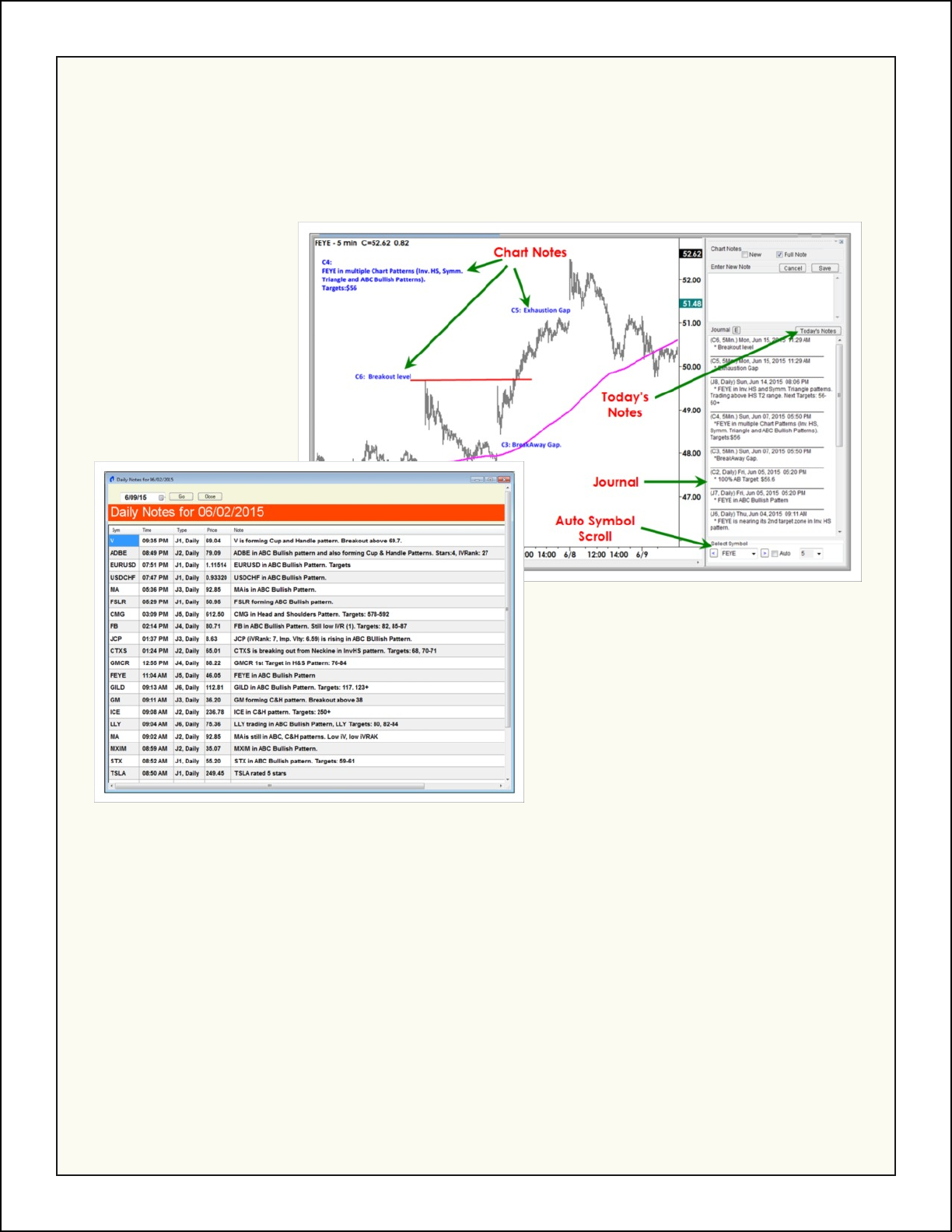 1 suri.ChartNotes for TradeStation 9+ suriNotes.com ●Chart Notes and Journals for Ideas/Setups ●Notes on any Chart, any Bar, anywhere ●Pin Chart notes to any time-frame bar ●Edit and Moveable Chart Notes ●Daily Journal/Notes on a Single Page ●Scroll Symbol list (Auto Scroll with Delay) 2 suri.ChartNotes Manual 2015 ALL RIGHTS RESERVED No part of this document may be reproduced or transmitted without the express written consent of the suriNotes.com or Suri Duddella. This document relies on sources and information reasonably believed to be accurate, but neither the author nor publisher guarantees accuracy or completeness. Trading is risky. You are 100% responsible for your own trading. suriNotes.com or Suri Duddella, specifically disclaims any and all express and implied warranties. Your trades may entail substantial loss. Nothing in this document should be construed as a recommendation to buy or sell any security or other instrument, or a determination that any trade is suitable for you. The examples in this document could be considered hypothetical trades. The CFTC warns that: HYPOTHETICAL PERFORMANCE RESULTS HAVE MANY INHERENT LIMITATIONS, SOME OF WHICH ARE DESCRIBED BELOW. NO REPRESENTATION IS BEING MADE THAT ANY ACCOUNT WILL OR IS LIKELY TO ACHIEVE PROFITS OR LOSSES SIMILAR TO THOSE SHOWN. IN FACT, THERE ARE FREQUENTLY SHARP DIFFERENCES BETWEEN HYPOTHETICAL PERFORMANCE RESULTS AND THE ACTUAL RESULTS SUBSEQUENTLY ACHIEVED BY ANY PARTICULAR TRADING PROGRAM. ONE OF THE LIMITATIONS OF HYPOTHETICAL PERFORMANCE RESULTS IS THAT THEY ARE GENERALLY PREPARED WITH THE BENEFIT OF HINDSIGHT. IN ADDITION, HYPOTHETICAL TRADING DOES NOT INVOLVE FINANCIAL RISK, AND NO HYPOTHETICAL TRADING RECORD CAN COMPLETELY ACCOUNT FOR THE IMPACT OF FINANCIAL RISK IN ACTUAL TRADING. FOR EXAMPLE, THE ABILITY TO WITHSTAND LOSSES OR TO ADHERE TO A PARTICULAR TRADING PROGRAM IN SPITE OF TRADING LOSSES ARE MATERIAL POINTS WHICH CAN ALSO ADVERSELY AFFECT ACTUAL TRADING RESULTS. THERE ARE NUMEROUS OTHER FACTORS RELATED TO THE MARKETS IN GENERAL OR TO THE IMPLEMENTATION OF ANY SPECIFIC TRADING PROGRAM WHICH CANNOT BE FULLY ACCOUNTED FOR IN THE PREPARATION OF HYPOTHETICAL PERFORMANCE RESULTS AND ALL OF WHICH CAN ADVERSELY AFFECT ACTUAL TRADING RESULTS. COPYRIGHT © 2015 – suriNotes.com Charts are created by TradeStation Software from TradeStation Securities. Published in the United States of America 3 ChartNotes Controls 4 suri.ChartNotes is an annotation tool for TradeStation charts to add and edit ideas/notes. Chart Notes and Journal notes can be added to any symbol charts at any locations in all time-frames. These Chart Notes are saved and retrieved when a chart is opened and presented during trader analysis. Chart Notes and Journals help traders to review their chart observations, analysis, ideas or concepts at any time. Both Journal notes and Chart Notes are Date and Time stamped and presented in an easy to read format next to a symbol based chart. In addition, Chart Notes are location specific notes as they are presented (optionally) on the chart. ChartNotes Overview 5 Journal Note A Journal note is a detailed comment or analysis. A Journal can be small observation to narrations of equivalent to a log file. It can be a record of the daily run, such as observations, price changes, anomalies, or other events with full details. Journal notes are only displayed in Journal window. Journal notes identified by “J” followed by its ID number like J1, J2, J3.. Journal Note format: (Journal NoteID, Chart Time Frame) Date/Time Stamp * Journal Note Chart Note A Chart note is a brief description that can be specific to a full chart or could be specific a single bar condition or an action item for group of bars. Chart notes can be placed on any location of price chart (main graph). These notes can be edited/modified and moved to a new location. They can also be deleted from charts and the storage. Chart Notes are identified by “C” followed by its ID number (like C1, C2, C3, C4…) and it is (optionally) followed by full note on the registered location on chart. 6 Auto Scroller ChartNotes application features a slide-show operation to traverse through a list of symbols from symbol list (_symbolList.xml file in C:\suri\notes directory. Symbols from this list will be loaded into Symbols drop down box. Next (>>) or Previous (<<) arrows to traverse through the list. To load symbols automatically like a slide-show select Auto check box. This will load symbols at a <Delay> (in seconds) frequency until the end-of the list. Select/Deselect Auto mode to turn-on/turn-off the Auto mode. 7 Installation suri.ChartNotes is available from TradeStation Appstore. Subscribe to suri.ChartNotes indicator from TradeStation AppStore and follow installation instructions. Once the indicator is subscribed, you can insert suri.ChartNotes in any chart. Please see on how to create notes directories and symbol list file. 8 Chart Notes Directory ChartNotes are saved in C:\suri\Notes directory. ChartNotes are built into each symbol xml file, like GOOG.XML, FB.XML, ESM15.XML. These files are XML based and have a custom format to save symbol notes. You can delete these files but for manual editing files, caution is required. Creating Directories When first installed, users need to create these directories manually. 1. Create C:\suri directory 2. Create a Sub-Directory under c:\suri called Notes. You should see C:\suri\npotes directory 3. Build a Stock Symbol List (_symbolList.xml) inside C:\suri\notes directory 4. You can also copy supplied _SymbolList.XML file for list of stocks. Directories on User PC (C:\suri\notes\) mailto:@ES.XML. 9 Symbol List file A Symbol list file (_symbolList.xml) is user customized list of market symbols. This list is used tor traversing charts forward/backwards or used in auto-mode. This sorted symbol list is manually built by traders. Using the symbol list, the symbols are automatically loaded into the Symbol Dropd