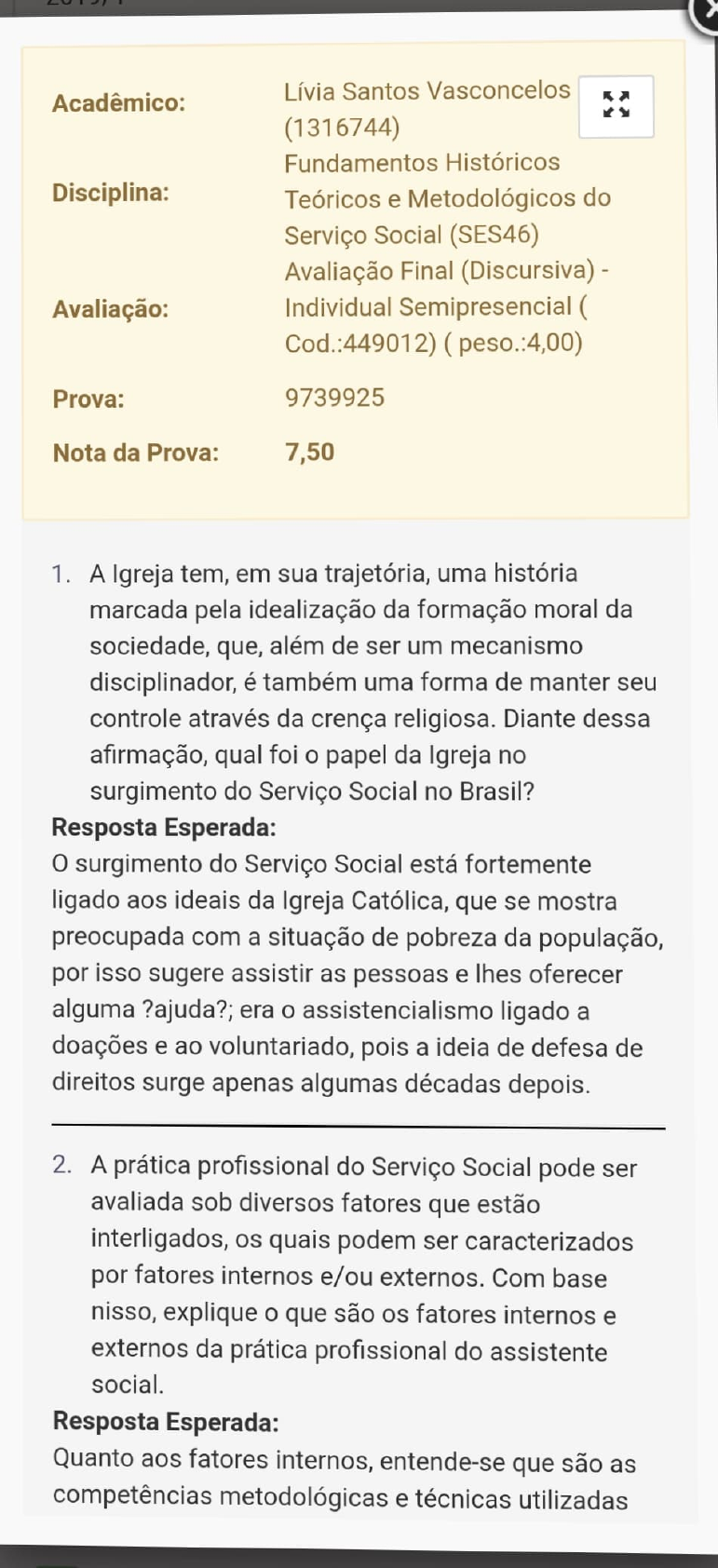 -------------,~ Acadêmico: Disciplina: Avaliação: Prova: Nota da Prova: Lívia Santos Vasconcelos (1316744) Fundamentos Históricos Teóricos e Metodológicos do Serviço Social (SES46) Avaliação Final (Discursiva) - Individual Semipresencial ( Cod.:449012) ( peso.:4,00) 9739925 7,50 1. A Igreja tem, em sua trajetória, uma história marcada pela idealização da formação moral da sociedade, que, além de ser um mecanismo disciplinador, é também uma forma de manter seu controle através da crença religiosa. Diante dessa afirmação, qual foi o papel da Igreja no surgimento do Serviço Social no Brasil? Resposta Esperada: O surgimento do Serviço Social está fortemente ligado aos ideais da Igreja Católica, que se mostra preocupada com a situação de pobreza da população, por isso sugere assistir as pessoas e lhes oferecer alguma ?ajuda?; era o assistencialismo ligado a doações e ao voluntariado, pois a ideia de defesa de direitos surge apenas algumas décadas depois. 2. A prática profissional do Serviço Social pode ser avaliada sob diversos fatores que estão interligados, os quais podem ser caracterizados por fatores internos e/ou externos. Com base nisso, explique o que são os fatores internos e externos da prática profissional do assistente social. Resposta Esperada: Quanto aos fatores internos, entende-se que são as competências metodológicas e técnicas utilizadas Nota da Prova: 7 ,50 1. A Igreja tem, em sua trajetória, uma história marcada pela idealização da formação moral da sociedade, que, além de ser um mecanismo disciplinador, é também uma forma de manter seu controle através da crença religiosa. Diante dessa afirmação, qual foi o papel da Igreja no surgimento do Serviço Social no Brasil? Resposta Esperada: O surgimento do Serviço Social está fortemente ligado aos ideais da Igreja Católica, que se mostra preocupada com a situação de pobreza da população, por isso sugere assistir as pessoas e lhes oferecer alguma ?ajuda?; era o assistencialismo ligado a doações e ao voluntariado, pois a ideia de defesa de direitos surge apenas algumas décadas depois. 2. A prática profissional do Serviço Social pode ser avaliada sob diversos fatores que estão interligados, os quais podem ser caracterizados por fatores internos e/ou externos. Com base nisso, explique o que são os fatores internos e externos da prática profissional do assistente social. Resposta Esperada: Quanto aos fatores internos, entende-se que são as competências metodológicas e técnicas utilizadas para desenvolver uma compreensão da realidade do sujeito em questão e da realidade que o cerca. São os conhecimentos adquiridos na graduação, na teoria. Já aos fatores externos da profissão considera-se a prática do conhecimento dessa realidade, na qual o profissional vai a campo em busca de entender as demandas dos sujeitos. É a observação de como se dão as relações, tanto no campo empresarial quanto em instituições, para poder oferecer um trabalho profissional que atenda aos objetivos do empregador.