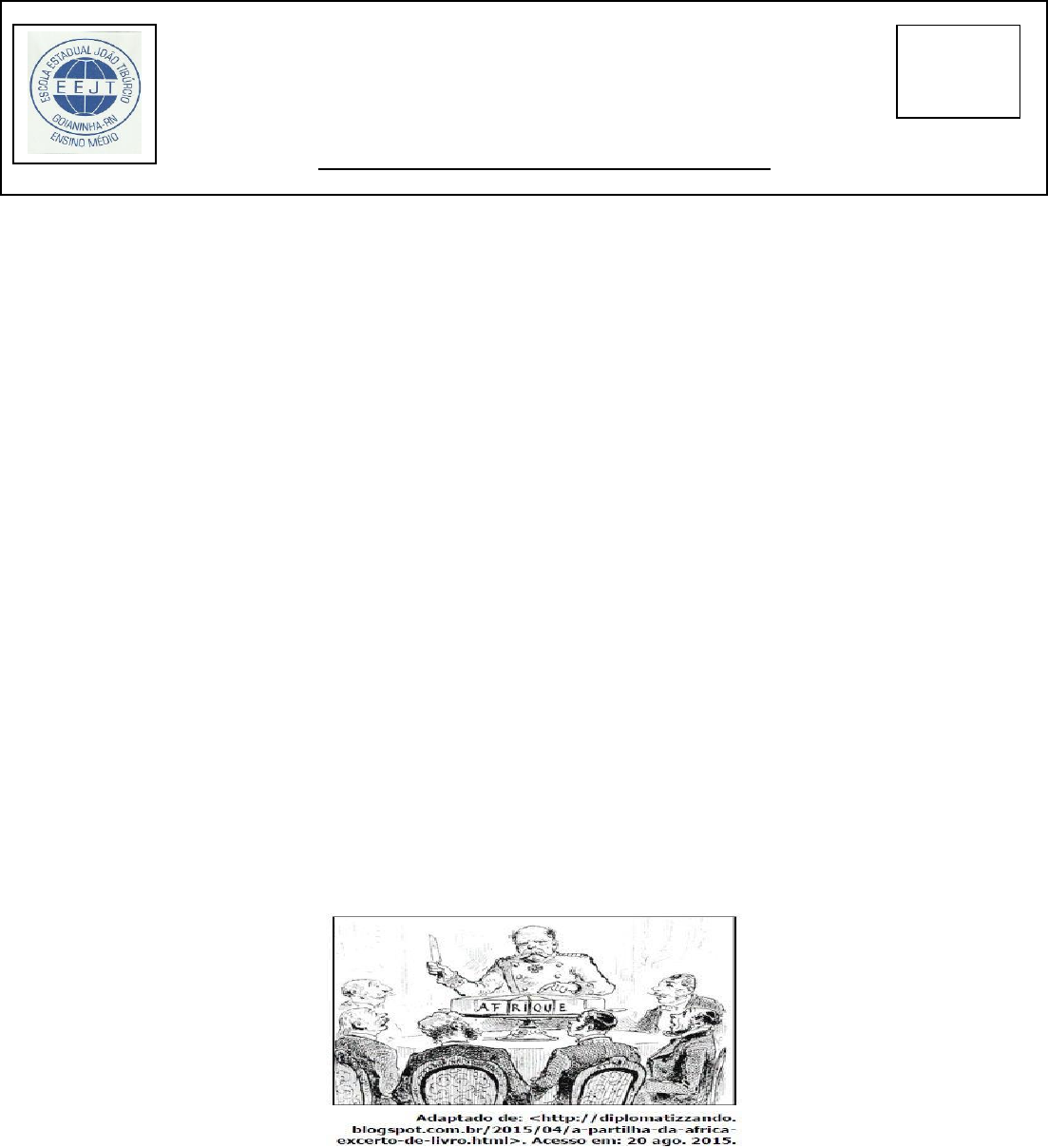 ESCOLA ESTADUAL JOÃO TIBÚRCIO Disciplina: História Professora: Samara Lyra Turma: 3°_____ Aluno (a): ___________________________________________________ Exercício Referente a aula Remota de História nº1 Segunda Revolução Industrial e Imperialismo 1. Você viu que foi durante a Segunda Revolução Industrial que vários pesquisadores estudaram as aplicações da eletricidade. Qual a importância dessa inovação na sua vida? Comente. 2. Explique o que foi a Segunda Revolução Industrial. 3. Com base na leitura do material disponível, aponte as principais mudanças implementadas no cotidiano das pessoas, com os avanços tecnológicos introduzidos pela Segunda Revolução Industrial. 4. Pesquise o que são truste, holding e cartel. 5. Sobre o Imperialismo, responda as seguintes questões: a) Defina o que foi o Imperialismo. b) Diferencie o colonialismo do neocolonialismo. c) Cite os principais interesses das potências imperialistas sobre as áreas dominadas. d) Explique as justificativas utilizadas pelas potências para defenderem a prática imperialista. 6. Observe a imagem abaixo. A Conferência de Berlim (1884) resultou na “Partilha da África” pelas potências europeias. a) O que está sendo representado na imagem? b) Pesquise as consequências dessa divisão para os povos africanos. 7. Em sua opinião existiu relação entre a Segunda Revolução Industrial e a prática do Imperialismo. Comente. NOTA _____