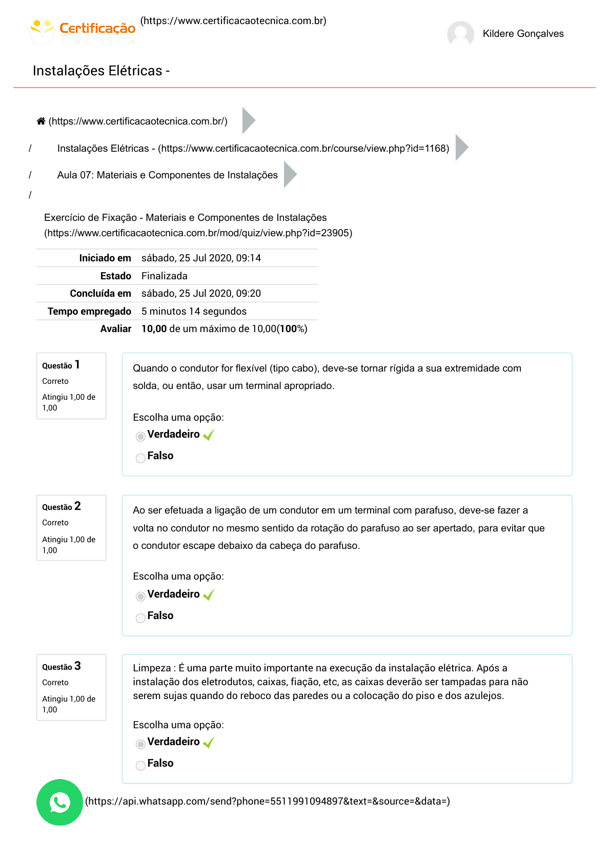 / (https://www.certificacaotecnica.com.br) Kildere Gonçalves Instalações Elétricas - Questão 1 Correto Atingiu 1,00 de 1,00 Questão 2 Correto Atingiu 1,00 de 1,00 Questão 3 Correto Atingiu 1,00 de 1,00 / / / Iniciado em sábado, 25 Jul 2020, 09:14 Estado Finalizada Concluída em sábado, 25 Jul 2020, 09:20 Tempo empregado 5 minutos 14 segundos Avaliar 10,00 de um máximo de 10,00(100%) Quando o condutor for flexível (tipo cabo), deve-se tornar rígida a sua extremidade com solda, ou então, usar um terminal apropriado. Escolha uma opção: Verdadeiro Falso Ao ser efetuada a ligação de um condutor em um terminal com parafuso, deve-se fazer a volta no condutor no mesmo sentido da rotação do parafuso ao ser apertado, para evitar que o condutor escape debaixo da cabeça do parafuso. Escolha uma opção: Verdadeiro Falso Limpeza : É uma parte muito importante na execução da instalação elétrica. Após a instalação dos eletrodutos, caixas, fiação, etc, as caixas deverão ser tampadas para não serem sujas quando do reboco das paredes ou a colocação do piso e dos azulejos. Escolha uma opção: Verdadeiro Falso (https://www.certificacaotecnica.com.br/) Instalações Elétricas - (https://www.certificacaotecnica.com.br/course/view.php?id=1168) Aula 07: Materiais e Componentes de Instalações Exercício de Fixação - Materiais e Componentes de Instalações (https://www.certificacaotecnica.com.br/mod/quiz/view.php?id=23905) (https://api.whatsapp.com/send?phone=5511991094897&text=&source=&data=) https://www.certificacaotecnica.com.br/ https://www.certificacaotecnica.com.br/ https://www.certificacaotecnica.com.br/course/view.php?id=1168 https://www.certificacaotecnica.com.br/mod/quiz/view.php?id=23905 https://api.whatsapp.com/send?phone=5511991094897&text=&source=&data= / Questão 4 Correto Atingiu 1,00 de 1,00 Questão 5 Correto Atingiu 1,00 de 1,00 Questão 6 Correto Atingiu 1,00 de 1,00 Questão 7 Correto Atingiu 1,00 de 1,00 Questão 8 Correto Atingiu 1,00 de 1,00 Os materiais com as suas respectivas quantidades, deverão ser levantadas a partir do Projeto Elétrico. Medir, através de uma régua, as metragens dos diversos tipos de condutores e eletrodutos; Quantidades dos diversos tipos de interruptores, tomadas de uso geral; Quantidades dos diversos tipos de caixa: 2x4, 4x4, octogonal, de passagem, QDC, etc; Quantidades de curvas, buchas, arruelas, dispositivos de proteção e de segurança, etc. Escolha uma opção: Verdadeiro Falso Medir, através de uma régua, as metragens dos diversos tipos de condutores e eletrodutos; / Quantidades dos diversos tipos de interruptores, tomadas de uso geral, fazem parte do levantamento do projeto elétrico ? Escolha uma opção: Verdadeiro Falso É correto afirmar que: É comum em uma residência, ter a necessidade de um aumento de carga, devido a ampliações na casa ou a aquisição de um novo equipamento elétrico Escolha uma opção: Verdadeiro Falso Os cabos ao serem instalados em eletrodutos não podem ficar sujeitos a esforços maiores do que aqueles para o qual foram projetados. Escolha uma opção: Verdadeiro Falso Esses equipamentos (um chuveiro elétrico, por exemplo) devem ser ligados aos condutores dos circuitos elétricos, através de conectores apropriados. Se o conector for feito de material plástico, e vier com dois conectores juntos, recomenda-se separá-los fisicamente. Escolha uma opção: Verdadeiro Falso (https://api.whatsapp.com/send?phone=5511991094897&text=&source=&data=) https://api.whatsapp.com/send?phone=5511991094897&text=&source=&data= / Questão 9 Correto Atingiu 1,00 de 1,00 Questão 10 Correto Atingiu 1,00 de 1,00 Os condutores Fase, Neutro e o de Proteção (PE) de um mesmo circuito devem ser ...................., escolha abaixo a alternativa correta: Escolha uma: a. O neutro deverá ficar fora do eletroduto para fazer o terra. b. colocados em eletrodutos separados para evitar o curto-circuito c. agrupados no mesmo eletroduto. d. nenhuma das alternativas Sua resposta está correta. Os condutos, caixas de derivação, conexões, etc, devem ser constituídos de materiais metálicos evitando assim o ressecamento e posterior troca. Escolha uma opção: Verdadeiro Falso (https://api.whatsapp.com/send?phone=5511991094897&text=&source=&data=) https://api.whatsapp.com/send?phone=5511991094897&text=&source=&data=