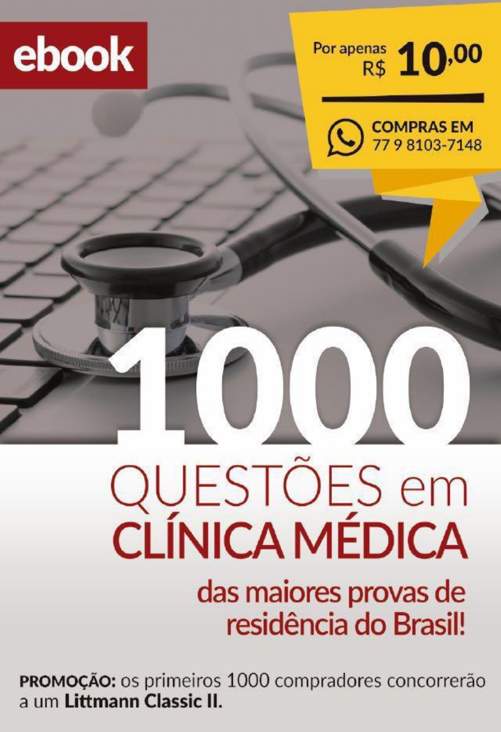 ADQUIRA TAMBÉM 1000 QUESTÕES DE ACESSO DIRETO - RESIDÊNCIAS SEÇÃO/PROVA ________________________PÁG NO PDF VALORES DE REFERÊNCIA ________________________2 UNICAMP 2016 ________________________________3 UFRJ 2016____________________________________23 UNICAMP 2015________________________________44 CEREMMG – 2011______________________________61 UNICAMP – 2012_______________________________67 UNIRIO 2011__________________________________82 UFF 2012_____________________________________94 UNIRIO 2010_________________________________114 UFRJ 2010___________________________________138 UFG 2009____________________________________153 SUS/SP 2010_________________________________176 CREMESP 2010_______________________________202 AMRIGS – 2009______________________________235 GABARITO__________________________________260 VALORES DE REFERÊNCIA UNICAMP – Prova de especialidades clínicas – Residência Médica - 2015 1) (UNICAMP 2016) Homem, 46a, procura a unidade de emergência com história de febre baixa diária (até 37,8oC) e episódios de sudorese noturna há 15 dias. Refere perda de peso nos últimos 2 meses, de 82 para 75 Kg. Exame Físico: bom estado geral, PA= 130x80 mmHg, FC = 72 bpm, palidez cutânea, linfonodos de até 1cm de diâmetro em cadeias cervicais anteriores e posteriores, e inguinais bilateralmente. Baço palpável a 2 cm do rebordo costal esquerdo. Hemograma: Hb= 10,6g/dL, leucócitos= 29.000/mm3 (segmentados= 54%, bastonetes= 12%, metamielócitos= 6%, mielócitos= 4%, promielócitos= 4%, blastos= 1%, linfócitos= 13%, eosinófilos= 3%, basófilos= 2%, monócitos= 1%), plaquetas= 567.000/mm3. A HIPÓTESE DIAGNÓSTICA E A CONDUTA SÃO: A) Leucocitose reacional, investigação de foco infeccioso B) Leucemia aguda, esfregaço e cariótipo de medula óssea C) Linfoma não Hodgkin/Leucemia linfoide crônica, biopsia de medula óssea D) Leucemia mielóide crônica, esfregaço e cariótipo de medula óssea 2) (UNICAMP 2016) Homem,42a, procura a unidade de emergência por dor abdominal progressiva há uma semana e febre há 24 horas. Antecedente: tabagismo por 10 anos (até há 25 anos) e trombose venosa profunda de membro inferior esquerdo há 5 anos, após trauma automobilístico. Exame físico: Bom estado geral, T=38,1º C, PA 110x80 mmHg, FC=106 bpm. Abdome: dor moderada à palpação profunda, mais intensa em fossa ilíaca direita, com irradiação para hipocôndrio direito. Hemograma: Hb= 13,3g/dl, leucócitos= 18.900/mm3 (bastonetes 10%, segmentados 75%, linfócitos 13%, monócitos 2%), plaquetas= 683.000/mm3. Tomografia de abdome: trombose de veia porta e massa mal delimitada em fossa ilíaca direita, com borramento da gordura adjacente ao apêndice. ESSE FENÔMENO TROMBÓTICO É SECUNDÁRIO A: A) Trombocitemia essencial B) Infecção intra-abdominal C) Policitemia Vera D) Trombofilia hereditária 3) (UNICAMP 2016) Homem 45a, procura serviço médico com queixa de dor em região cervical esquerda, com irradiação para ombro, lateral do braço e antebraço ipsilateral. Refere adormecimento em polegar esquerdo. Exame físico: força muscular grau IV à flexão do cotovelo contra resistência. A RAIZ NERVOSA AFETADA E O REFLEXO A SER PESQUISADO SÃO: A) C4; tricipital B) C5; radial C) C6; bicipital D) C7; estiloradial 4) (UNICAMP 2016) Mulher, 22a, previamente hígida, procura Unidade de Pronto Atendimento com queixa de tosse há um mês, com expectoração em moderada quantidade, de início amarelada mas que se tornou hemoptoica há uma semana, acompanhada de dor em aperto no lado esquerdo do tórax desde o início do quadro. Nega outras queixas. Exame físico: Jeferson Realce Jeferson Realce Jeferson Realce Regular estado geral, T= 37,9ºC, FC= 96 bpm, FR= 22 irpm, PA= 110 x 90mmHg, Oximetria em ar ambiente = 95%. Pulmões: roncos difusos e estertores subcrepitantes e crepitantes em campos médio e inferior esquerdo. DEPOIS DE REALIZADO O RADIOGRAMA DE TÓRAX, A CONDUTA É: A) Coletar três amostras de escarro para pesquisa de bacilo álcool-ácido resistente B) Tomografia computadorizada de tórax C) Realizar sorologia para paracoccidioidomicos D) Iniciar antibioticoterapia para cobertura de germes de flora mista 5) (UNICAMP 2016) Homem, 23a, encaminhado ao serviço de referência de AIDS, de um serviço de hemoterapia por sorologia positiva para vírus de imunodeficiência humana, sem queixas. Exame físico: sem alterações. A TERAPIA ANTIRRETROVIRAL (TARV) DEVERÁ SER PRESCRITA: A) Independente da carga viral e da contagem de linfócitos-T CD4+ B) Quando apresentar uma doença oportunista C) Quando apresentar carga viral detectável em qualquer nível D) Quando houver contagem de linfócitos-T CD4+ menor que 500 células/mL. 6) (UNICAMP 2016) Homem, 30a, realiza avaliação admissional e é encaminhado a Unidade Básica de Saúde por exame alterado (ALT =60U/L). Solicitado investigação sorológica: AgHBs: reagente, Anti-HBs: não reagente, Anti-HBc: reagente, AgHBe: não reagente, AntiHBe: reagente; sorologia Hepatite C: não reagente; sorologia Hepatite A: IgG reagente, IgM: não reagente. A HIPÓTESE DIAGNÓSTICA E CONDUTA SÃO: A) Hepatite B crônica ativa, solicitar HBV DNA quantitativo B) Hepatite B resolvida, seguimento ambulatorial C) Hepatite B crônica ativa, iniciar tenofovir ou entecavir D) Hepatite B aguda, seguimento ambulatorial. 7) (UNICAMP 2016) Homem, 21a, trabalhador rural, procura Unidade Básica de Saúde queixa de bolhas que se rompiam facilmente na face e no tronco há seis meses. Exame dermatológico: exulcerações e crostas em regiões malares e asas nasais; bolhas flácidas de conteúdo citrino e áreas de exulcerações e crosta na região esternal e no alto dorso. Sem lesões de mucosas. Sinal de Nikolski positivo. O DIAGNÓSTICO, O SUBSTRATO HISTOPATOLÓGICO E A IMUNOFLUORESCÊNCIA DIRETA SÃO: A) Pênfigo de Cazenave, bolha subepidérmica, ausência de depósito de imunoglobulinas B) Pênfigo vulgar, bolha supra-basal, depósi