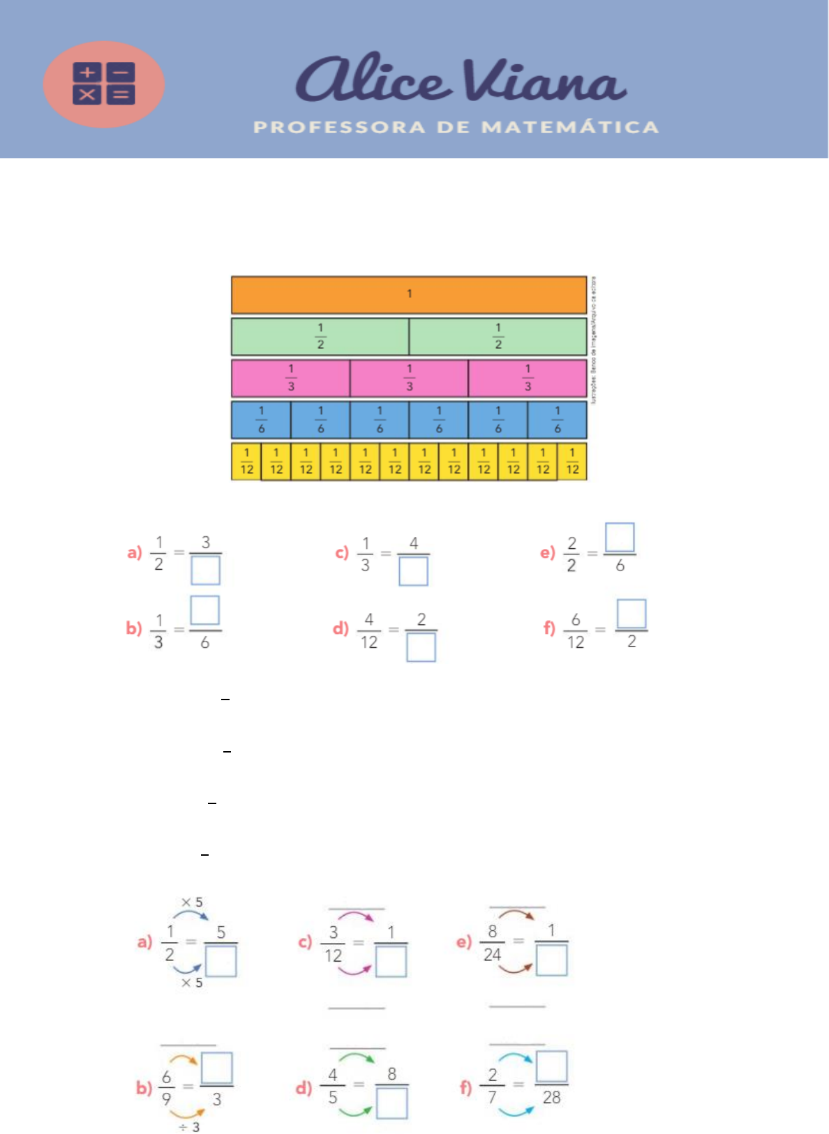 Exercício de Matemática Frações – Parte 2 1) Vamos descobrir frações equivalentes nestas figuras: Complete com frações equivalentes: 2) Calcule quanto cada um deles gastou. a) Pedro gastou 3 4 de R$36,00. ___________________________________________________ b) André gastou 6 9 de R$36,00. ___________________________________________________ c) Lígia gastou 1 2 de R$48,00. _____________________________________________________ d) Bia gastou 2 3 de R$36,00. ______________________________________________________ 3) Complete para que as frações sejam equivalentes: 4) Num quintal há 60 árvores. As mangueiras representam 4 6 das árvores, as jaqueiras, 1 6 e o restante das árvores são goiabeiras. a) Que fração representa a soma das mangueiras e das jaqueiras? _____________________________________________________________________________ b) Que fração representa as goiabeiras? _____________________________________________________________________________ c) Quantas mangueiras há? R:___________________________________________________________________________ d) Quantas jaqueiras há? R:___________________________________________________________________________ 5) Maria tem R$210,00. Gastará 3 2 do dinheiro com roupas, 7 1 CD's e guardará o restante. a) Quanto Maria gastará com roupas? R:___________________________________________________________________________ b) Quanto Maria gastará com CD’s? R:___________________________________________________________________________ c) Quanto Maria guardará após os gastos? R:___________________________________________________________________________ 6) A professora Alice ofereceu o livro Alice no País das Maravilhas a cada uma de suas afilhadas (Lara e Giovana). A Lara disse “Eu já li 1 2 do livro”. A Giovana disse “Eu li 4 8 do livro, já li mais!”. A Giovana está errada. Por quê? _____________________________________________________________________________ 7) Cada área colorida em cada círculo representa uma fração de um inteiro. Quanto vale a diferença destas frações indicada na figura? 8) Efetue as adições: a) 3 6 + 2 6 = b) 13 7 + 1 7 = c) 2 7 + 1 7 = d) 4 10 + 5 10 = e) 5 6 + 1 6 = f) 8 6 + 6 6 = 9) Efetue as subtrações: a) 7 9 - 5 9 = b) 9 5 - 2 5 = c) 2 3 – 1 3 = d) 8 3 – 2 3 = e) 5 6 – 1 6 = f) 5 5 – 2 5 = 10) Passe para a forma mista as seguintes frações: a) 5 26 b) 8 125 c) 6 47 11) Transforme as frações mistas em frações impróprias: a) 3 1 2 b) 5 3 2 c) 11 5 3 d) 7 2 4