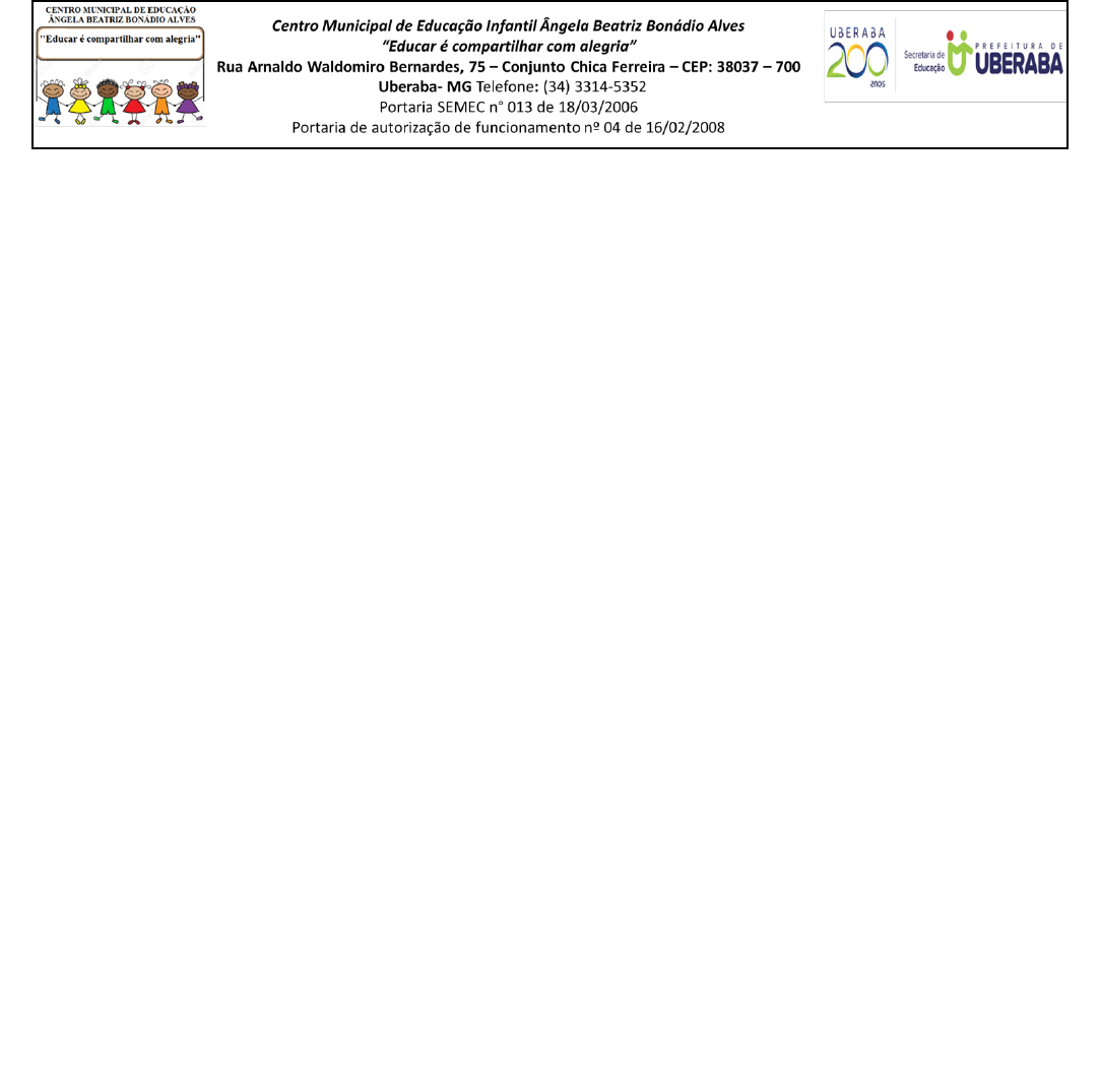 NÚMERO DA SEQUÊNCIA: 04 Centro Municipal de Educação Infantil Ângela Beatriz Bonádio Alves Grupo Etário: Crianças bem Pequenas Turma: Maternal III – C Campo de Experiência: TRAÇOS, SONS, CORES E FORMAS Professora: Andreza Silva Referências: EI02TS02URA01 - EI02TS01 O SOL RAIOU Materiais: aparelho audiovisual (celular, computador, tablete, televisão caixa de papelão, tesoura, barbante ou fitinhas coloridas, tinta ou giz de cera, objetos diversos e de cores variadas como: brinquedos, roupas, utensílios domésticos, borrachinhas de cabelo, potes plásticos. • Antes de iniciar as atividades, o adulto deverá organizar em um espaço da casa, uma caixa de papelão com alguns objetos que contenham cor, para a criança poder identificar, posteriormente. • Cantar e dançar com a criança, a música “Fazendinha” (Mundo Bita), acessando o endereço eletrônico: https://www.youtube.com/watch?v=cjONzZPJONc Fazendinha (Mundo Bita) Bom dia O Sol já nasceu lá na fazendinha Acorda o bezerro e a vaquinha Que já cocoricou dona galinha Levanta Que o cavalinho já pulou da cama https://www.google.com.br/search?sxsrf=ALeKk0295HqZbeqJcYqIRjWZcl6H-CmzBQ:1593985184785&q=Mundo+Bita&stick=H4sIAAAAAAAAAONgVuLVT9c3NEwyjy-zNDOoWMTK5Vual5Kv4JRZkggAyjvW5R4AAAA&sa=X&ved=2ahUKEwj-kd3FibfqAhXyEbkGHd1nBDAQMTAAegQIDhAF Que o pintinho tirou seu pijama E o porquinho já caiu na lama Lá na fazendinha é manhã Deixa de manhã e vem pra cá Que o Sol raiou e agora é hora de brincar Bom dia O Sol já nasceu lá na fazendinha Acorda o bezerro e a vaquinha Que já cocoricou dona galinha Levanta Que o cavalinho já pulou da cama Que o pintinho tirou seu pijama E o porquinho já caiu na lama Lá na fazendinha é manhã Deixa de manha e vem pra cá Que o Sol raiou e agora é hora de brincar Lá na fazendinha é manhã Deixa de manha e vem pra cá Que o Sol raiou e agora é hora de brincar Bom dia. Fonte: https://www.letras.mus.br/mundo-bita/fazendinha/ • Você ouviu na música que o sol raiou e acordou os animais na fazendinha, certo? • Você sabe qual a cor do sol? • Após a criança responder, levá-la ao local onde se encontra a caixa de papelão com os objetos e peça a ela para observá-los e pegar apenas os que possuem a cor do sol. • Em seguida, peça para a criança se sentar e colocar em um de seus lados, os objetos que pegou antes, mas que sejam grandes e do outro lado, os que sejam pequenos. • Em qual lado tem mais objetos? • Vamos contar quantos objetos tem do seu outro lado? • Aproveite os objetos que são possíveis de produzirem sons (potes plásticos, por exemplo) e cantem novamente a música, batendo um pote no outro, tentando acompanhar o ritmo da música. • Depois, entregue para a criança o molde do desenho do sol feito em papelão e peça a ela para pintá- lo com tinta ou colorir com giz de cera. • Quando terminar, incentive-a a alinhavar o sol (que já deverá ter os furos feitos pelo adulto antecipadamente), usando barbante ou fitinhas coloridas. Fonte: https://www.pragentemiuda.org/2012/09/sol-com-carimbo-das-maozinhas.html NÚMERO DA SEQUÊNCIA: 05 Centro Municipal de Educação Infantil Ângela Beatriz Bonádio Alves Grupo Etário: Crianças bem Pequenas Turma: Maternal III – C Campo de Experiência: ESCUTA, FALA, PENSAMENTO E IMAGINAÇÃO Professora: Andreza Silva Referências: EI02EF01URA01; EI02EF01URA02 CONHECENDO OS ANIMAIS DA FAZENDA Materiais: Materiais: aparelho audiovisual (celular, computador, tablete, televisão), caixa de sapato, animais em miniatura ou imagens de animais (de preferência os citados na canção, podendo acrescentar outros). • Assistir ao vídeo da música “Fazendinha” (Mundo Bita), acessando o endereço eletrônico: https://www.youtube.com/watch?v=cjONzZPJONc. Fazendinha (Mundo Bita) https://www.google.com.br/search?sxsrf=ALeKk0295HqZbeqJcYqIRjWZcl6H-CmzBQ:1593985184785&q=Mundo+Bita&stick=H4sIAAAAAAAAAONgVuLVT9c3NEwyjy-zNDOoWMTK5Vual5Kv4JRZkggAyjvW5R4AAAA&sa=X&ved=2ahUKEwj-kd3FibfqAhXyEbkGHd1nBDAQMTAAegQIDhAF Bom dia O Sol já nasceu lá na fazendinha Acorda o bezerro e a vaquinha Que já cocoricou dona galinha Levanta Que o cavalinho já pulou da cama Que o pintinho tirou seu pijama E o porquinho já caiu na lama Lá na fazendinha é manhã Deixa de manha e vem pra cá Que o Sol raiou e agora é hora de brincar Bom dia O Sol já nasceu lá na fazendinha Acorda o bezerro e a vaquinha Que já cocoricou dona galinha Levanta Que o cavalinho já pulou da cama Que o pintinho tirou seu pijama E o porquinho já caiu na lama Lá na fazendinha é manhã Deixa de manha e vem pra cá Que o Sol raiou e agora é hora de brincar Lá na fazendinha é manhã Deixa de manha e vem pra cá Que o Sol raiou e agora é hora de brincar Bom dia. Fonte: https://www.letras.mus.br/mundo-bita/fazendinha/ • Perguntar para a criança: O que nasceu na fazendinha que acordou o bezerro e a vaquinha? • Como a galinha faz? • Quais os outros animais que tem na fazenda? • Qual animal pulou da cama? • O que que o pintinho tirou? • Qual animal caiu na lama? • Levar vários animaizinhos em miniatura, numa caixa surpresa. • Deixar a criança manusear a caixa, balançar para ouvir o barulho e colocar a mão para sentir através do tato, o que tem dentro. • Depois pedir para que retire os animaizinhos, um a um, observá-los e citar o nome dele. • Em seguida, cantar uma música referente ao animal. Por exemplo: pato – música: “lá vem o pato, pato aqui, pato acolá...”. O adulto poderá auxiliar a criança na escolha da música e deverá cantar com ela. Fonte: https://professoraivaniferreira.blogspot.com/2012/09/emeiconceicao-de-itagua.html https://professoraivaniferreira.blogspot.com/2012/09/emeiconceicao-de-itagua.html NÚMERO DA SEQUÊNCIA: 06 Centro Municipal de Educação Infantil Ângela Beatriz Bonádio Alves Grupo Etário: Crianças bem Pequenas Turma: Maternal III – C Campo de Experiência: ESPAÇOS, TEMPOS, QUANTIDADES, RELAÇÕE