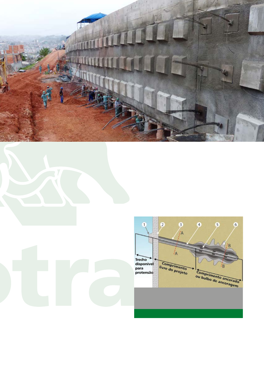 23www.solotrat.com.br Índice 1. Definição 2. Norma 3. Objetivo 4. Documentos de obra 5. Definições 6. Equipamentos, acessórios e ferramentas 7. Equipe de trabalho 8. Sequência executiva 9. Avaliação de desempenho do tirante 10. Verificação e manutenção de cortinas atirantadas 11. Modelo de boletim de execução 12. Guia resumido para dimensionamento e ensaio de tirantes 1. definição Tirante é uma peça composta por um ou mais elementos resistentes à tração, montada segundo especificações do projeto. Estes elementos são introduzidos no terreno em perfuração previamente executada. Logo após é feita injeção de calda de cimento ou de outro aglutinante na parte inferior destes elementos, formando o bulbo de ancoragem, que é ligado à parede estrutural, pelo trecho não injetado do elemento resistente à tração e pela cabeça do tirante (Figura 1). 2. norma NBR 5629 (Abril/2006) – Execução de Tirantes Ancorados no Terreno. Tirantes 1 Cabeça do tirante / 2 Estrutura de reação / 3 Perfuração do terreno / 4 Bainha coletiva / 5 Aço, fibra etc. / 6 Bulbo de ancoragem Figura 1 - Partes constitutivas do Tirante TiranTeS TiranTeS 24 25Solotrat Engenharia Geotécnica Eireli www.solotrat.com.br 3. objeTivo Este documento: • Estabelece diretrizes e condicionantes para executar, verificar e avaliar tirantes ancorados em solos ou em rochas, que suportem cargas de tração tanto provisórias quanto permanentes. • Descreve e fixa equipamentos, ferramentas e acessórios mínimos necessários para executar os serviços. • Especifica equipe mínima para executar os trabalhos, definindo tarefas e responsabilidades. • Especifica materiais suficientes para realizar a obra. 4. documenToS de obra Os documentos mencionados abaixo devem estar disponíveis na obra. • Projeto dos tirantes, com cargas de trabalho, de cravação e de ensaio. • Locação dos tirantes. • Ângulos. • Comprimento livre acrescido do trecho disponível para protensão, e comprimento ancorado. • Desenho e relatório de sondagens do solo. • Boletim de controle diário de execução dos tirantes. • Boletim de controle de protensão. • Certificado de aferição do conjunto: macaco, bomba e manômetro. 5. definiçõeS São aplicáveis as definições constantes na NBR 5629 e as definições seguintes, que estão mostradas nas Figuras 2 e 3. 5.1 bainha coletiva Tubo não degradável de isolamento coletivo, de contato com o terreno, utilizado na proteção conjunta de todos os elementos de tração. 5.2 bainha individual (espaguete) Tubo não degradável de isolamento individual, que serve de proteção para cada elemento de tração. 5.3 boletim de execução do tirante Documento a ser preenchido para todos os tirantes, onde constam dados de montagem, perfuração, injeção e protensão dos tirantes, conforme mostra a Figura 5. Deve registrar no mínimo os seguintes dados de execução dos tirantes: • identificação da obra e da data. • identificação do tirante. • capacidade de carga. • característica da armação. • comprimento da armação. • consumo de calda de cimento, incluindo pressão de injeção e todas as fases de injeção. • observações adicionais referentes às ocorrências relevantes durante a execução do serviço. • nome e assinatura do executor. 5.4 bomba de perfuração Equipamento capacitado a fornecer energia ao fluído de perfuração. 5.5 bomba injetora Equipamento receptor da calda de injeção do misturador, que forneça energia suficiente para a condução da calda pressurizada até o trecho de ancoragem, passando pelo comando de injeção, conforme mostrado na Figura 3. 5.6 cabeça de perfuração – cabeça d’água Acessório instalado na extremidade superior da haste ou do tubo de perfuração, ligado à bomba de fluído de perfuração, que permite o fluxo do fluído de perfuração simultaneamente à rotação, percussão ou rotopercussão da haste. 5.7 cabeça do tirante Dispositivo que transfere a carga do tirante para a estrutura a ser ancorada. Figura 2 - Características básicas de alguns tipos de Tirantes. TiranTeS TiranTeS 26 27Solotrat Engenharia Geotécnica Eireli www.solotrat.com.br Ele é constituído por placas de apoio planas, cunhas de inclinação, dispositivos de fixação dos elementos tracionados etc. 5.8 calda de injeção Aglutinante, resultado da mistura de água e cimento comum em misturador de alta turbulência, mantido na forma coloidal para ser injetado. Normalmente esta mistura se dá por valores entre 0,5 e 0,7 da relação entre o peso da água e o do cimento. 5.9 comando de injeção Conjunto com dois registros rápidos e um pulmão estabilizador de pressão, localizado entre a bomba e a coluna de injeção, que permite a operação e o controle de injeção. 5.10 bainha Calda de cimento, aplicada sob pressão (não gravitacional), recompõe o espaço do solo escavado na perfuração, ou originado da diferença entre o volume ocupado pelo tirante e pelo volume do furo. 5.11 elemento de tração Parte estrutural do tirante que trabalha sempre à tração, usualmente é composto por um ou mais fios, por cordoalhas ou por barras de aço. 5.12 fase de injeção Injeção da calda de cimento sob pressão, executada em todo grupo de válvulas. 5.13 ferramenta de corte Elemento metálico dotado de metais cortantes, específicos para cada tipo de terreno, tais como vídeas, diamantes etc. 5.14 fluído estabilizante Lama de argila, ou de outros materiais, que estabilize provisoriamente a perfuração, até a introdução dos elementos de tração. 5.15 fluído de perfuração Elemento utilizado para lubrificar e conduzir o material escavado para fora do furo. Pode ser água limpa, lama, fluído estabilizante, ar comprimido etc. 5.16 injeção Operação para fixar a armação de tração no terreno, resultante da introdução sob pressão de um aglutinante, usualmente calda de cimento. 5.17 misturador e agitad