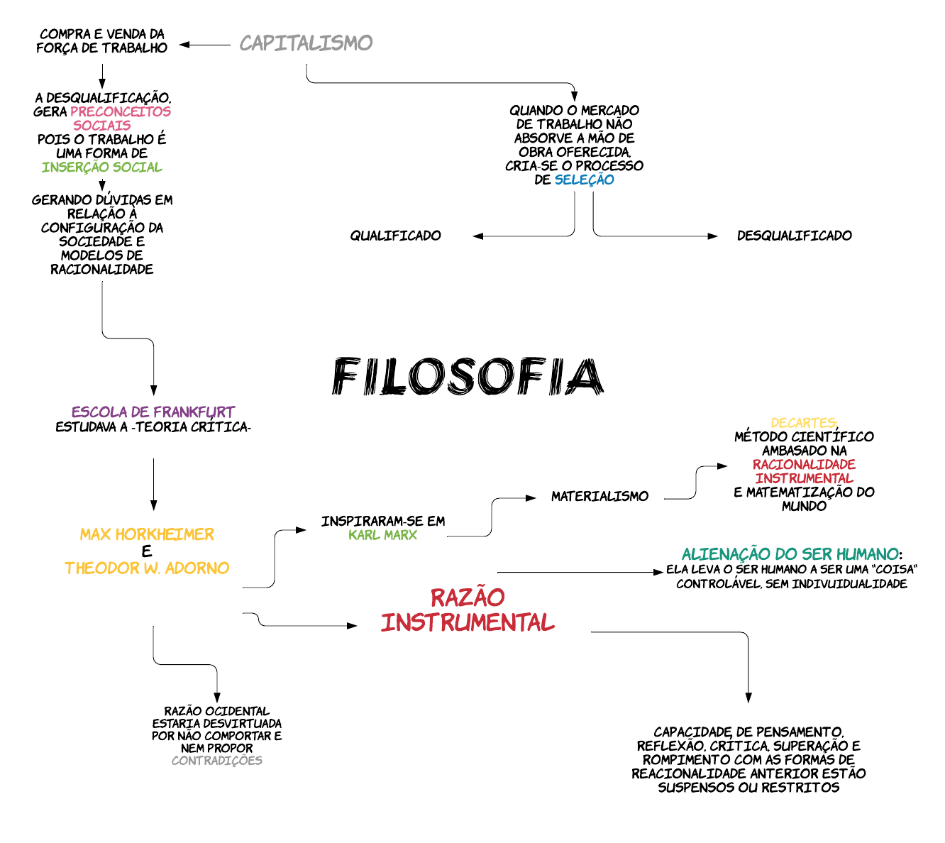 RAZÃO I NSTRUMENTAL ALI ENAÇÃO DO SER HUMANO: el a l eva o ser hu mano a ser u ma "co i sa" co nt r o l ável , sem i ndi vu i du al i dade MAX HORKHEI MER E t HEODOR w . ado RNO RAZÃO OCI DENTAL ESTARI A DESVI RTUADA POR NÃO COMPORTAR E NEM PROPOR CONTRADI ÇÕES capac i dade de pensament o , r e f l ex ão , c r í t i ca, su per ação e r o mpi ment o co m as f o r mas de r eac i o nal i dade ant er i o r es t ão su spenso s o u r es t r i t o s I NSPI RARAM-SE EM KARL MARX MATERI ALI SMO DECARTES: MÉTODO CI ENTÍ FI CO AMBASADO NA RACI ONALI DADE I NSTRUMENTAL E MATEMATI ZAÇÃO DO MUNDO ESCOLA DE FRANKFURT ESTUDAVA A -TEORI A CRÍ TI CA- CAPI TALI SMO COMPRA E VENDA DA FORÇA DE TRABALHO QUANDO O MERCADO DE TRABALHO NÃO ABSORVE A MÃO DE OBRA OFERECI DA, CRI A-SE O PROCESSO DE SELEÇÃO QUALI FI CADO DESQUALI FI CADO A DESQUALI FI CAÇÃO, GERA PRECONCEI TOS SOCI AI S POI S O TRABALHO É UMA FORMA DE I NSERÇÃO SOCI AL GERANDO DÚVI DAS EM RELAÇÃO À CONFI GURAÇÃO DA SOCI EDADE E MODELOS DE RACI ONALI DADE FILOSOFIA Mapa mental- trabalho e razão instrumental mapa mental - trabalho e razão instrumental