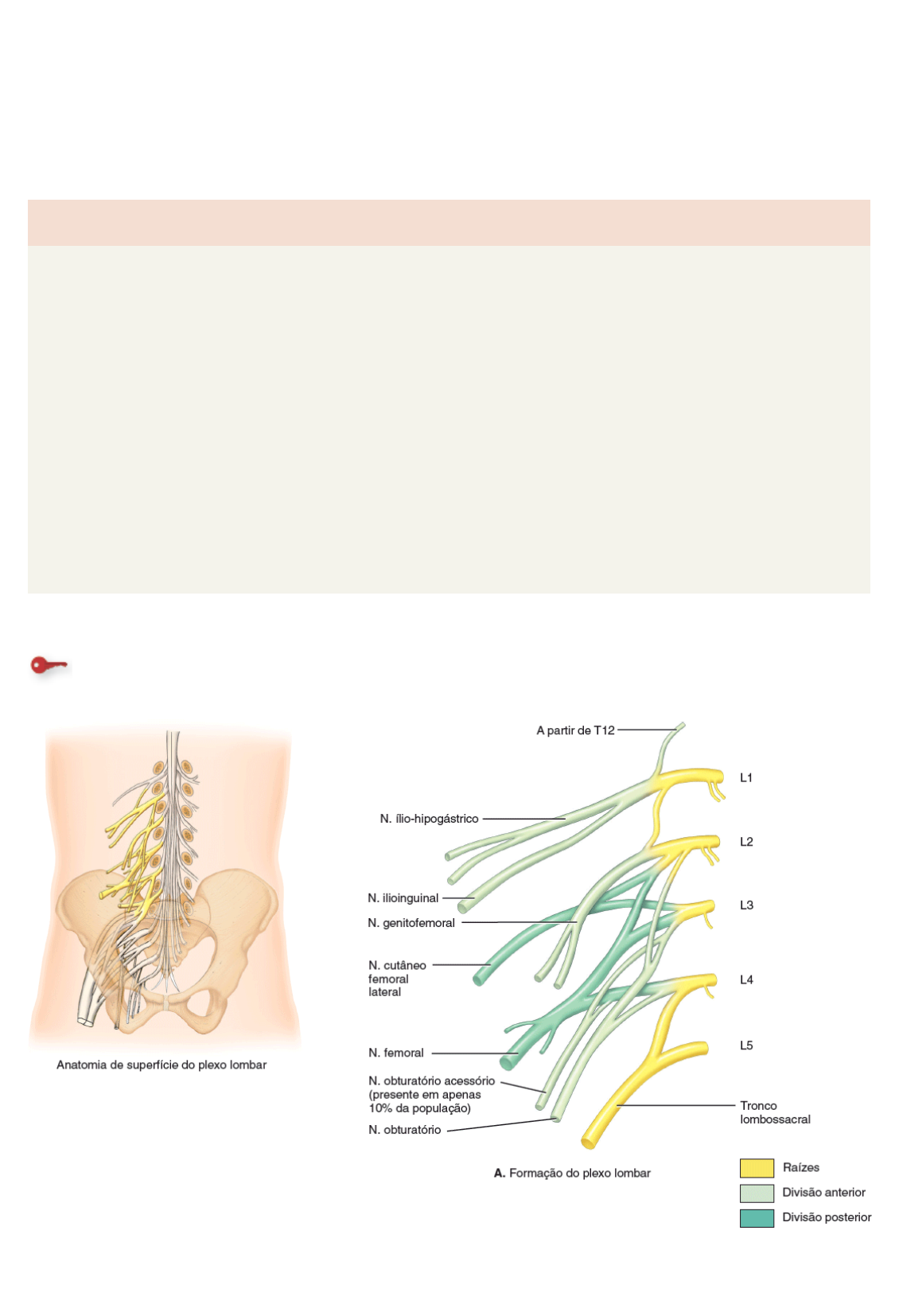• Descrever a origem e a distribuição do plexo lombar. As raízes (ramos anteriores) dos nervos espinais L1 a L4 formam o plexo lombar (Figura 13.9). Ao contrário do plexo braquial, existem poucas interconexões entre as fibras do plexo lombar. De cada lado das quatro primeiras vértebras lombares, o plexo lombar se projeta obliquamente para fora, entre as cabeças superficial e profunda1 do músculo psoas maior e anteriormente ao músculo quadrado do lombo. Entre as cabeças do músculo psoas maior, as raízes dos plexos lombares se separam em divisões anterior e posterior, as quais dão origem aos ramos periféricos dos plexos. O plexo lombar supre a parede abdominal anterolateral, os órgãos genitais externos, e parte dos membros inferiores. NERVO ORIGEM DISTRIBUIÇÃO Ílio-hipogástrico L1 Músculos da parede abdominal anterolateral; pele do abdome inferior e das nádegas Ilioinguinal L1 Músculos da parede abdominal anterolateral; pele das faces superior e medial da coxa, da raiz do pênis e do escroto em homens, e dos lábios maiores do pudendo e do monte do púbis em mulheres Genitofemoral L1–L2 Músculo cremaster; pele da face anteromedial da coxa, do escroto em homens e dos lábios maiores do pudendo em mulheres Cutâneo femoral lateral L2–L3 Pele das faces lateral, anterior e posterior da coxa Femoral L2–L4 Maior nervo que se origina do plexo lombar; inerva os músculos exores do quadril e os extensores do joelho, a pele das faces anterior e medial da coxa e da face medial da perna e do pé Obturatório L2–L4 Músculos adutores do quadril; pele da face medial da coxa Figura 13.9 Vista anterior do plexo lombar. O plexo lombar supre a parede abdominal anterolateral, os órgãos genitais externos e parte dos membros inferiores. 7. • Quais são os sintomas de uma lesão do nervo femoral? CORRELAÇÃO CLÍNICA | Lesões do plexo lombar O maior nervo que se origina do plexo lombar é o nervo femoral. Lesões do nervo femoral, que podem ser secundárias a ferimentos por arma branca ou por arma de fogo, são caracterizadas pela incapacidade de estender a perna e pela perda de sensibilidade na pele da parte anteromedial da coxa. Lesões do nervo obturatório causam paralisia dos músculos adutores da coxa e perda de sensibilidade da face medial da coxa. Elas podem ser secundárias à compressão pela cabeça do feto sobre o nervo durante a gestação. TESTE RÁPIDO Qual é o maior nervo que se origina do plexo lombar? EXPO 13.D Plexos sacral e coccígeo (Figura 13.10) OBJETIVO Descrever a origem e a distribuição dos plexos sacral e coccígeo. As raízes (ramos anteriores) dos nervos espinais L4–L5 e S1–S4 formam o plexo sacral (Figura 13.10). Este plexo está 8. situado, em sua maior parte, anteriormente ao sacro. O plexo sacral inerva as regiões glúteas, o períneo e os membros inferiores. O maior nervo do corpo – o nervo isquiático – se origina deste plexo. As raízes (ramos anteriores) dos nervos espinais S4–S5 e os nervos coccígeos formam um pequeno plexo coccígeo. Deste plexo se originam os nervos anococcígeos (Figura 13.10A), que suprem uma diminuta área cutânea sobre o cóccix. TESTE RÁPIDO A lesão de que nervo causa pé caído? CORRELAÇÃO CLÍNICA | Lesões do nervo isquiático A forma mais comum de dor lombar é causada por compressão ou irritação do nervo isquiático, o nervo mais longo do corpo humano. O nervo isquiático, na verdade, é composto por dois nervos – tibial e bular comum – unidos por uma bainha comum de tecido conjuntivo. Estes nervos se dividem na altura do joelho. Lesões do nervo isquiático causam lombociatalgia, dor que pode iniciar-se na nádega e se irradiar para as faces posterior e lateral da perna e para a face lateral do pé. O nervo isquiático pode ser lesado por vários fatores: hérnia de disco, luxação do quadril, osteoartrite da coluna lombossacral, encurtamento patológico dos músculos rotadores laterais da coxa (especialmente o piriforme), pressão exercida pelo útero durante a gestação, in amação, irritação ou administração inadequada de injeção intramuscular glútea. Além disso, sentar em uma mala ou em outro objeto por grandes períodos podem comprimir o nervo e induzir dor. Em várias lesões do nervo isquiático, a porção bular comum é a mais afetada, frequentemente devido a fraturas da fíbula ou à compressão da coxa ou da perna por talas. Lesões do nervo bular comum fazem com que o pé permaneça em exão plantar, condição chamada de pé caído, e em inversão, condição conhecida como equinovaro. Também ocorre perda da sensibilidade ao longo da face anterolateral da perna e da face dorsal do pé e dos dedos dos pés. Lesões da parte tibial do nervo isquiático causam dorsi exão e eversão permanentes do pé, condição esta chamada de calcaneovalgo. Também ocorre perda de sensibilidade na planta do pé. O tratamento da lombociatalgia é semelhante ao da hérnia de disco – repouso, analgesia, aplicação local de gelo ou calor, e sioterapia. NERVO ORIGEM DISTRIBUIÇÃO Glúteo superior L4–L5 e S1 Músculos glúteo mínimo, glúteo médio e tensor da fáscia lata. Glúteo inferior L5–S2 Músculo glúteo máximo. Nervo para o músculo piriforme S1–S2 Músculo piriforme. Nervo para o músculo quadrado femoral e para o músculo gêmeo inferior L4–L5 e S1 Músculos quadrado femoral e gêmeo inferior. Nervo para o músculo obturador interno e para o músculo gêmeo superior L5–S2 Músculos obturador interno e gêmeo superior. Cutâneo perfurante S2–S3 Pele sobre a face medial inferior da região glútea. Cutâneo femoral posterior S1–S3 Pele do canal anal, da face lateral inferior da região glútea, da face posterior superior da coxa, da parte superior da panturrilha, do escroto em homens, e dos lábios menores do pudendo em mulheres. Pudendo S2–S4 Músculos do períneo; pele do pênis e do escroto em homens; e clitóris, lábios maiores do pudendo