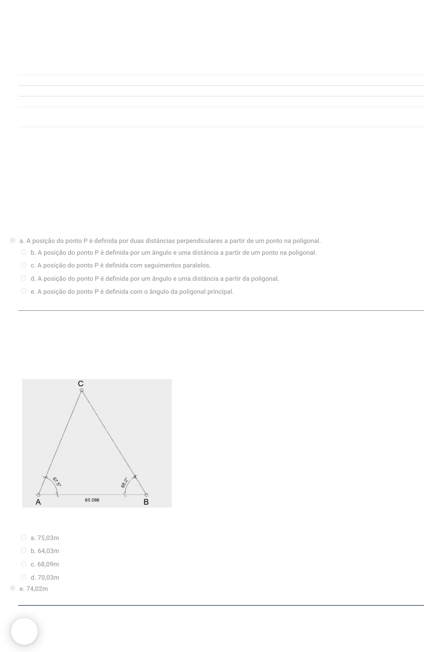 Página inicial / Cursos / Faculdade / 20202E / 20202E - DISCIPLINAS REGULARES / ENIAC_20202E_952 / Materiais de Estudo / Unidade 4 - Exercícios de �xação Iniciado em domingo, 16 ago 2020, 21:37 Estado Finalizada Concluída em domingo, 16 ago 2020, 21:55 Tempo empregado 18 minutos 23 segundos Avaliar 10,00 de um máximo de 10,00(100%) Questão 1 Correto Atingiu 1,00 de 1,00 Questão 2 Correto Atingiu 1,00 de 1,00 No método secundário de coordenadas retangulares, a posição do ponto em observação (P) é de�nida como? Escolha uma: a. A posição do ponto P é de�nida por duas distâncias perpendiculares a partir de um ponto na poligonal. b. A posição do ponto P é de�nida por um ângulo e uma distância a partir de um ponto na poligonal. c. A posição do ponto P é de�nida com seguimentos paralelos. d. A posição do ponto P é de�nida por um ângulo e uma distância a partir da poligonal. e. A posição do ponto P é de�nida com o ângulo da poligonal principal. Qual é a distância BC? Escolha uma: a. 75,03m b. 64,03m c. 68,09m d. 70,03m e. 74,02m https://portalacademico.eniac.edu.br/ https://portalacademico.eniac.edu.br/course/index.php https://portalacademico.eniac.edu.br/course/index.php?categoryid=28 https://portalacademico.eniac.edu.br/course/index.php?categoryid=73 https://portalacademico.eniac.edu.br/course/index.php?categoryid=85 https://portalacademico.eniac.edu.br/course/view.php?id=7487 https://portalacademico.eniac.edu.br/course/view.php?id=7487#section-1 https://portalacademico.eniac.edu.br/mod/quiz/view.php?id=185698 Questão 3 Correto Atingiu 1,00 de 1,00 Questão 4 Correto Atingiu 1,00 de 1,00 Qual é a distância AC? Escolha uma: a. 78,09m b. 65,09m c. 70,67m d. 68,09m e. 62,13m Dados a distância AC, BC e AB, e considerando os métodos de interseção de lados e de distâncias e suas respectivas fórmulas, qual é, aproximadamente, o ângulo A? Escolha uma: a. A = 76,6° b. A = 88° c. A = 78,5° d. A = 75,8° e. A = 76° Questão 5 Correto Atingiu 1,00 de 1,00 Questão 6 Correto Atingiu 1,00 de 1,00 Os métodos secundários são utilizados normalmente para quê? Escolha uma: a. Os métodos secundários normalmente são utilizados para levantar a poligonal principal. b. Os métodos secundários normalmente são utilizados para medir ângulos em campo. c. Os métodos secundários normalmente são utilizados para determinar o norte verdadeiro do levantamento. d. Os métodos secundários são normalmente utilizados para implantação de pontos de apoio para o levantamento topográ�co e. Os métodos secundários normalmente são utilizados para levantar aspectos naturais e arti�ciais "amarrando" as informações à poligonal principal. Quais são os tipos de métodos secundários utilizados? Escolha uma: a. Coordenadas retangulares e interseção. b. Caminhamento e triangulação. c. Interseção e irradiação. d. Triangulação e irradiação. e. Irradiação e coordenadas retangulares. Questão 7 Correto Atingiu 1,00 de 1,00 Questão 8 Correto Atingiu 1,00 de 1,00 Dados a distância A-B e os ângulos formados com o ponto inacessível C, e considerando os métodos de interseção de lados e de distâncias e suas respectivas fórmulas, qual é o ângulo entre os dois seguimentos AC e BC? Escolha uma: a. 144,3° b. 55,3° c. 54,3° d. 24,3° e. 60,3° Como é determinada a posição dos pontos na irradiação? Escolha uma: a. A posição dos pontos irradiados é determinada por um ângulo e uma distância a partir de um ponto da poligonal principal. b. A posição dos pontos irradiados é de�nida por um conjunto de ângulos e retas. c. A posição dos pontos irradiados é de�nida pelas interseções sucessivas ou encadeadas, em que se mede uma única distância e todos os ângulos dos triângulos formados. d. A posição dos pontos irradiados é de�nida pela medição de ângulos e distâncias, resultando em uma sucessão de alinhamentos. e. A posição dos pontos irradiados é de�nida pela interseção de ângulos ou de distâncias. Questão 9 Correto Atingiu 1,00 de 1,00 Questão 10 Correto Atingiu 1,00 de 1,00 Qual é o método utilizado no levantamento topográ�co para implantação de pontos de apoio? Escolha uma: a. Método de coordenadas retangulares b. Método auxiliar c. Métodos principais d. Método de irradiação e. Método secundário Dados a distância AC e BC e o ângulo no ponto A, e considerando os métodos de interseção de lados e de distâncias e suas respectivas fórmulas, qual é o distância AB? Escolha uma: a. AB = 80m b. AB = 70m c. AB = 60m d. AB = 90m e. AB = 75m ◄ Aula 08 - Aula Gravada Seguir para... Modelo padrao de entrega portfólio ► https://portalacademico.eniac.edu.br/mod/url/view.php?id=185697&forceview=1 https://portalacademico.eniac.edu.br/mod/resource/view.php?id=185699&forceview=1