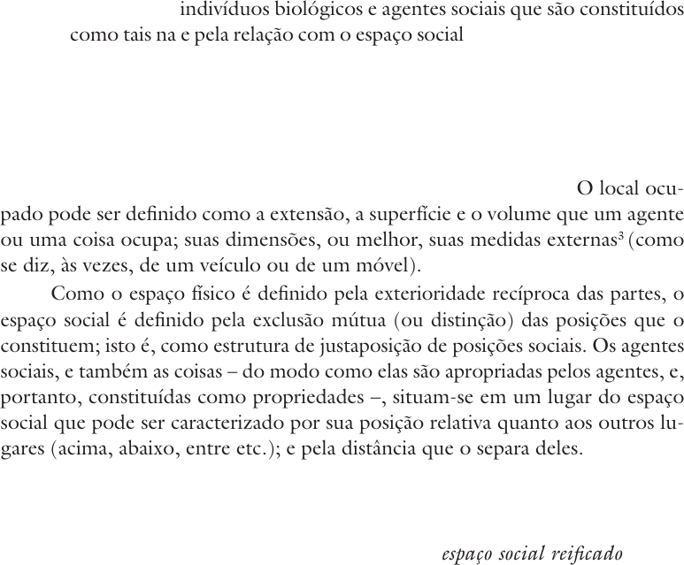 estudos avançados 27 (79), 2013 133 sociologia deve atentar para o fato de que os seres humanos são, simul- taneamente, indivíduos biológicos e agentes sociais que são constituídos como tais na e pela relação com o espaço social, ou melhor, com campos. Enquanto corpos e indivíduos biológicos, eles estão, assim como as coisas, situa- dos em um lugar (eles não são dotados da ubiquidade física que lhes permitiria estar em vários lugares ao mesmo tempo), e ocupam um local.2 O lugar, topos, pode ser definido absolutamente como o sítio em que um agente ou uma coisa se situam, “têm lugar”, existem, enfim, como localização; ou, relativamente, relacionalmente, como posição, escalão no interior de uma ordem. O local ocu- pado pode ser definido como a extensão, a superfície e o volume que um agente ou uma coisa ocupa; suas dimensões, ou melhor, suas medidas externas3 (como se diz, às vezes, de um veículo ou de um móvel). Como o espaço físico é definido pela exterioridade recíproca das partes, o espaço social é definido pela exclusão mútua (ou distinção) das posições que o constituem; isto é, como estrutura de justaposição de posições sociais. Os agentes sociais, e também as coisas – do modo como elas são apropriadas pelos agentes, e, portanto, constituídas como propriedades –, situam-se em um lugar do espaço social que pode ser caracterizado por sua posição relativa quanto aos outros lu- gares (acima, abaixo, entre etc.); e pela distância que o separa deles. Com efeito, o espaço social tende a se retraduzir, de maneira mais ou menos rigorosa, no espaço físico sob a forma de um determinado arranjo distri- butivo dos agentes e das propriedades. Consequentemente, todas as distinções propostas em relação ao espaço físico residem no espaço social reificado (ou, o que dá no mesmo, no espaço físico apropriado), que é definido – para falar como Leibniz – pela correspondência entre uma determinada ordem de coexistência dos agentes e uma determinada ordem de coexistência das propriedades.4 Cada agente se caracteriza pelo lugar em que está situado de maneira mais ou menos perma- nente: o domicílio (aquele do qual se diz que é “sem eira nem beira”5 ou “sem domicílio fixo” não tem – quase – existência social); e ele se caracteriza pela po- sição relativa que suas localizações temporárias (por exemplo os locais de honra, posicionamentos regrados pelo protocolo) e, sobretudo, permanentes (ende- reço privado e endereço profissional) ocupam em relação às localizações dos outros agentes. Ele caracteriza-se também pela posição que ocupa (juridicamen- te) no espaço, através de suas propriedades (casas, apartamentos ou escritórios, Espaço físico, espaço social e espaço físico apropriado1 Pierre Bourdieu A Ana Maria Realce Ana Maria Realce Ana Maria Realce Ana Maria Realce estudos avançados 27 (79), 2013134 terras para cultivar, explorar ou construir etc.), que são mais ou menos espaçosas ou, como se diz às vezes, “space consuming” (a ostentação do espaço apropriado sendo uma das formas por excelência da ostentação do poder). Consequente- mente, o lugar e o local ocupados por um agente no espaço físico apropriado constituem excelentes indicadores de sua posição no espaço social. É preciso notar, de passagem, que uma parte da inércia das estruturas constitutivas do es- paço social resulta do fato de que elas estão inscritas no espaço físico, e só podem ser modificadas à custa de um trabalho de transplantação, de uma mudança das coisas, e de um desenraizamento ou de uma deportação das pessoas – operações necessariamente custosas. A estrutura do espaço social se manifesta assim, nos mais diversos contex- tos, sob a forma de oposições espaciais, o espaço habitado (ou apropriado) fun- cionando como uma espécie de metáfora espontânea do espaço social. Em uma sociedade hierarquizada, não existe espaço que não seja hierarquizado e que não exprima as hierarquias e as diferenças sociais de um modo deformado (mais ou menos) e, sobretudo, mascarado pelo efeito de naturalização acarretado pela inscrição durável das realidades sociais no mundo físico: diferenças produzidas pela lógica social podem, assim, parecer emergidas da natureza das coisas (basta pensar na ideia de “fronteira natural”). Assim, a divisão em duas partes do espaço interno da casa kabyle – por mim já analisada detalhadamente6 – constitui, sem dúvida, o paradigma de todas as di- visões em lugares separados (na igreja, na escola, nos lugares públicos e na pró- pria casa) nas quais se retraduzia e ainda se retraduz, embora de modo cada vez mais discreto, a estrutura da divisão do trabalho entre os sexos. Mas, da mesma forma, poderíamos analisar a estrutura do espaço escolar, que, em suas diversas variantes, tende sempre a marcar o local eminente do professor (a cátedra); ou a estrutura do espaço urbano: assim, por exemplo, o espaço parisiense apresenta, além da retradução principal das diferenças econômicas e culturais na distribui- ção espacial das habitações entre os bairros centrais e os bairros periféricos e os subúrbios, uma oposição secundária, mas bem marcada, entre a “margem direi- ta” e a “margem esquerda”, a qual corresponde à divisão fundamental do campo do poder entre, grosso modo, a arte e os negócios. Vê-se aí o exemplo de uma divisão social objetivada no espaço físico, que, como já apontei alhures, funciona simultaneamente como princípio de visão e de divisão, como categoria de percepção e de apreciação; em suma, como estrutura mental (a casa kabyle foi outro exemplo disso). E pode-se pensar que estruturas do espaço físico apropriado constituem uma das mediações através das quais as estruturas sociais se convertem em sistemas de preferências e em estruturas men- tais. Mais precisamente, a inscrição imperceptív