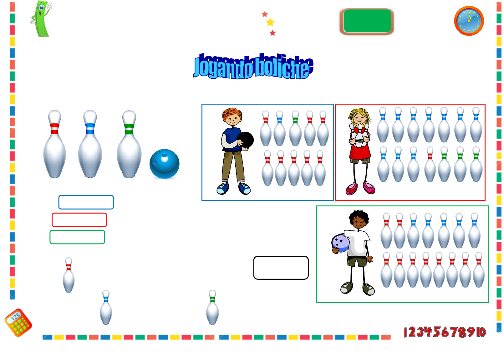 SECRETARIA MUNICIPAL DE EDUCAÇÃO Trabalhando com Matemática 4º ANO Nome: ___________________________________________________________ Data: ____/ ____/ ____. DUQUE DE CAXIAS - 2011 26 VINTE E SEIS Em um jogo de boliche, cada pino tem um valor em pontos. O pino vermelho vale 100 pontos, o pino azul vale 10 pontos e o verde vale 1. Veja quantos pinos cada criança derrubou e quantos pontos conseguiram: 100 10 1 M A R IA W IL L IA M V IT O R Quantos pontos cada criança conseguiu? William Maria Vitor Quantos pontos a criança vencedora fez a mais do que a que ficou em 2º lugar? Um pino vale o mesmo que: ______ pinos ou _______ pinos W W W .c an st o ck p h o to .c o m .b r
