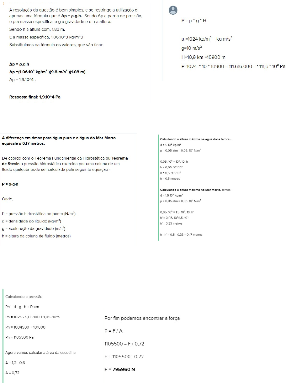 Capítulo 14 Questões: 8, 9, 10, 11, 16, 24, 28, 29, 30, 33, 34, 56, 63 Seção 14-4: Fluidos em Repouso Nº 8 nº 9 mudar para atm Nº 10 11 16 24 a) Seção 14-6: O Princípio de Pascal 28 a) b) b) 20000/π.26,5² = f/π.1,9² 2000/702,25 = f/3,61 f ≈ 102,8 N 29) Seção 14-7: O Princípio de Arquimedes 30) 33) 34) Seção 14-10: A equação de Bernoulli 56) 63)